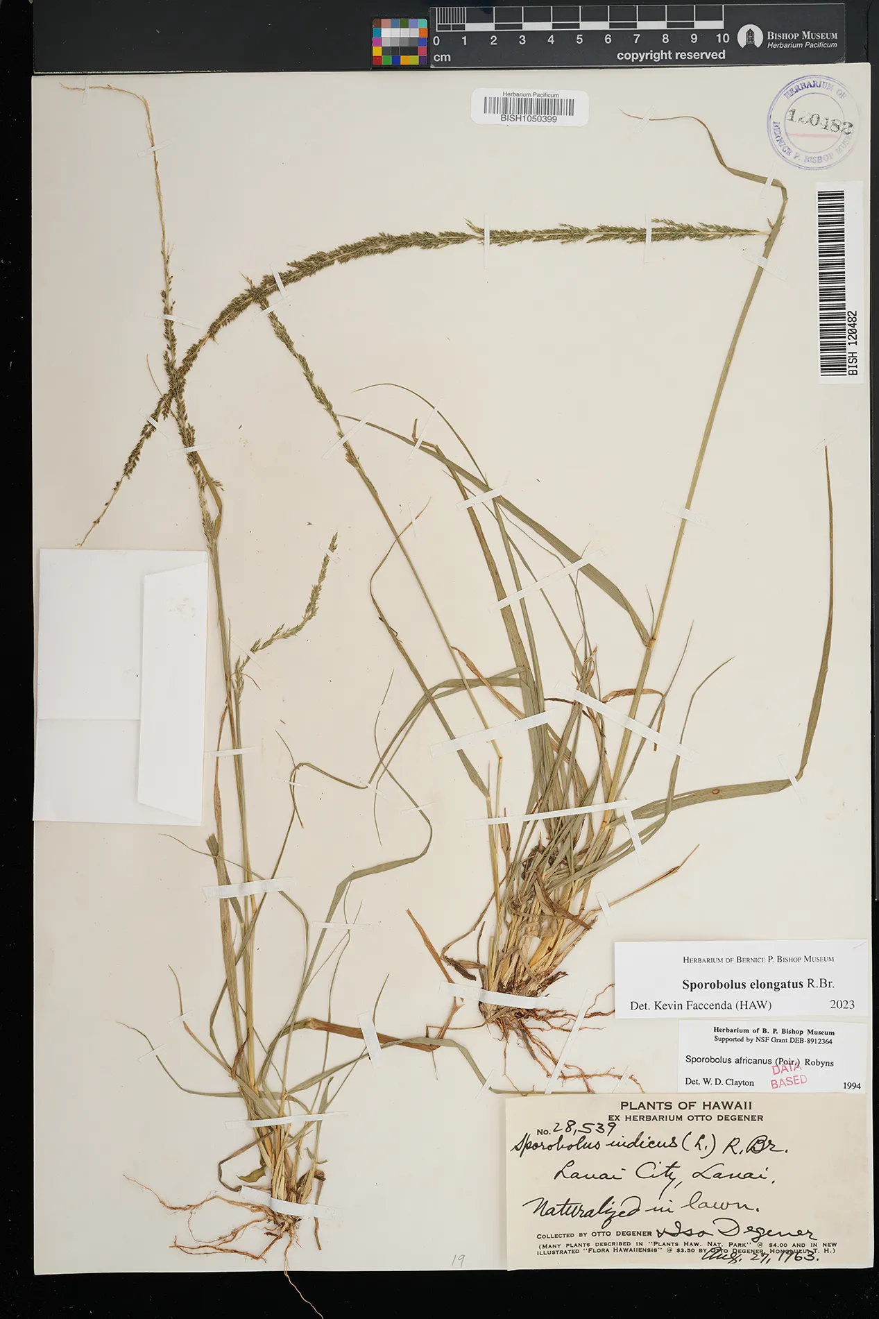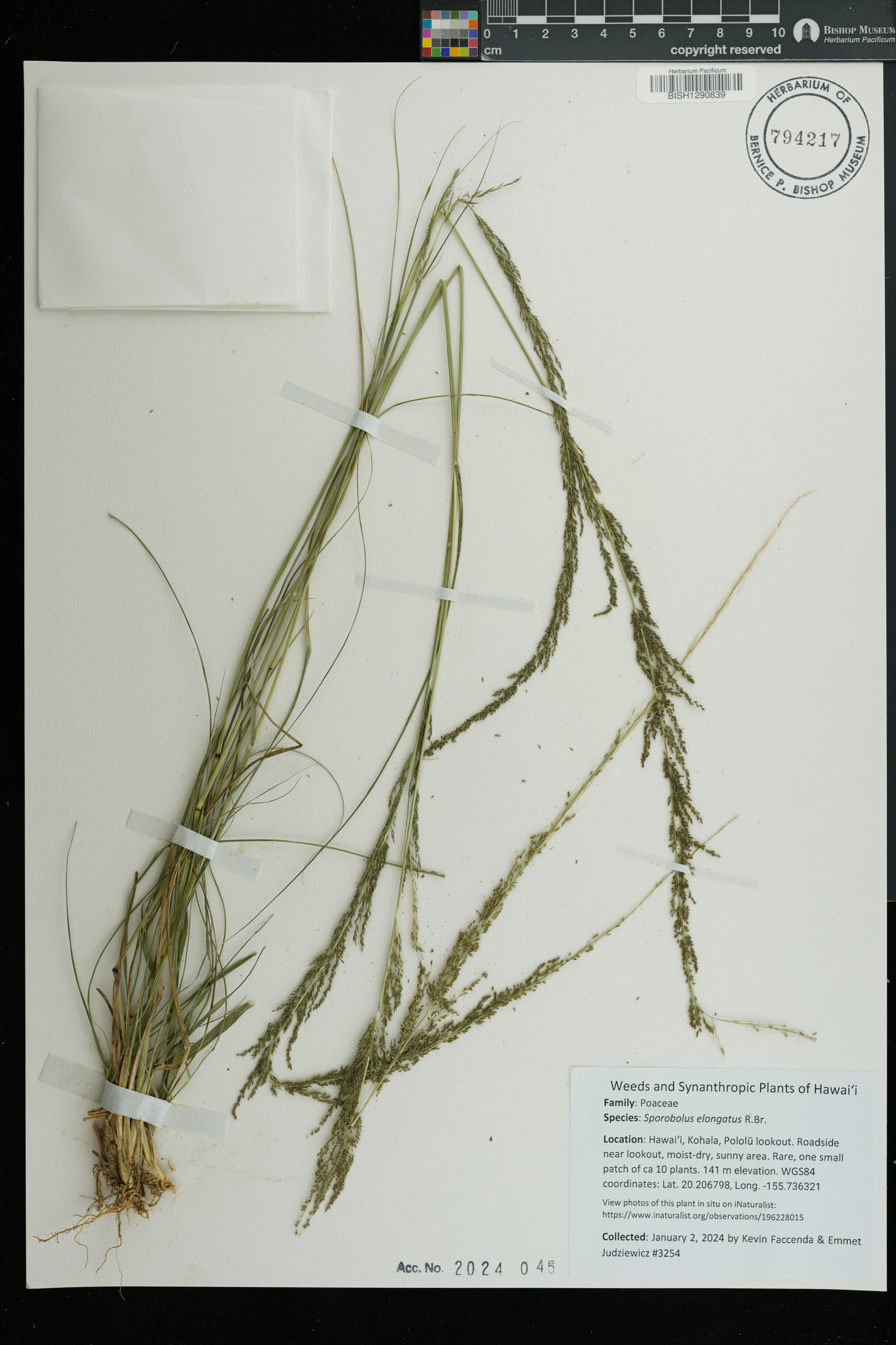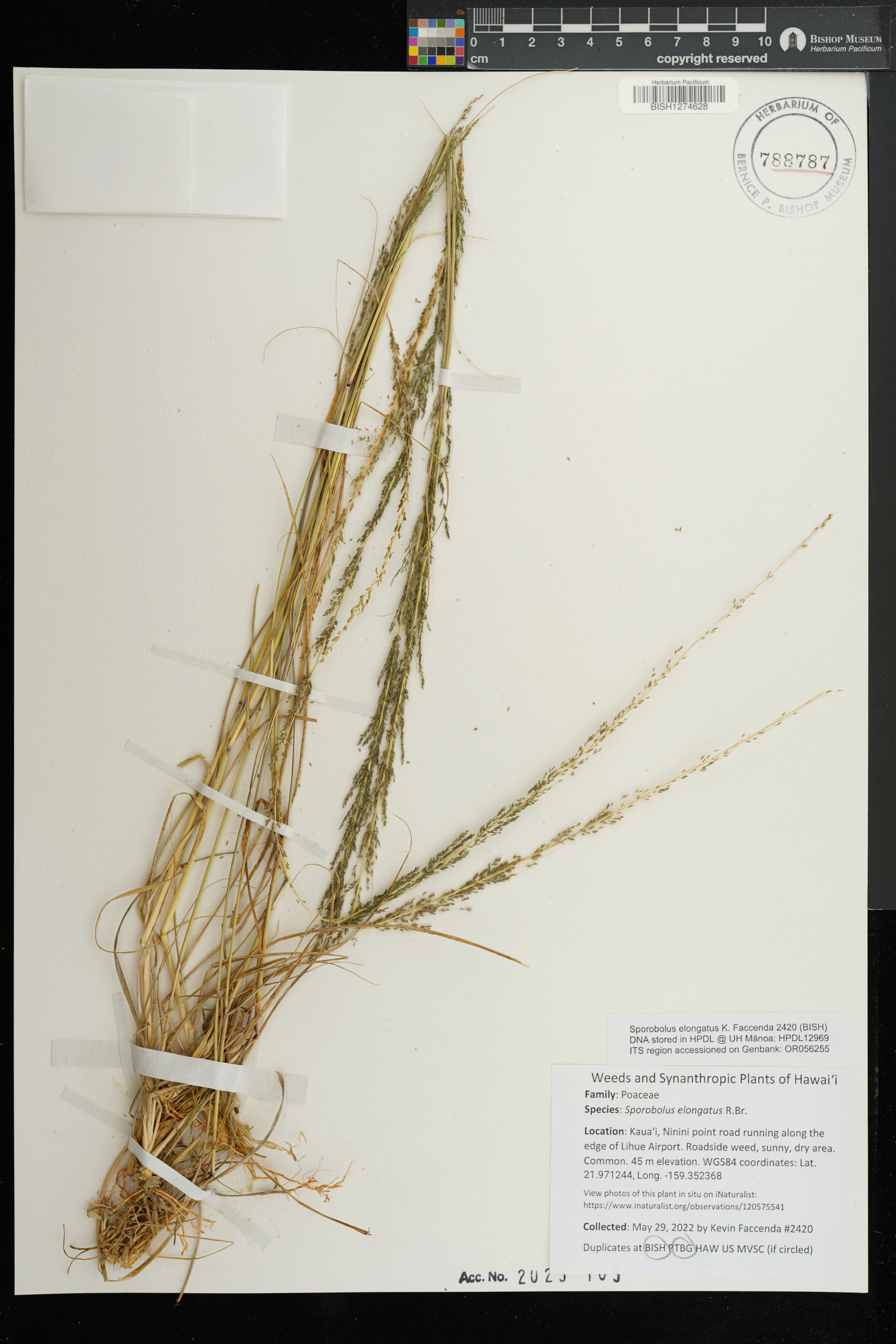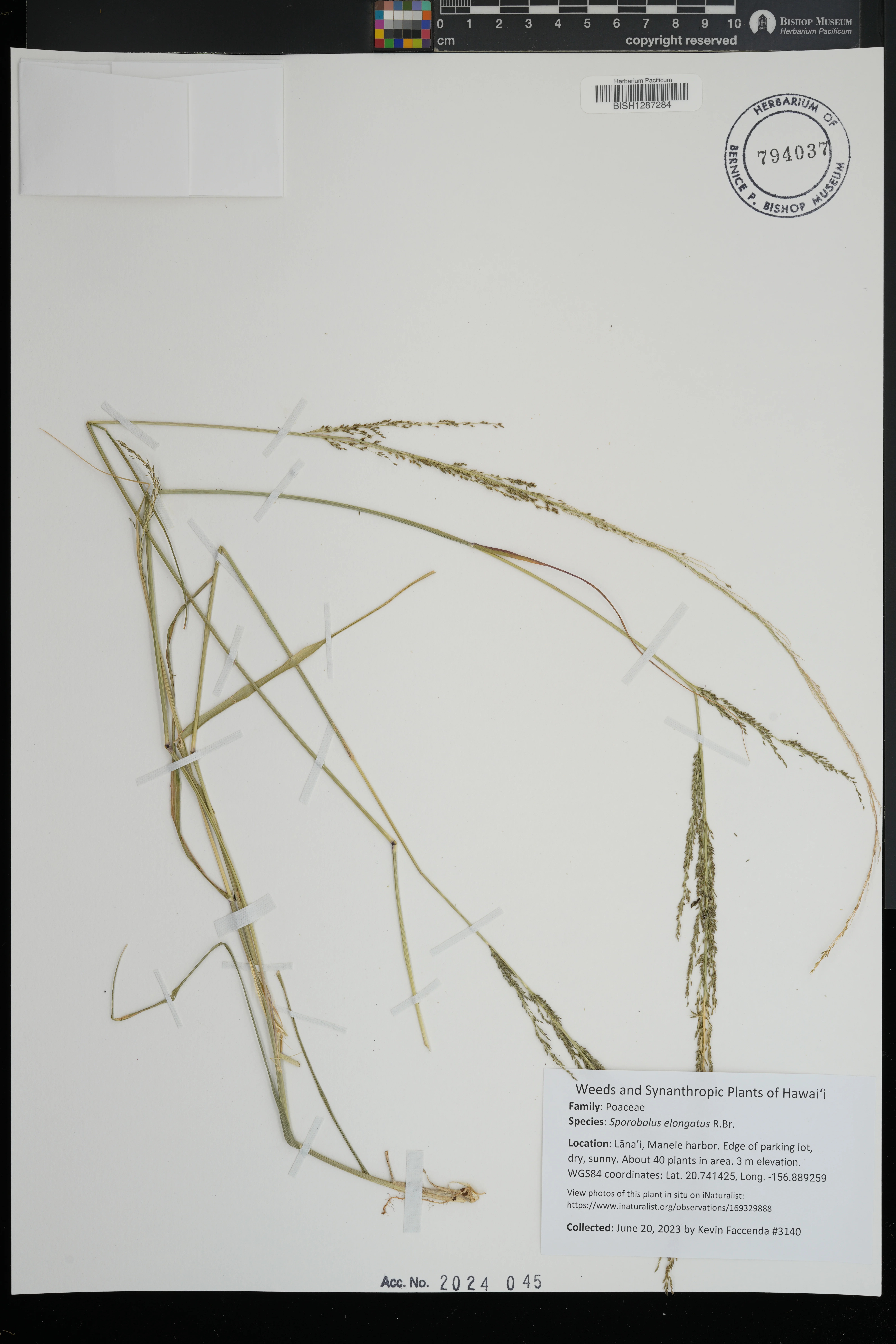| 11 | Sporobolus elongatus | R.Br. | Schofield Barracks. | PRESERVED_SPECIMEN | A.S. Hitchcock | Hitchcock 13940 | Missouri Botanical Garden | 7/5/1916 |