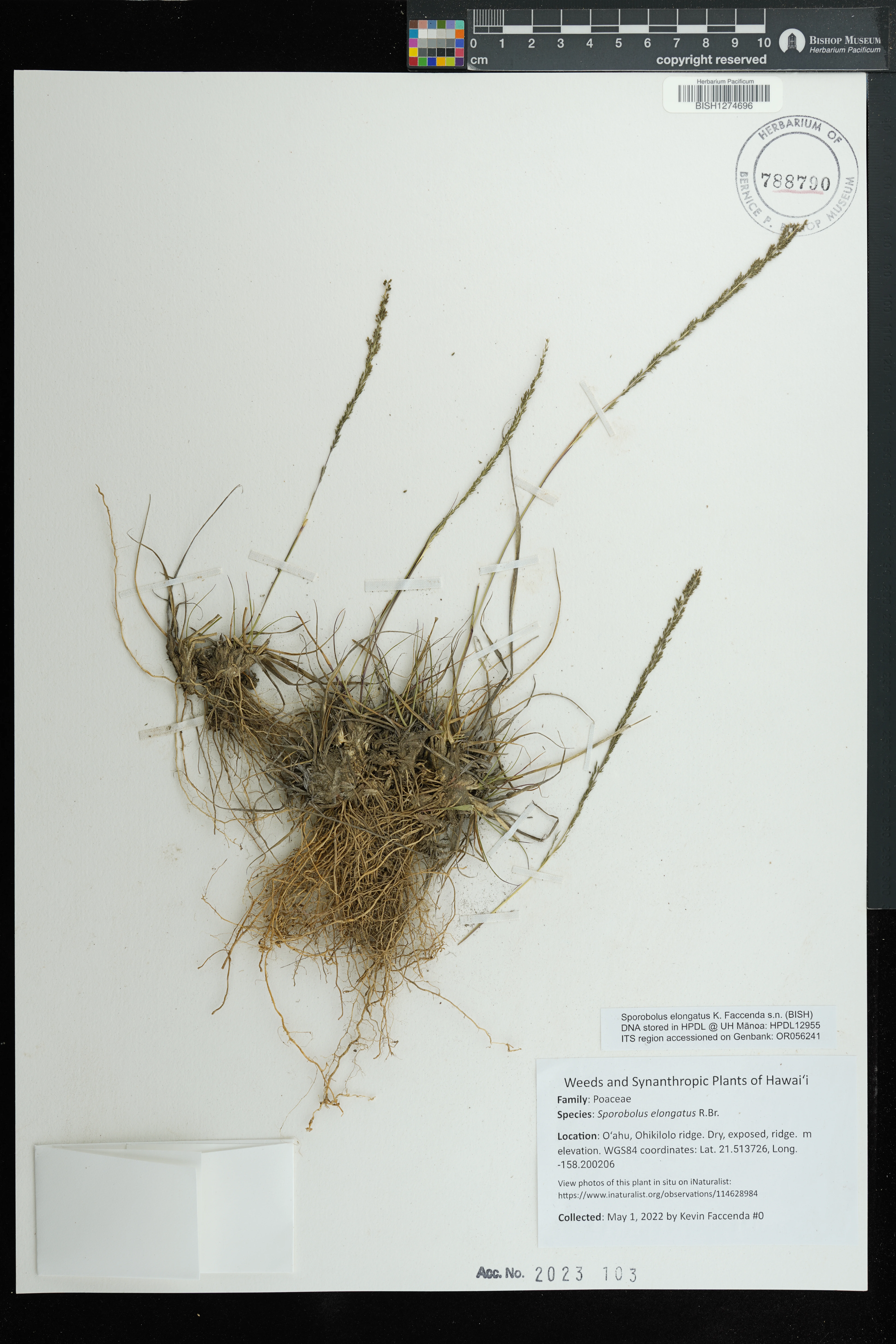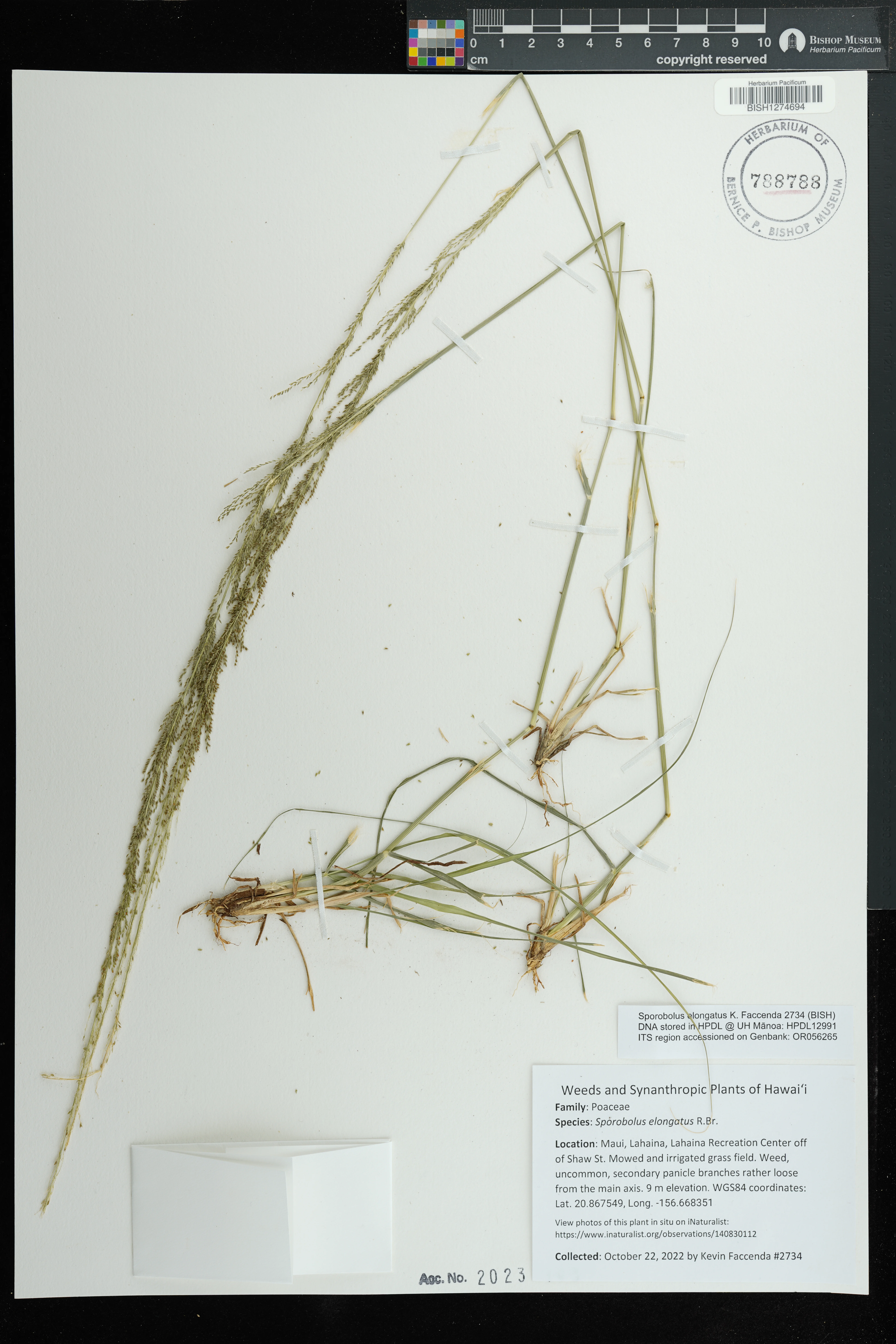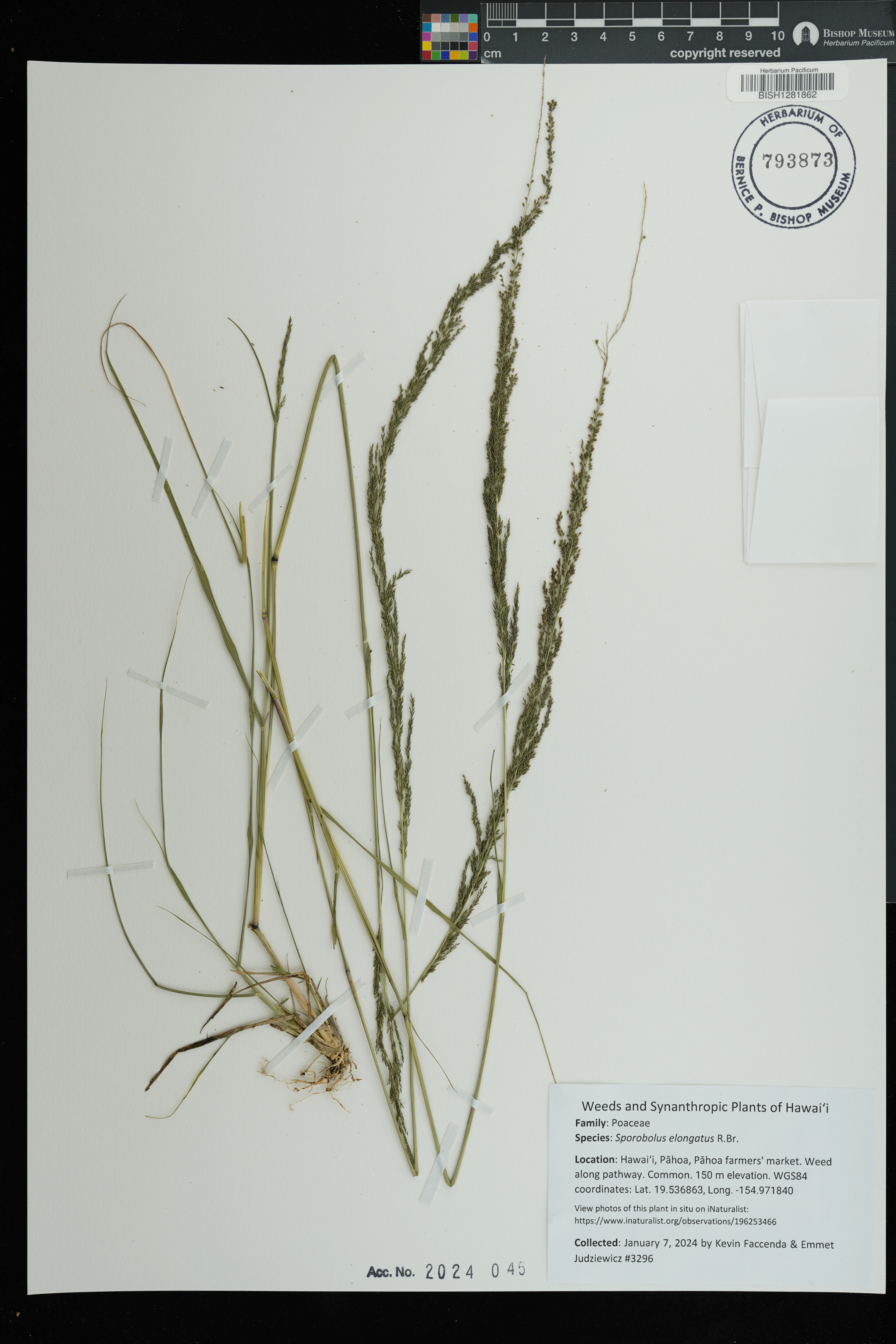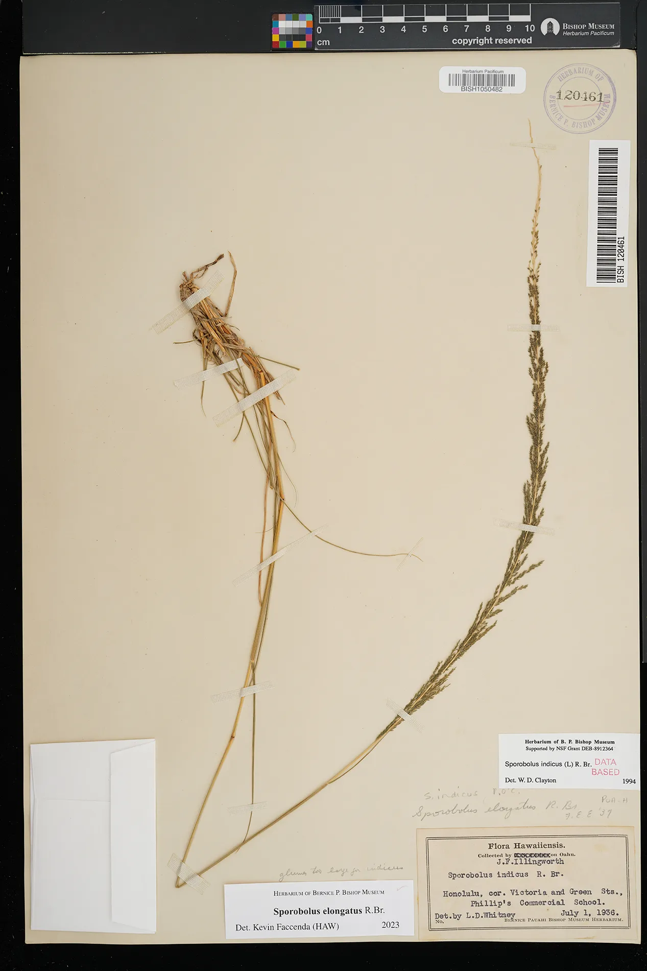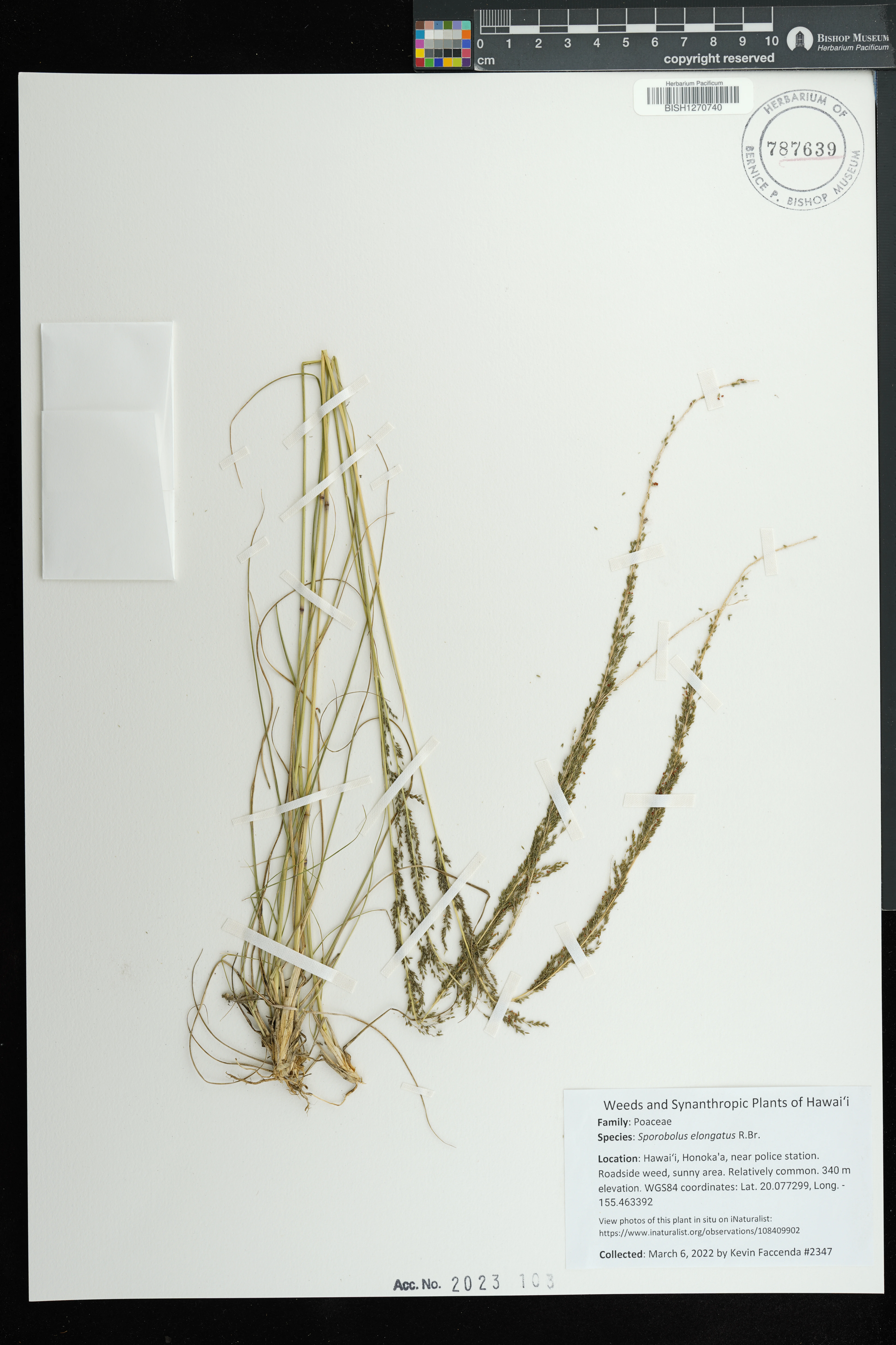 | 11 | Sporobolus elongatus | R.Br. | Schofield Barracks. | PRESERVED_SPECIMEN | A.S. Hitchcock | Hitchcock 13940 | Missouri Botanical Garden | 7/5/1916 |