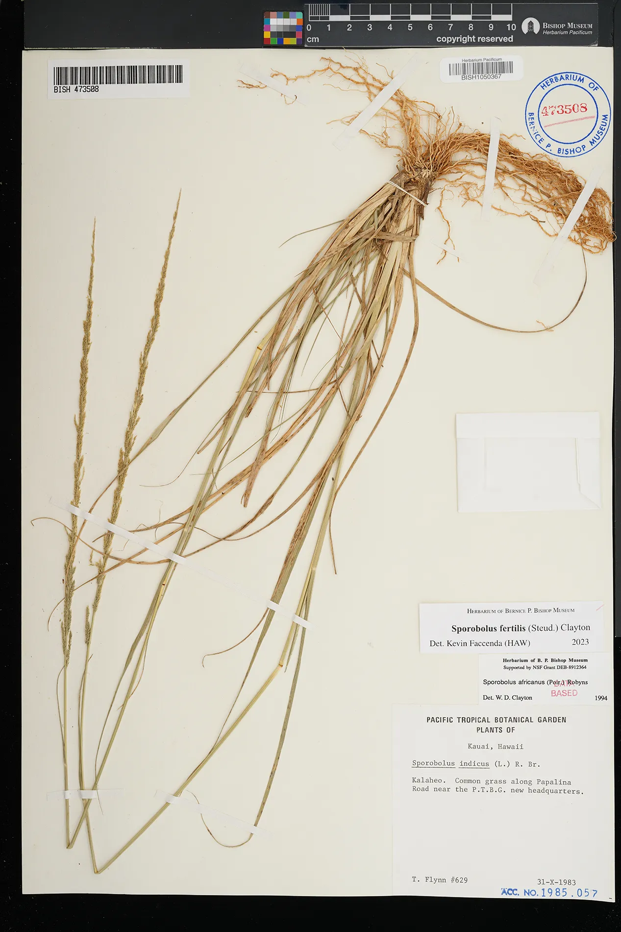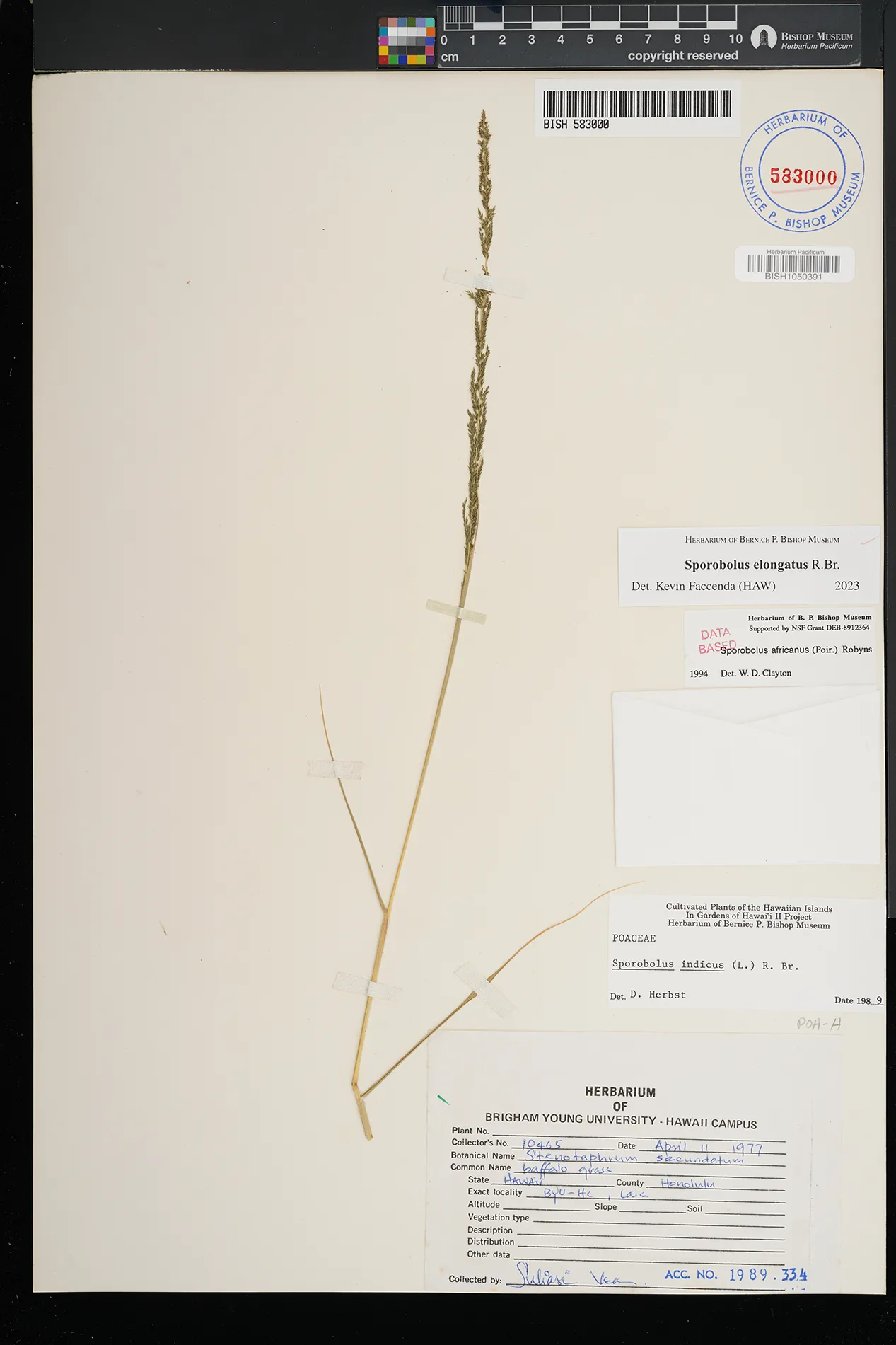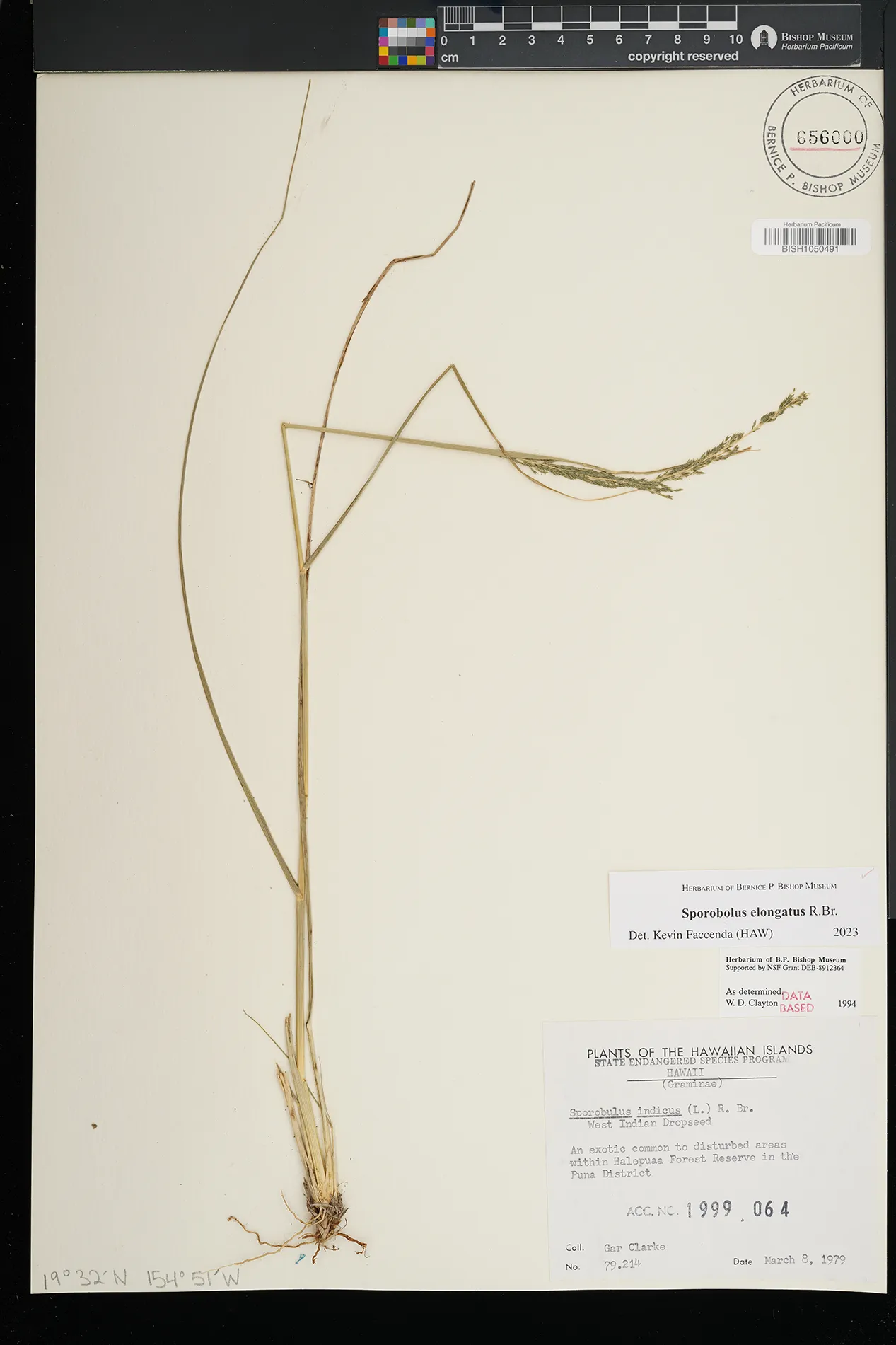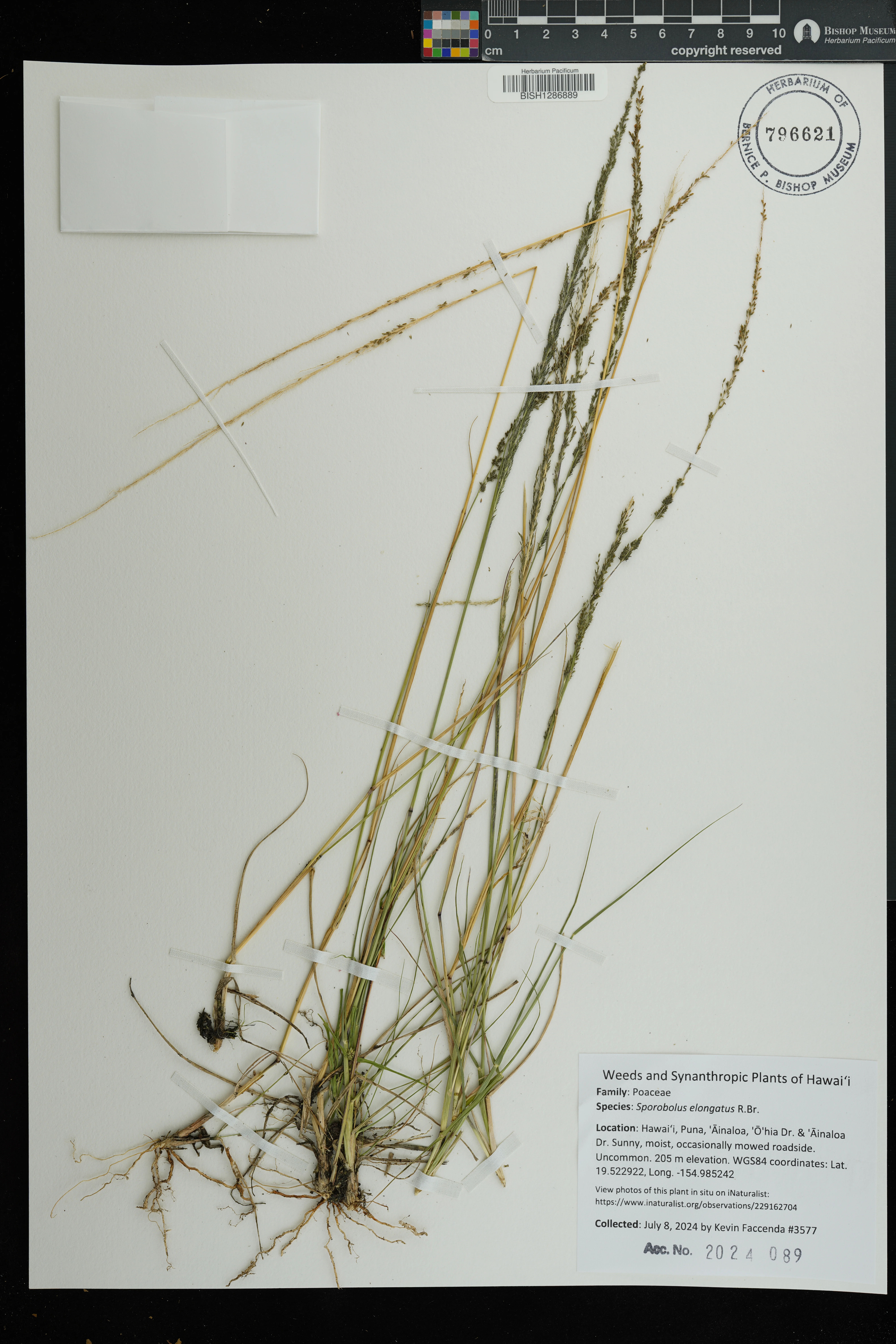 | 11 | Sporobolus elongatus | R.Br. | Schofield Barracks. | PRESERVED_SPECIMEN | A.S. Hitchcock | Hitchcock 13940 | Missouri Botanical Garden | 7/5/1916 |