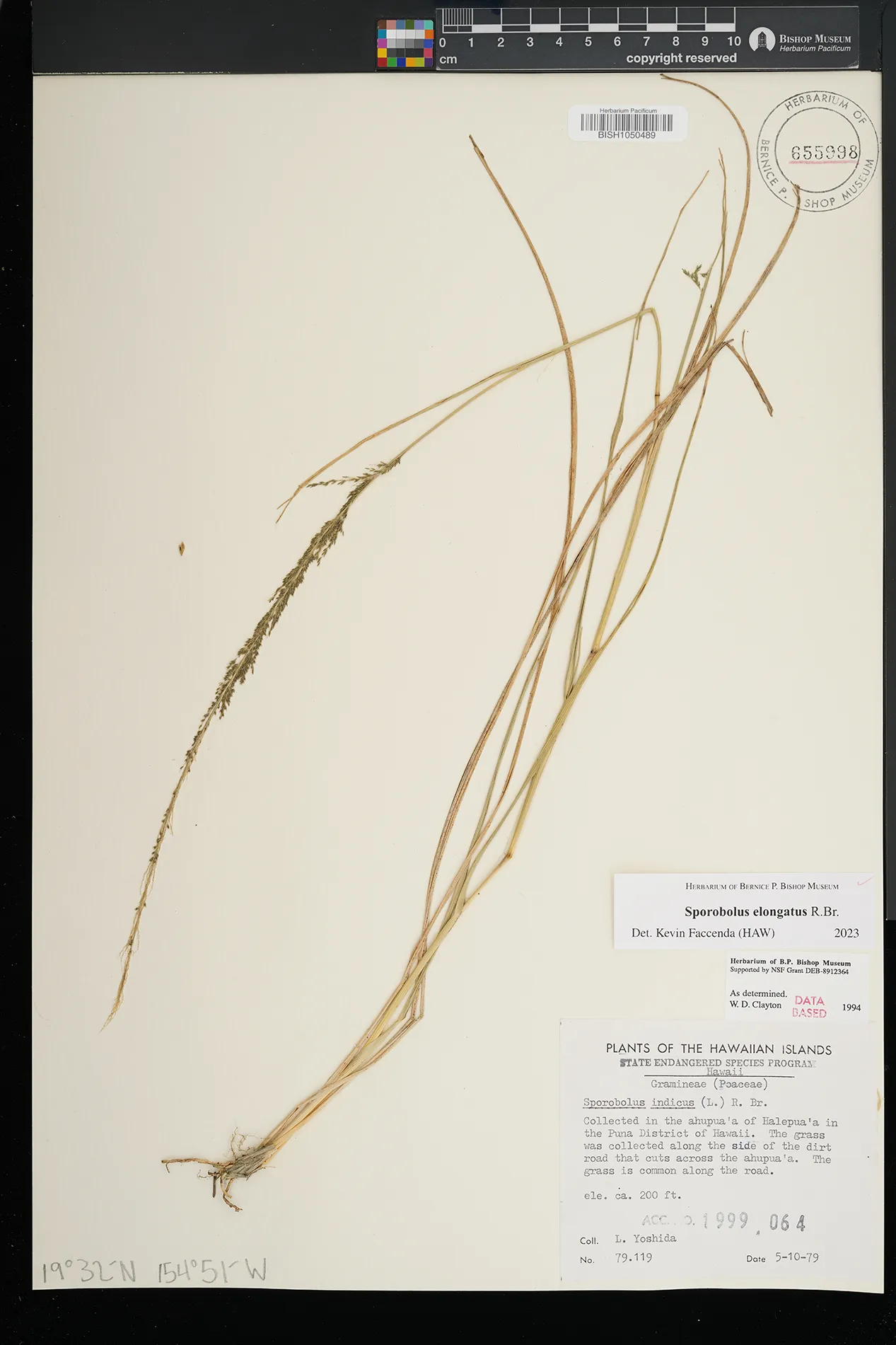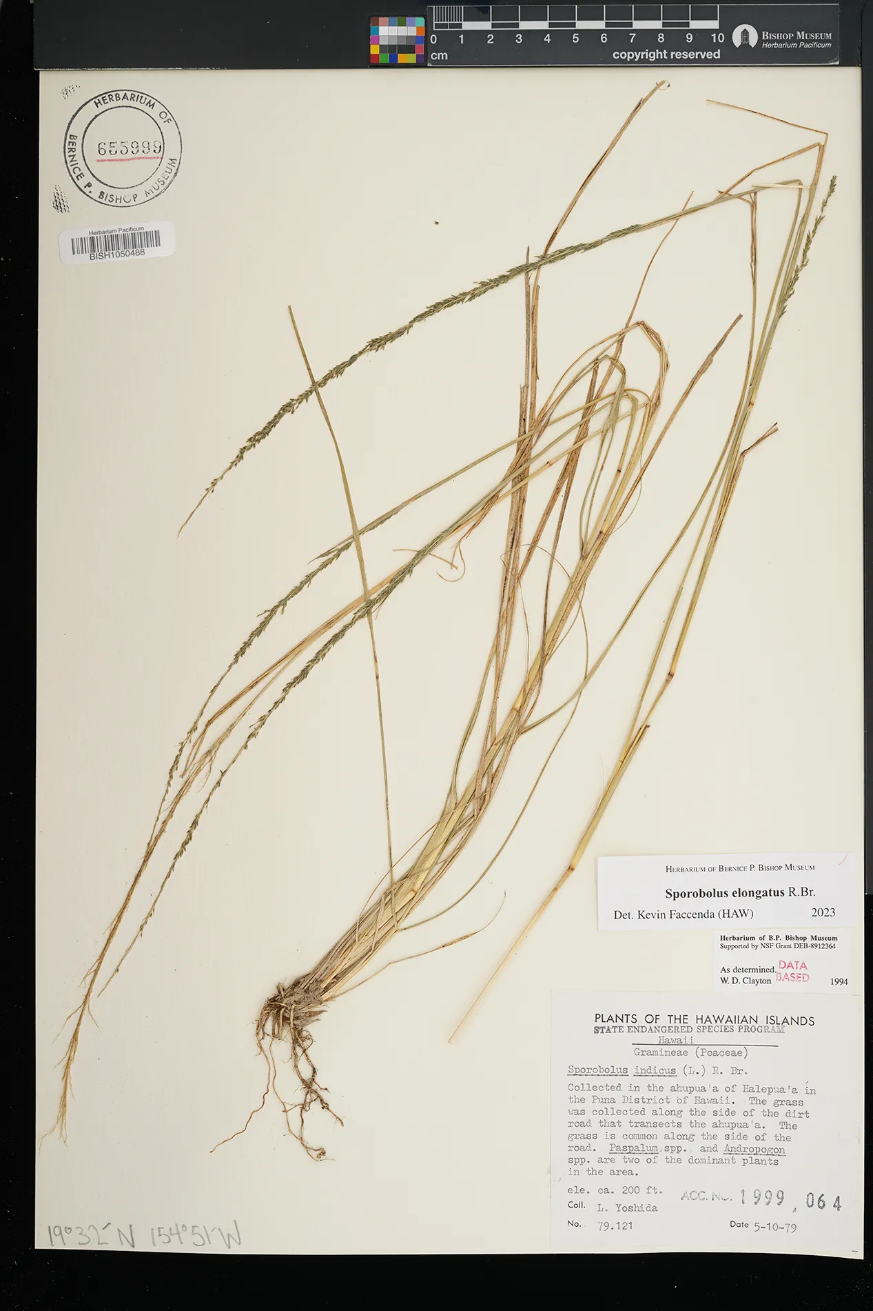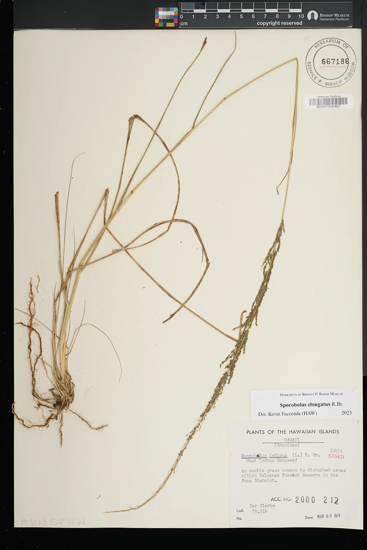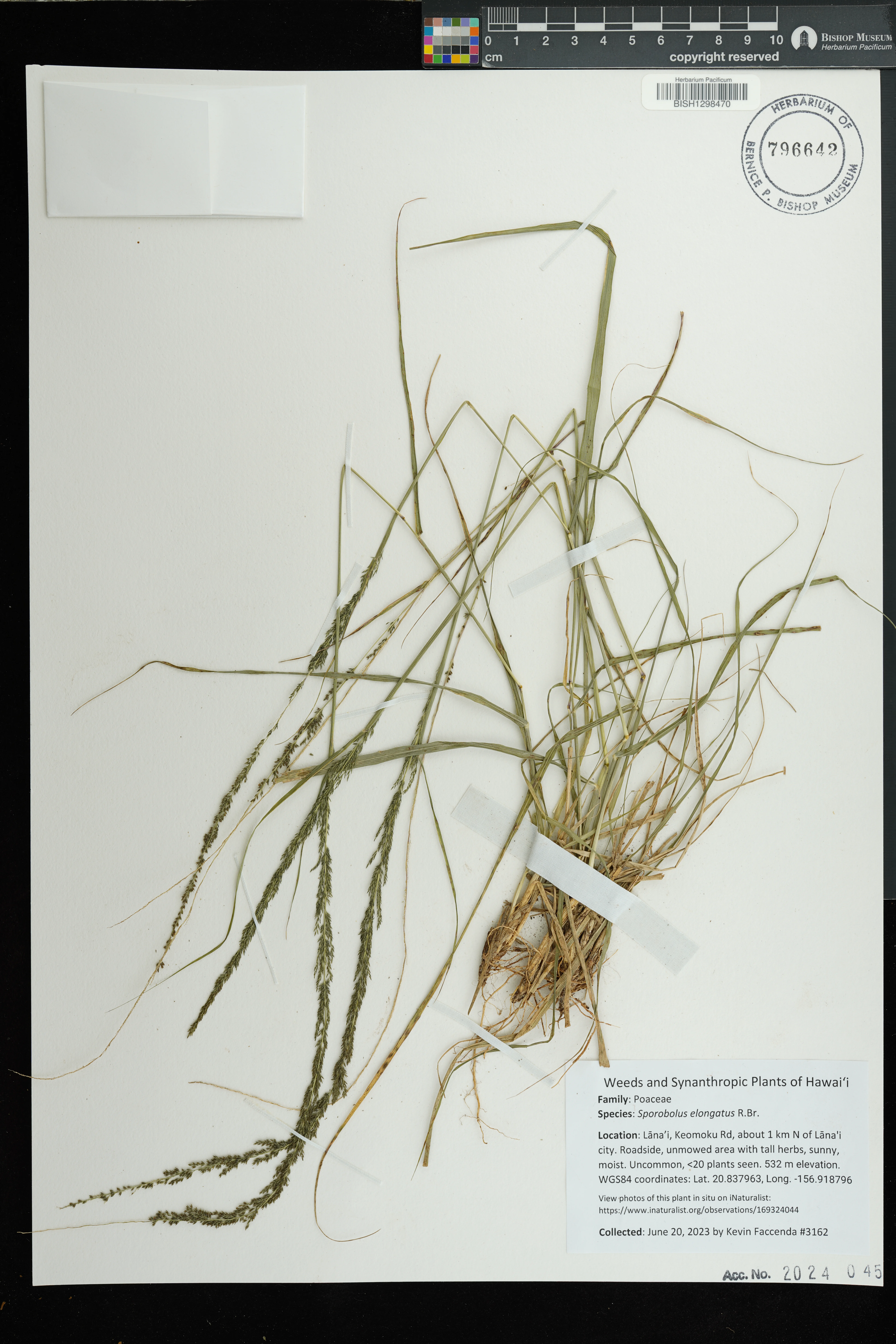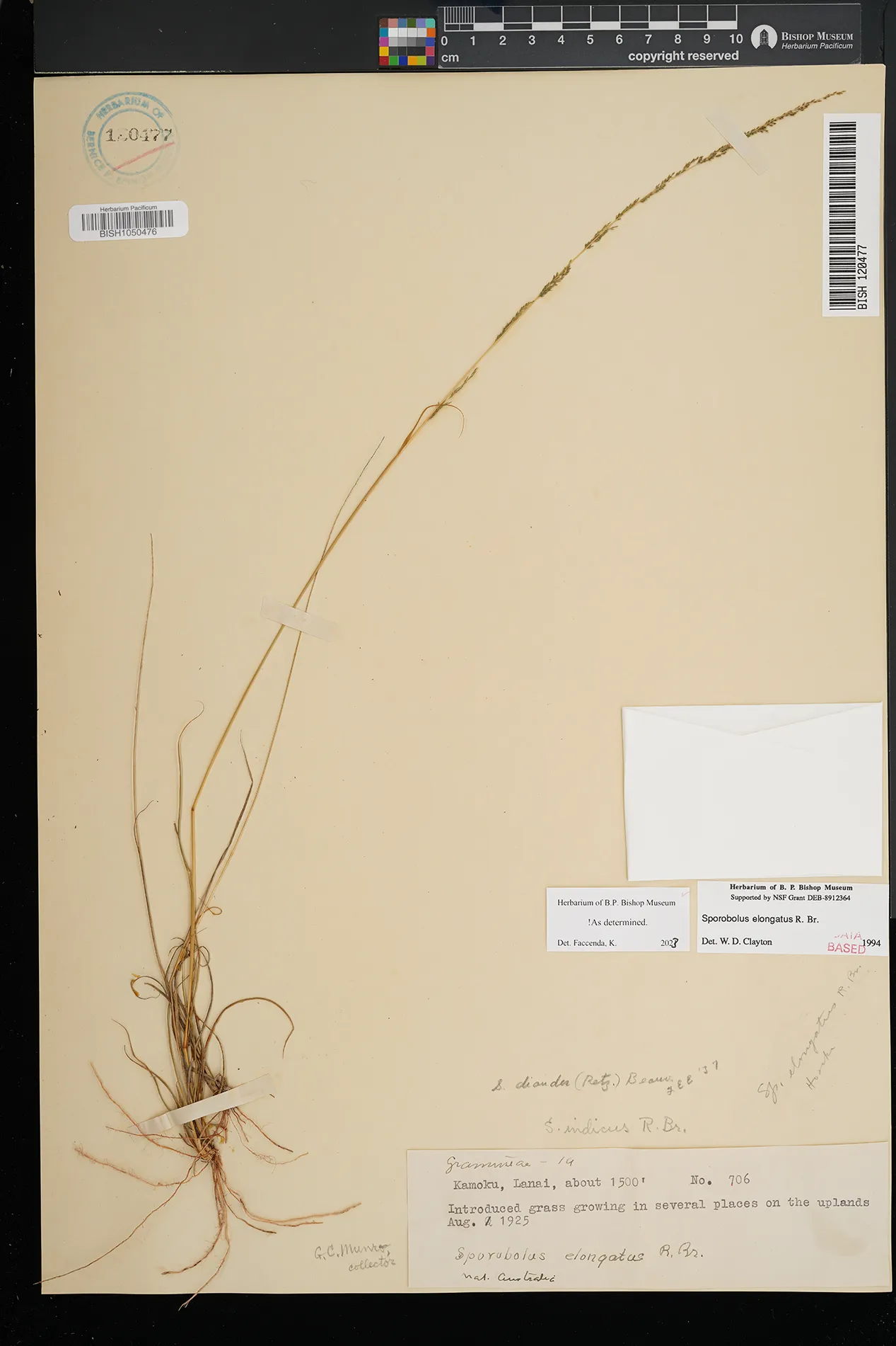 | 5 | Sporobolus elongatus | R.Br. | Kamoku | PRESERVED_SPECIMEN | Munro, G.C. | 706 | Lanai | BISH | 8/1/1925 | |