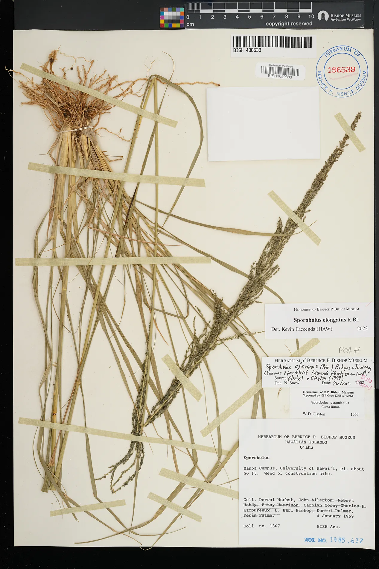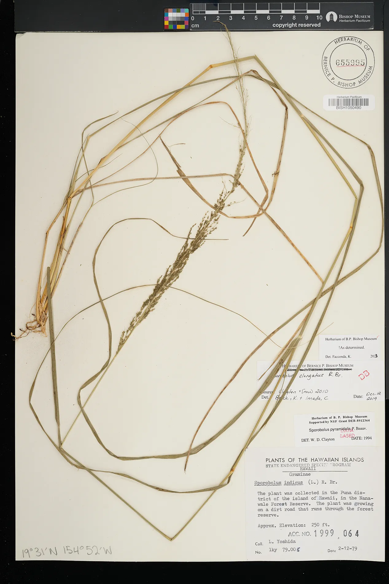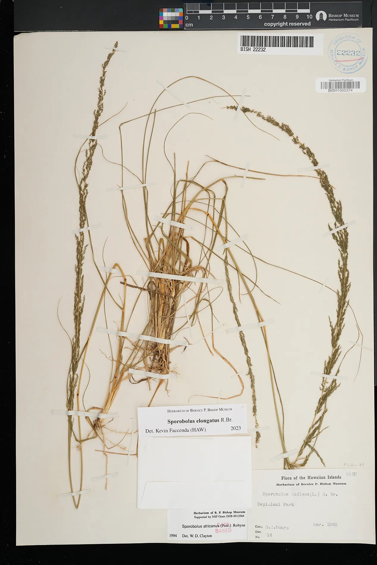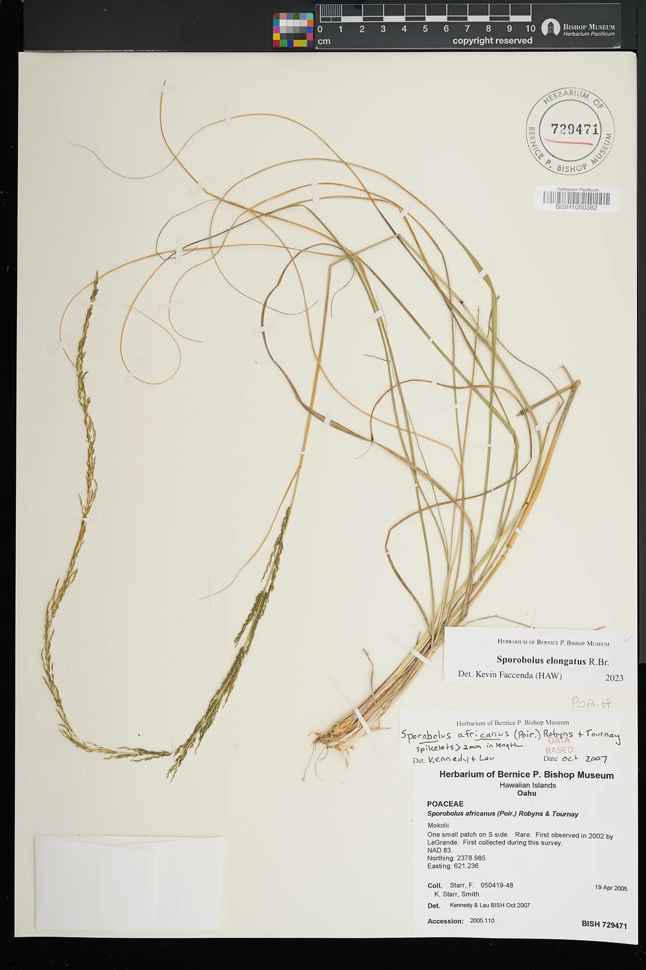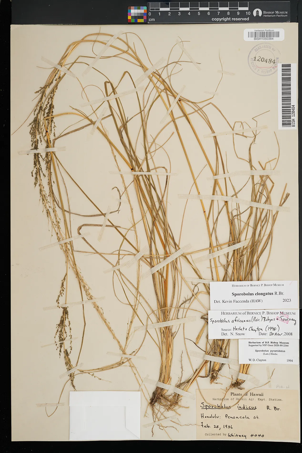 | 5 | Sporobolus elongatus | R.Br. | Kamoku | PRESERVED_SPECIMEN | Munro, G.C. | 706 | Lanai | BISH | 8/1/1925 | |