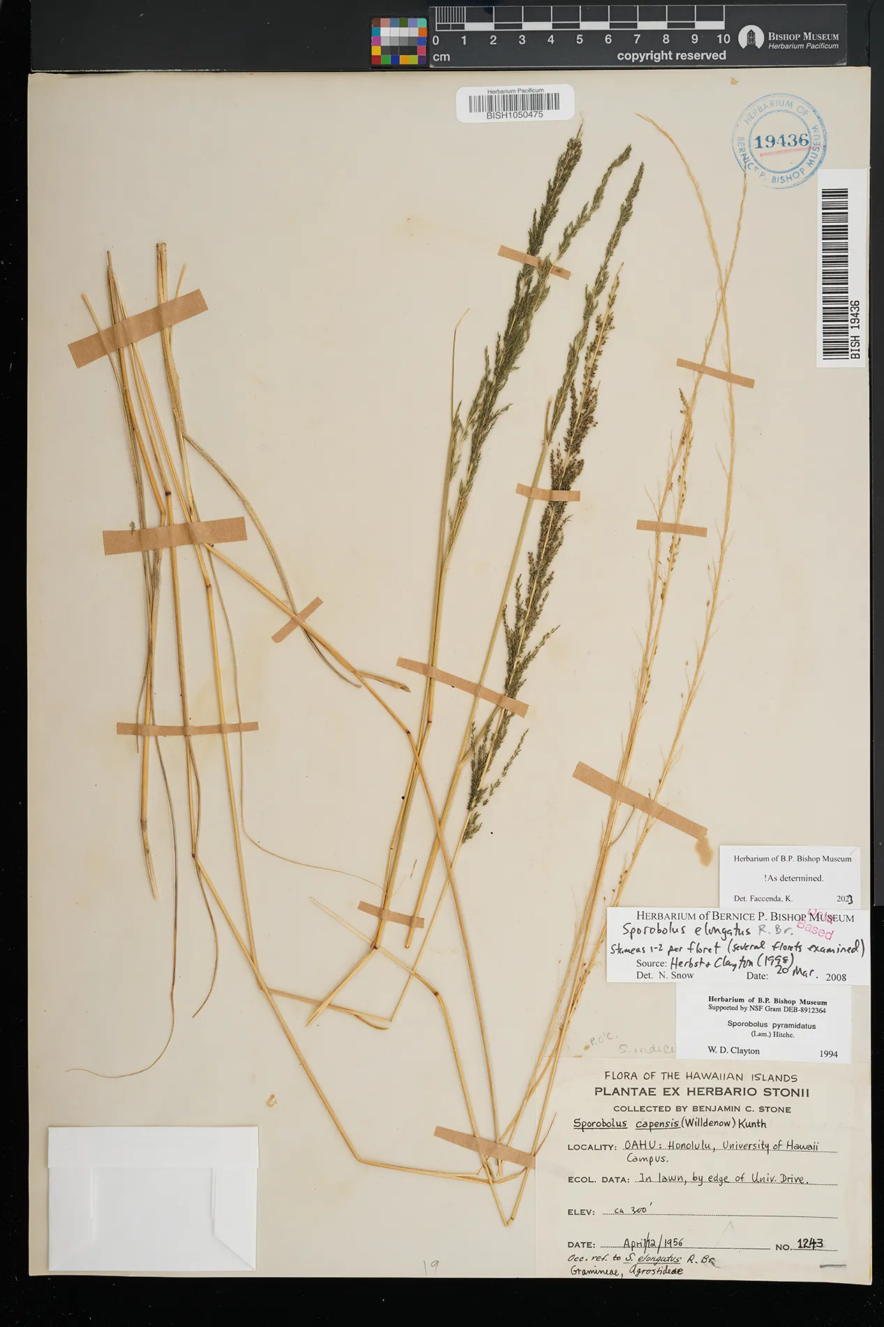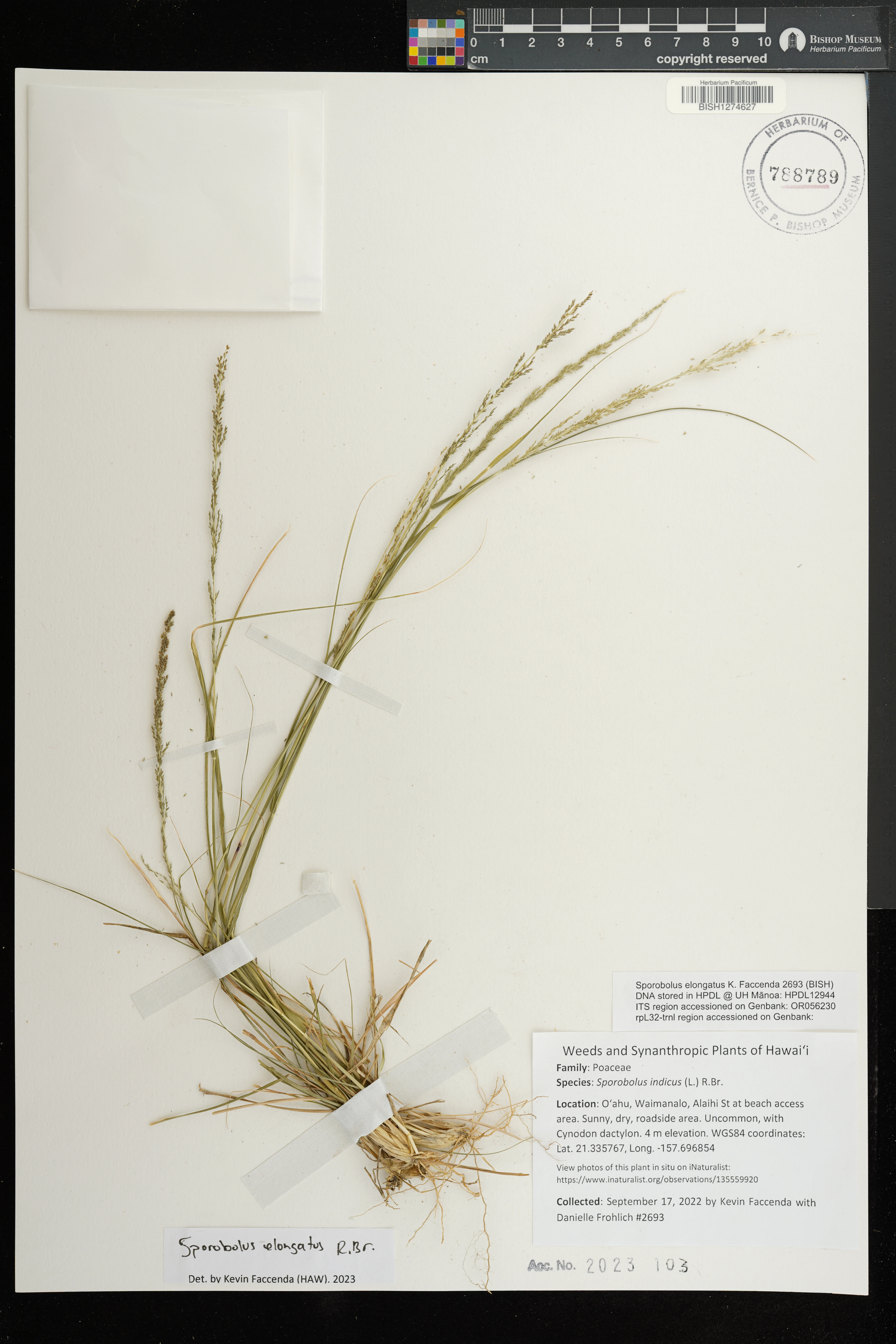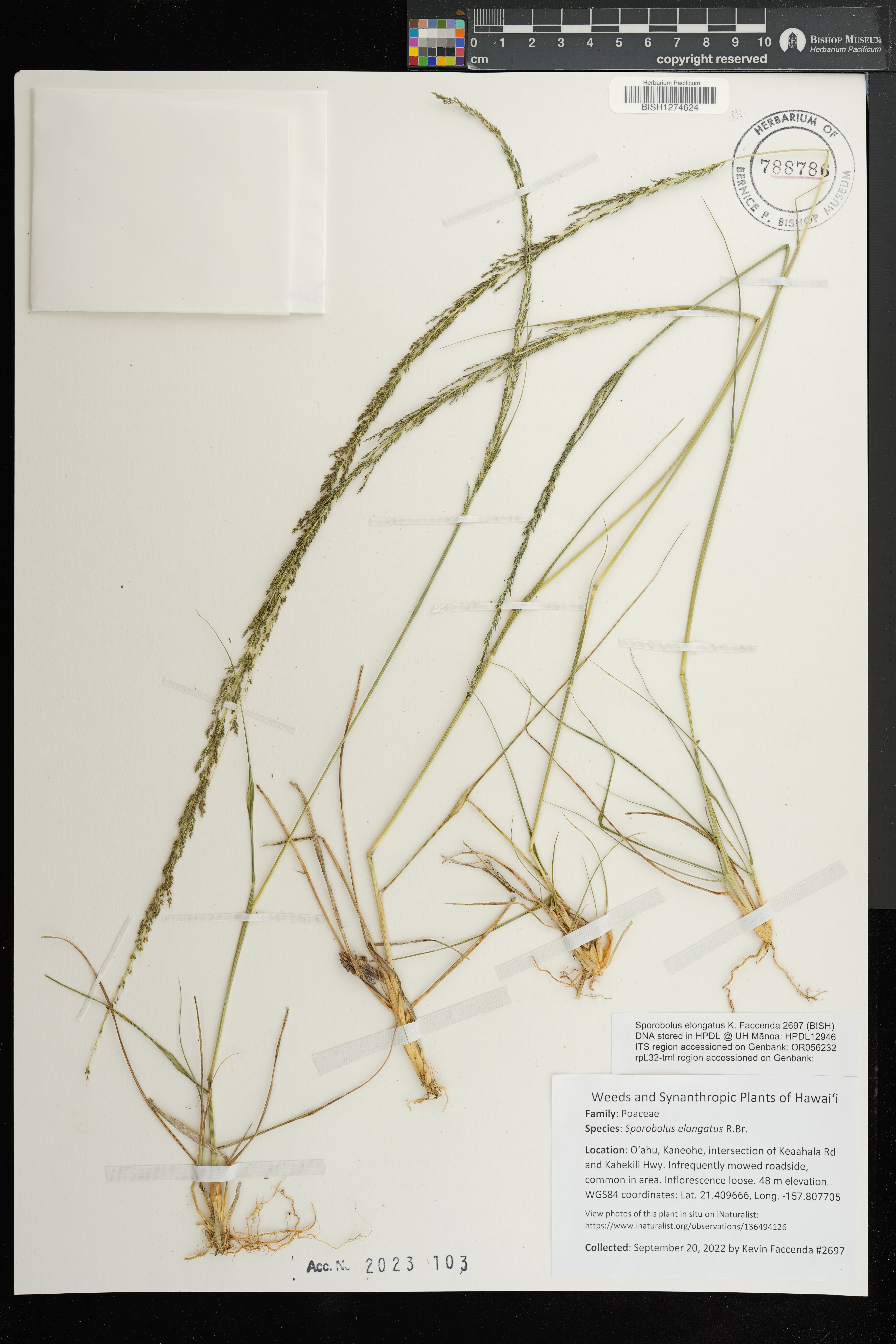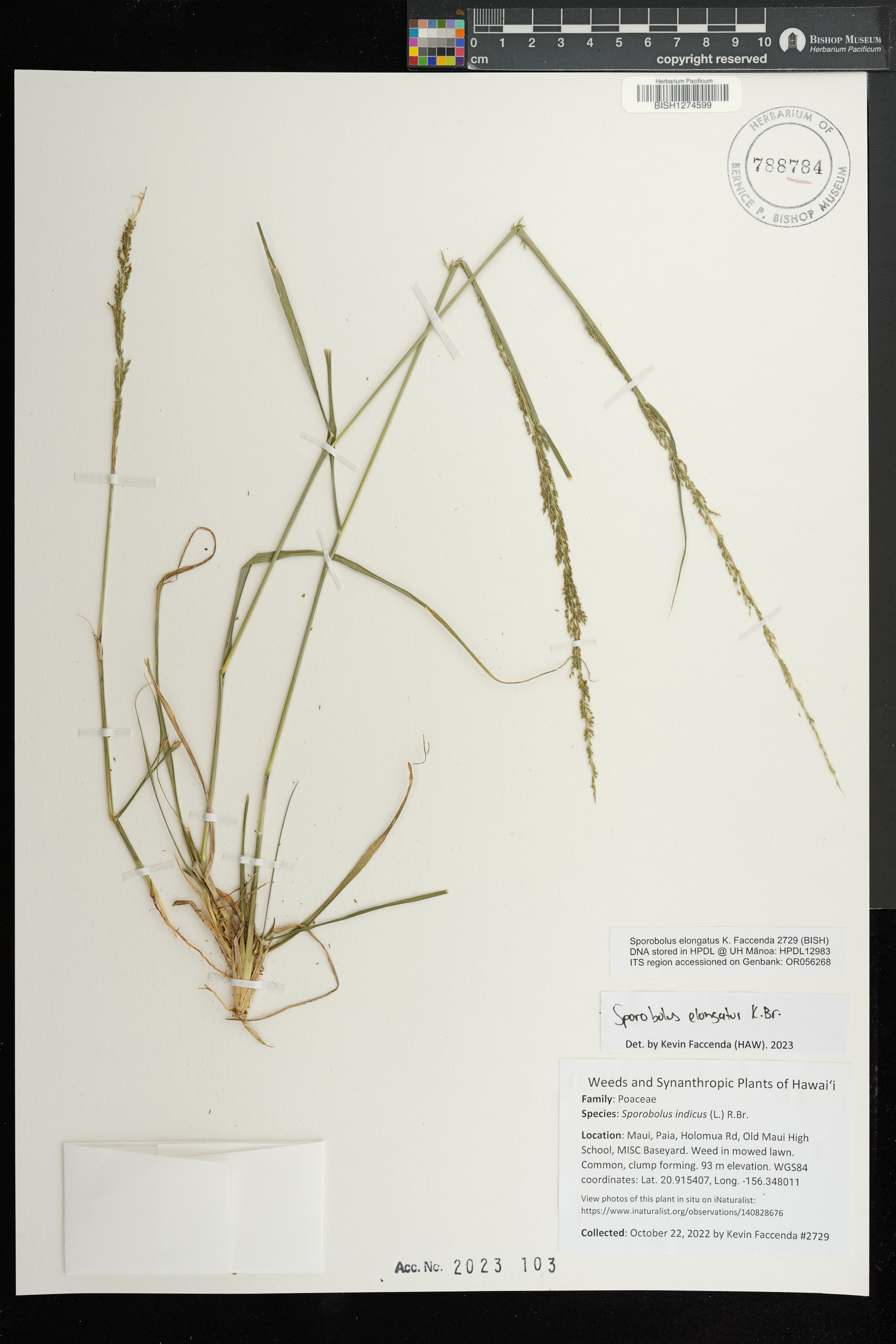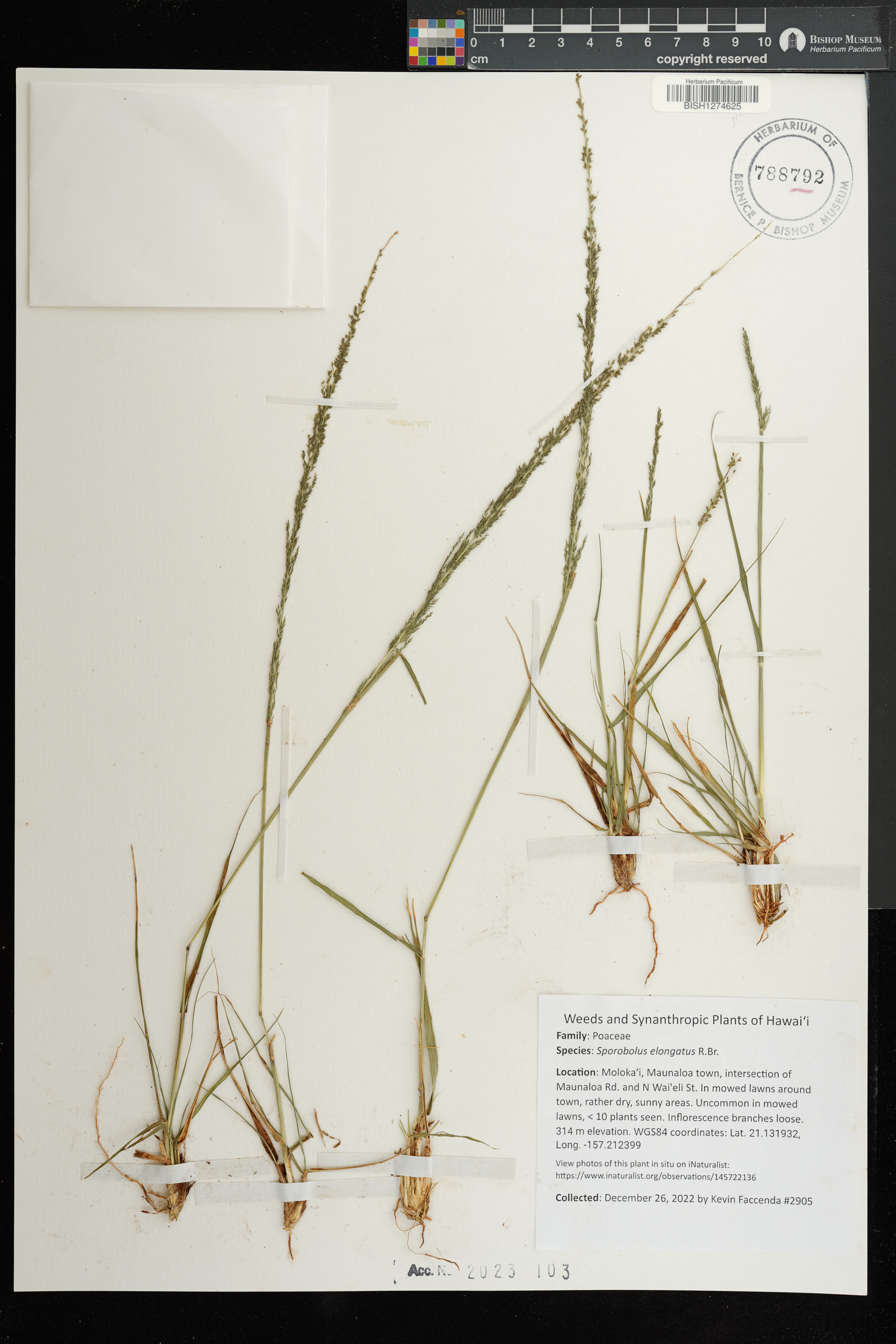| 3 | Sporobolus elongatus | R.Br. | honolulu; university of hawaii campus | In lawn, by edge of University Drive. | PRESERVED_SPECIMEN | stone, b.c. | collector number: 1243 | Oahu | BISH | 4/12/1956 |