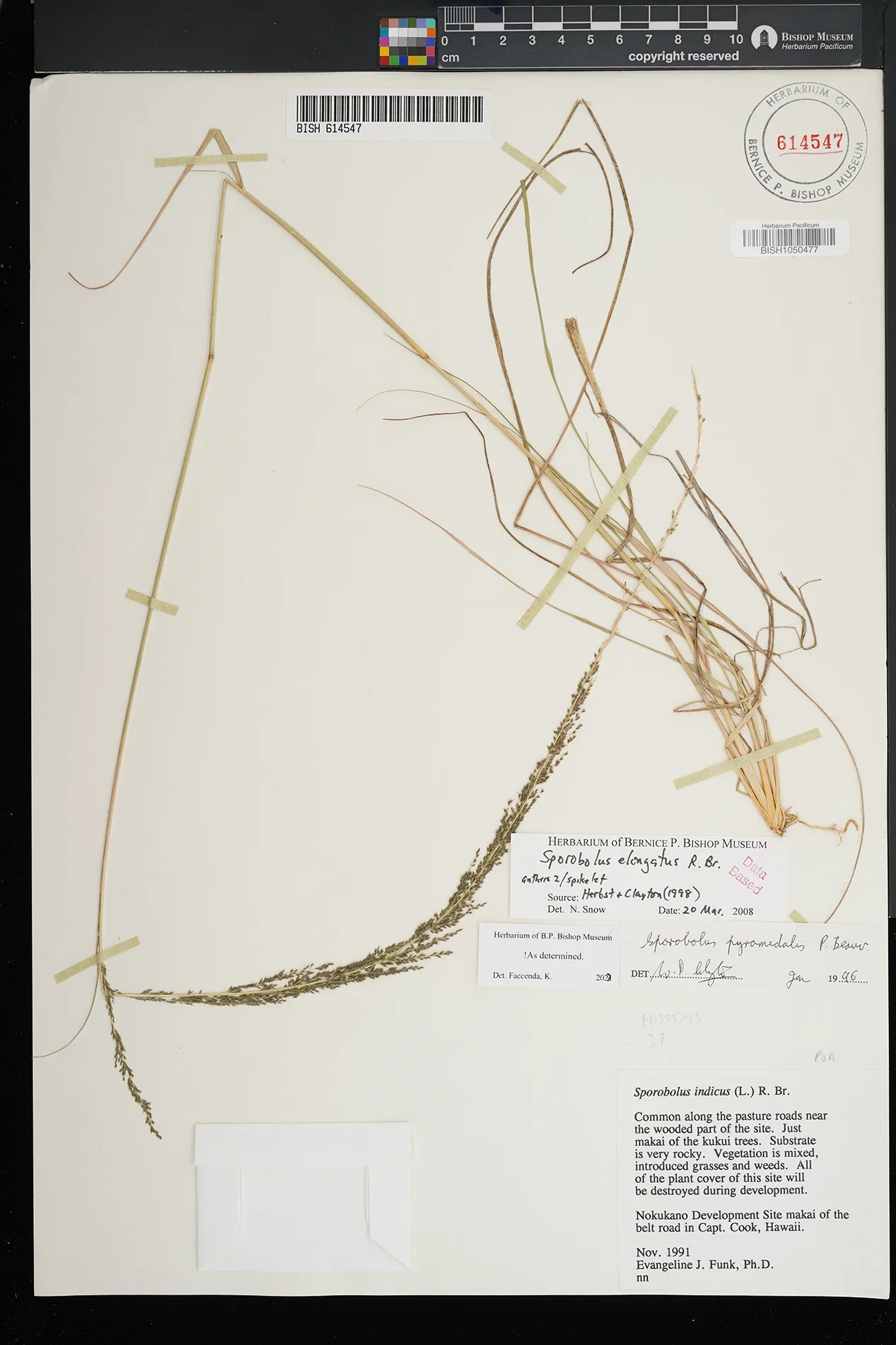 | 1 | Sporobolus elongatus | R.Br. | Nokukano Development Site makai of the belt rd in Capt. Cook, Hawaii | Common along pasture roads near the wooded part of the site. Just makai of the kukui trees. Substrate is very rocky. Vegetation is mixed, introduced grasses and weeds. | PRESERVED_SPECIMEN | Funk, E.J. | s.n. | Hawaii | BISH | 11/1/1991 |