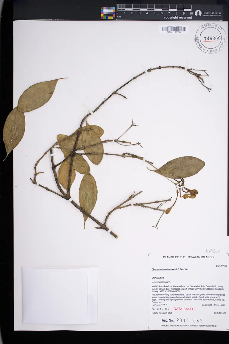 | 7 | Volkameria inermis | L. | Anini Road, on Makai side at the East end of Anini Beach Park, lining the dry stream bed. Collected as part of KISC 2007 Early Detection Roadside Survey. KISC #20070608A009. | PRESERVED_SPECIMEN | Natalia Tangalin | 1406 | Kauai | PTBG | 6/8/2007 | |