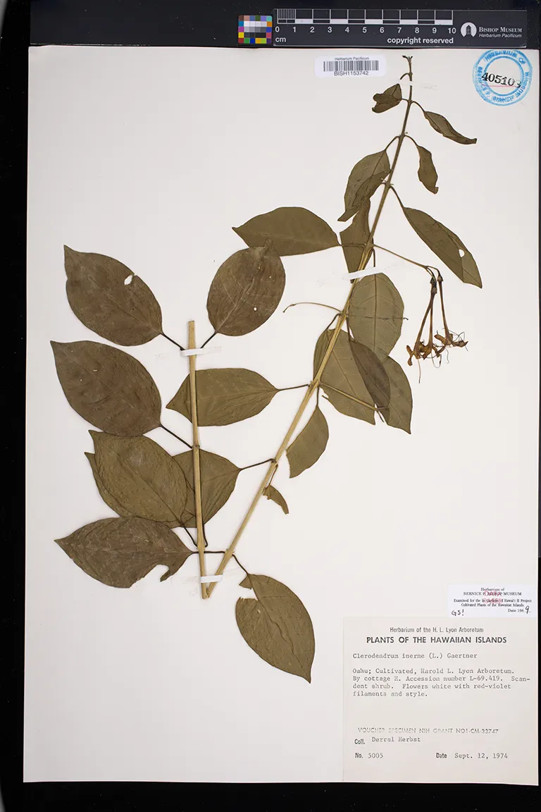 | 12 | Volkameria inermis | L. | harold l. lyon arboretum, by cottage h. | PRESERVED_SPECIMEN | d. r. herbst | 5005 | Oahu | US | 9/12/1974 | |