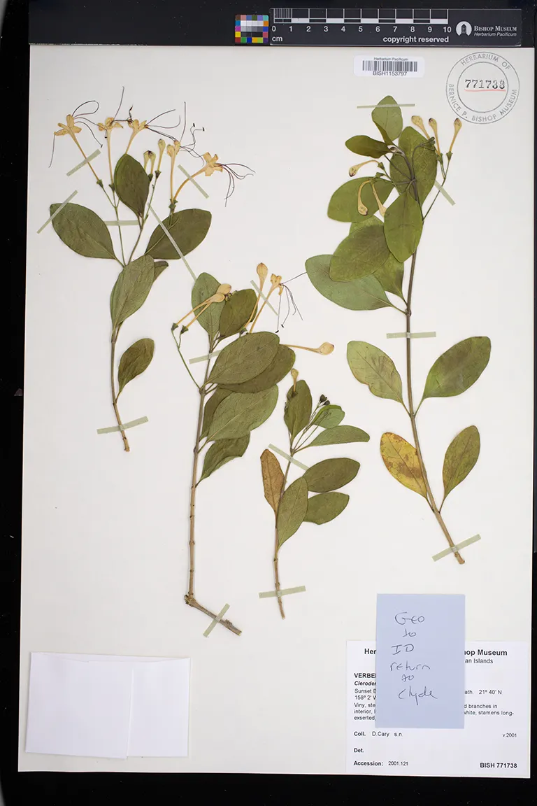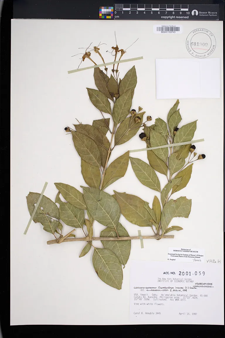 | 1 | Volkameria inermis | L. | kaneohe, hoomaluhia botanical garden, 45-680 luluku rd, philippine area | PRESERVED_SPECIMEN | annable, c.r. | collector number: 3445 | Hawaii | BISH | 4/14/1997 | |