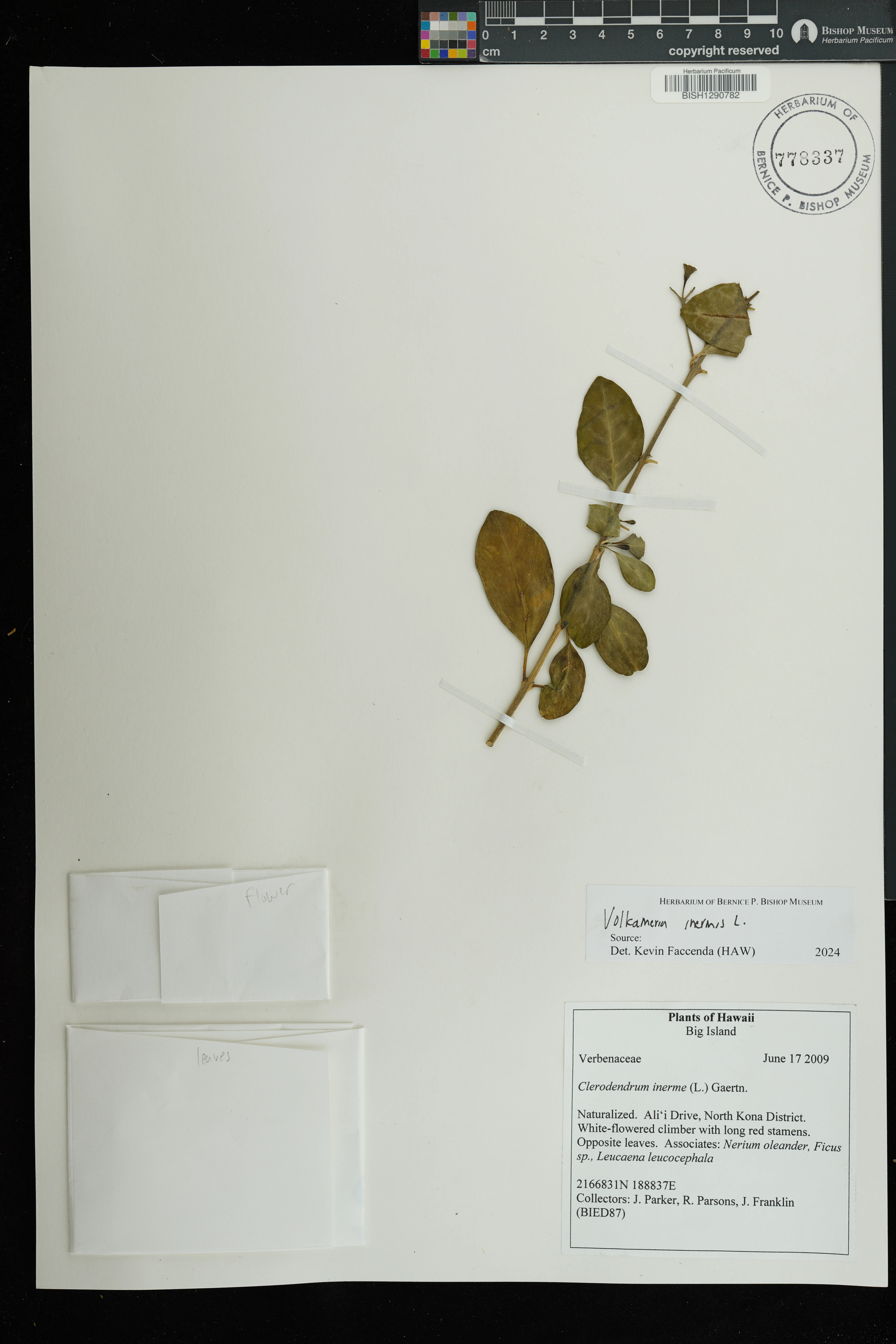 | 2 | Volkameria inermis | L. | Ho'omaluhia Botanical Garden, 45-680 Luluku Rd, Philippine section | Cultivated | PRESERVED_SPECIMEN | C. R. Annable | 3445 | NY | 4/14/1997 | |