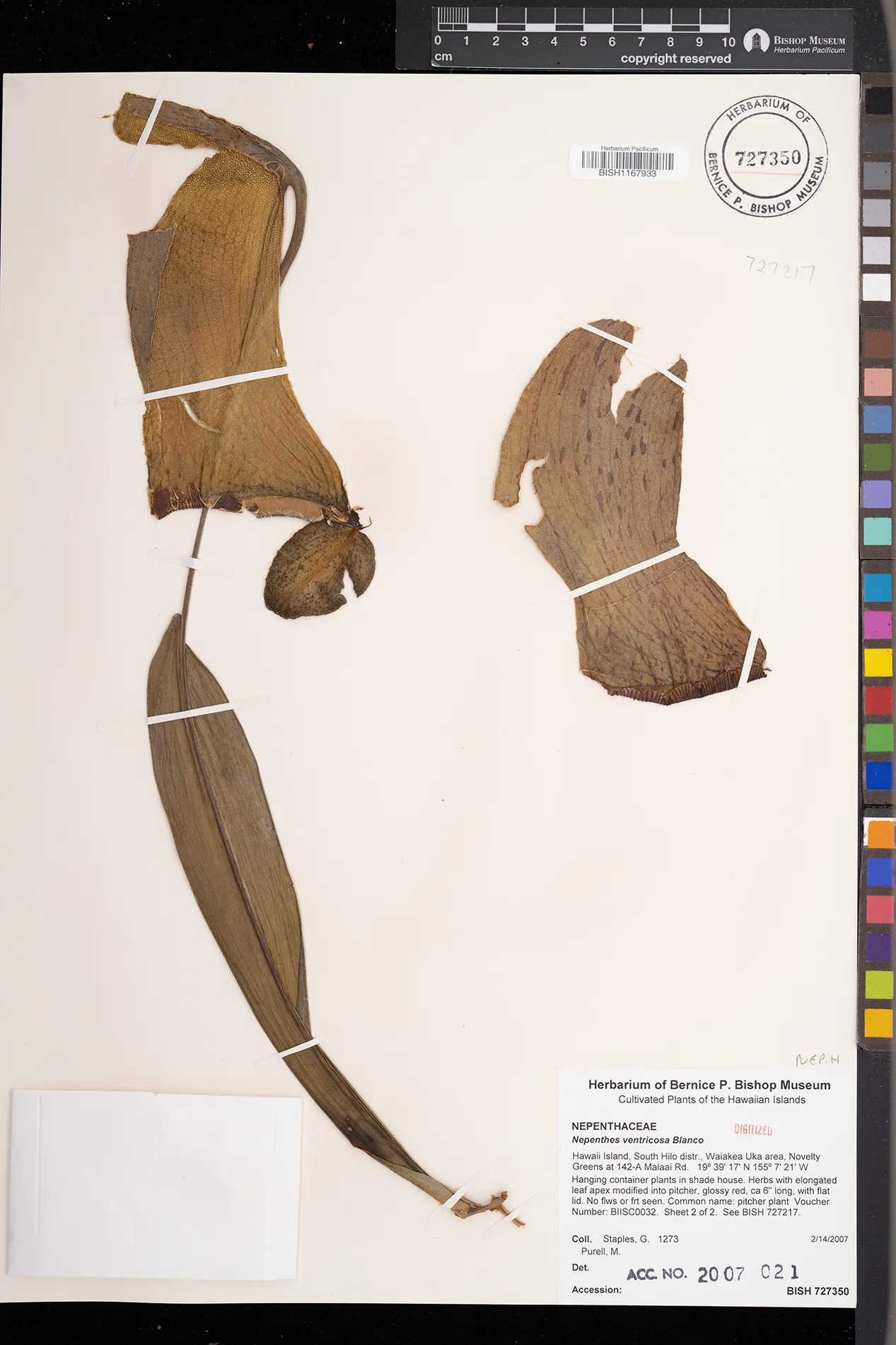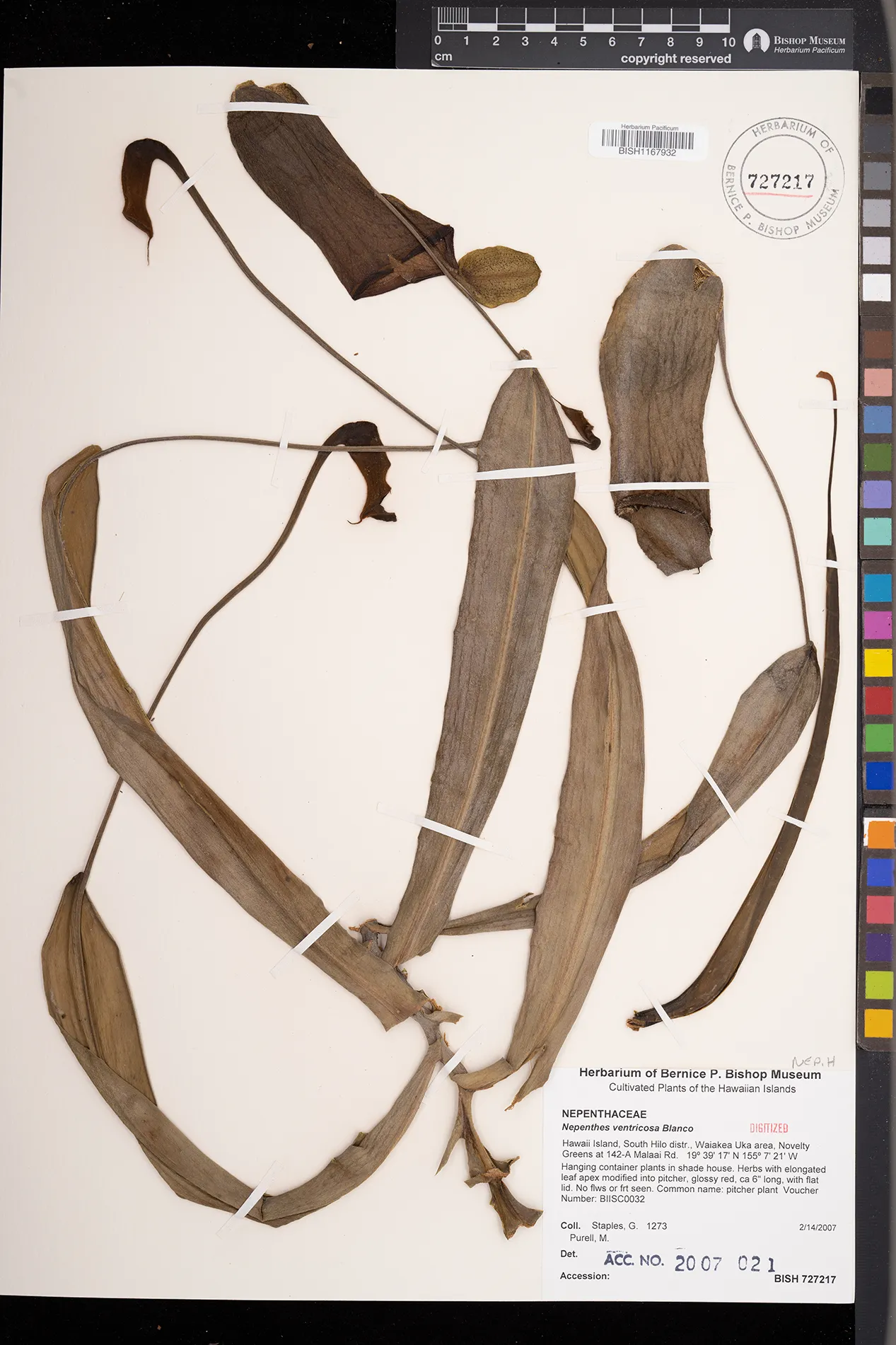 | 1 | Nepenthes ventricosa | Blanco | South Hilo distr., Waiakea Uka area, Novelty Greens at 142-A Malaai Rd. | Hanging container plants in shade house. | PRESERVED_SPECIMEN | Staples, G.W. Purell, M. | Collector Number: 1273 | Hawaii | BISH | 2/14/2007 |