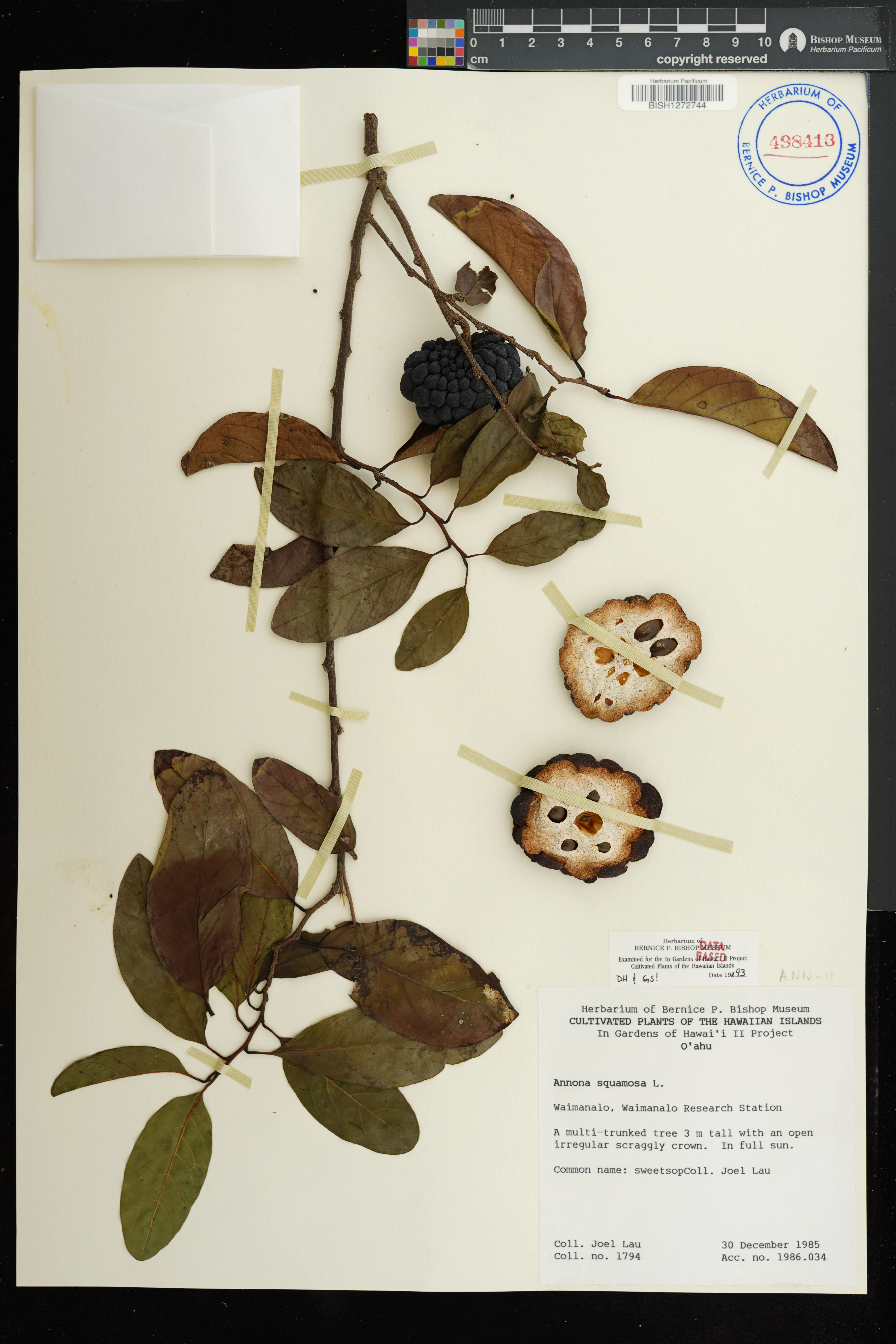 | 1 | Annona squamosa | L. | waimanalo, waimanalo research station | PRESERVED_SPECIMEN | lau, j. | collector number: 1794 | Oahu | BISH | 12/30/1985 | |