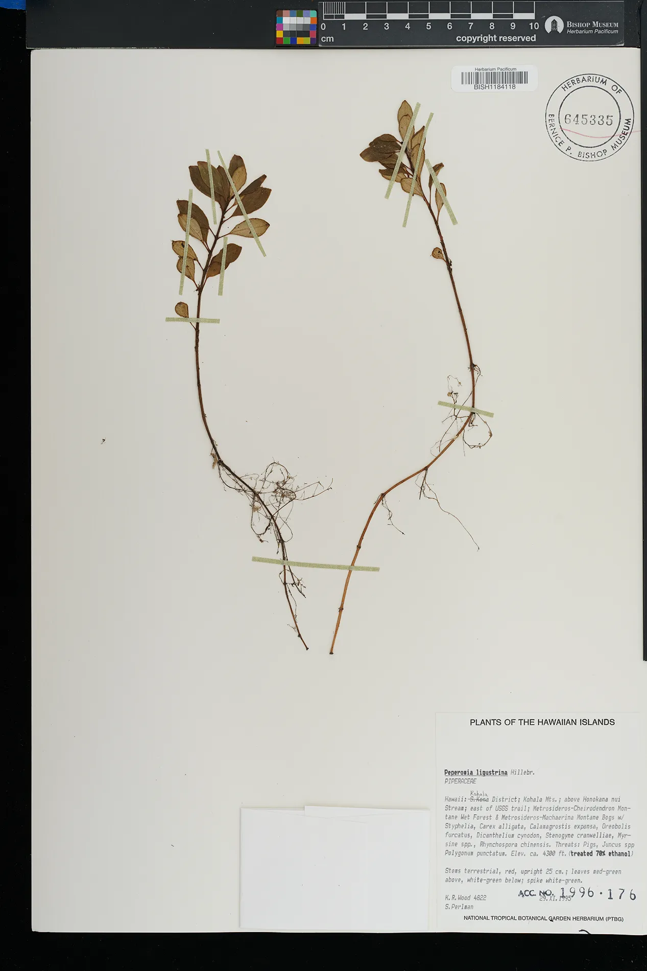 Along perennial stream. Vegetation: Metrosideros/Dicranopteris Lowland Wet Forest with Cheirodendron, Melcope, Broussaisia, Perrottetia, Scaevola, Clermontia, Cibotium, Ilex, Coprosma, Kadua, Diplopterygium, Wikstroemia, Dubautia, Cyrtandra, Sadleria, Amauropelta, Clidemia, Hedychium, Tibouchina, Machaerina, Isachne, Sphenomeris, Peperomia, Pipturus, Paspalum, Axonopus, Cyperus, Juncus |