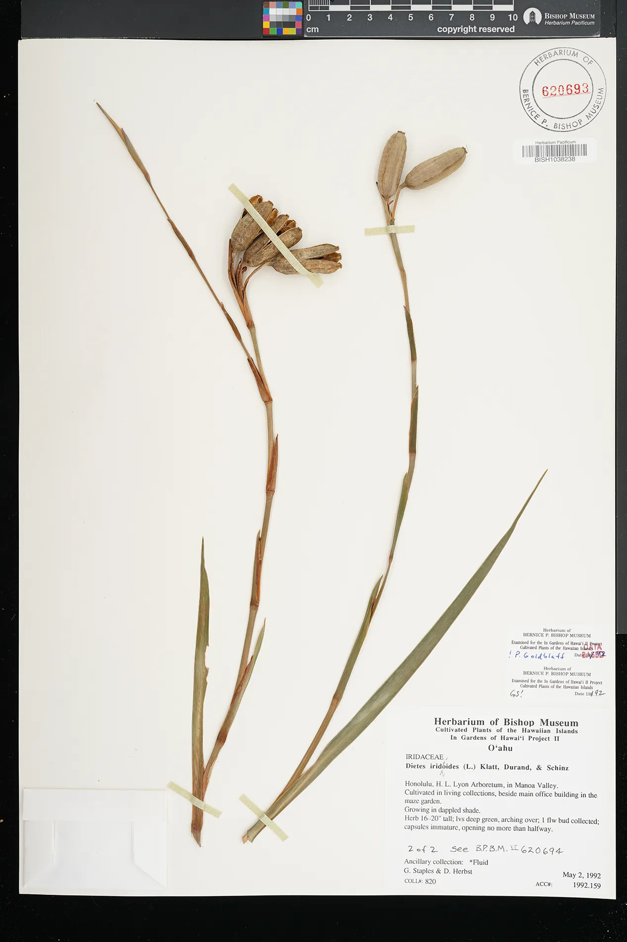 | 2 | Dietes iridioides | (L.) Sweet ex Klatt | honolulu, h.l. lyon arboretum, in manoa valley | Cultvated in living collections, beside main office building in the maze garden. Growing in dappled shade. | PRESERVED_SPECIMEN | staples, g.w. herbst, d.r. | collector number: 820 | Oahu | BISH | 5/2/1992 |