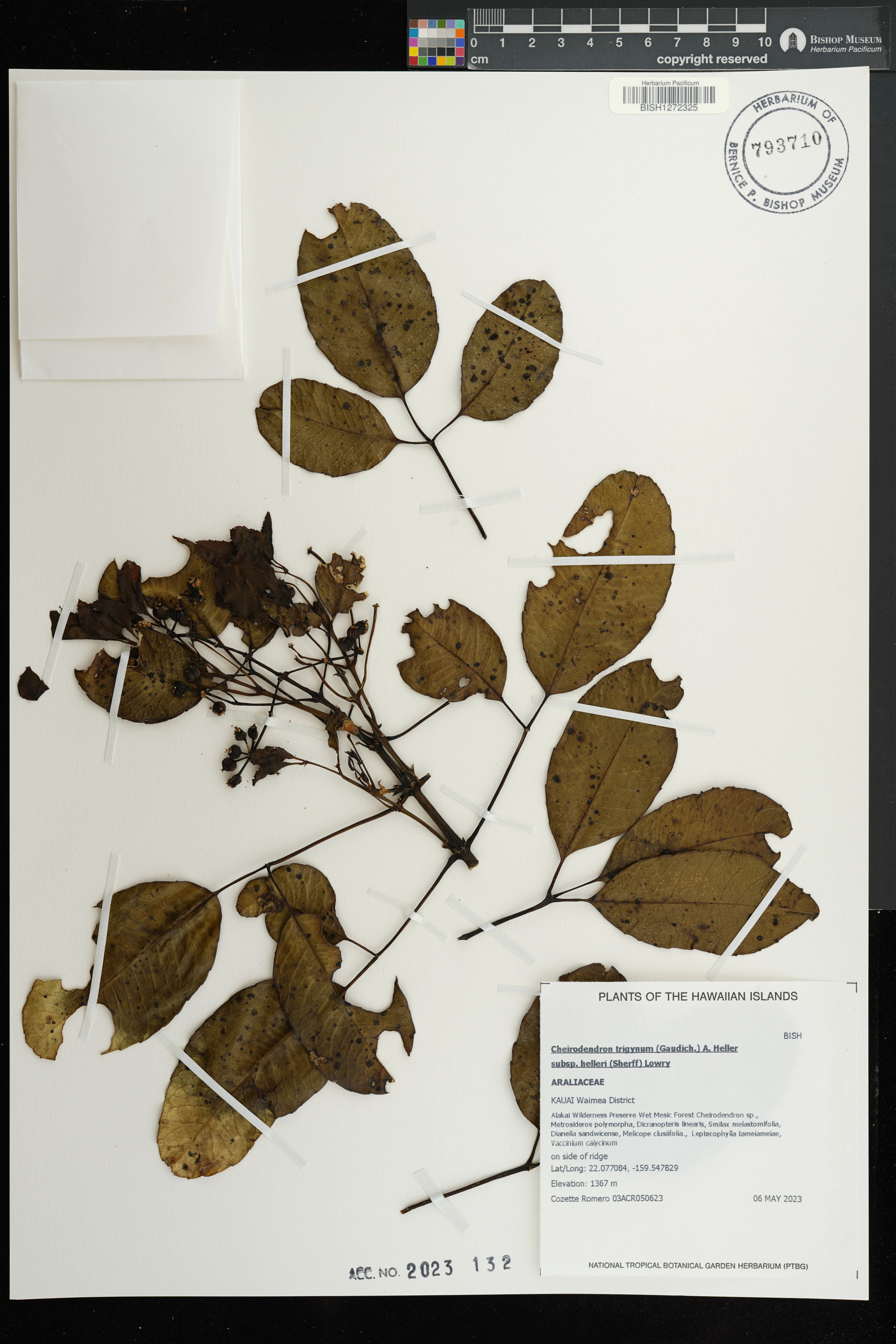 About 0.25 mils in Metrosideros-Dicranopteris linearis wet forest. With Cheirodendron spp., Scaevola procera, Bobea brevipes, Dodonaea viscosa, Ilex anomala, Coprosma kauaensis, Nestegis sandwicensis, Leptecophylla tameiameiae, Psychotria greenwelliae, Santalum f.v. |