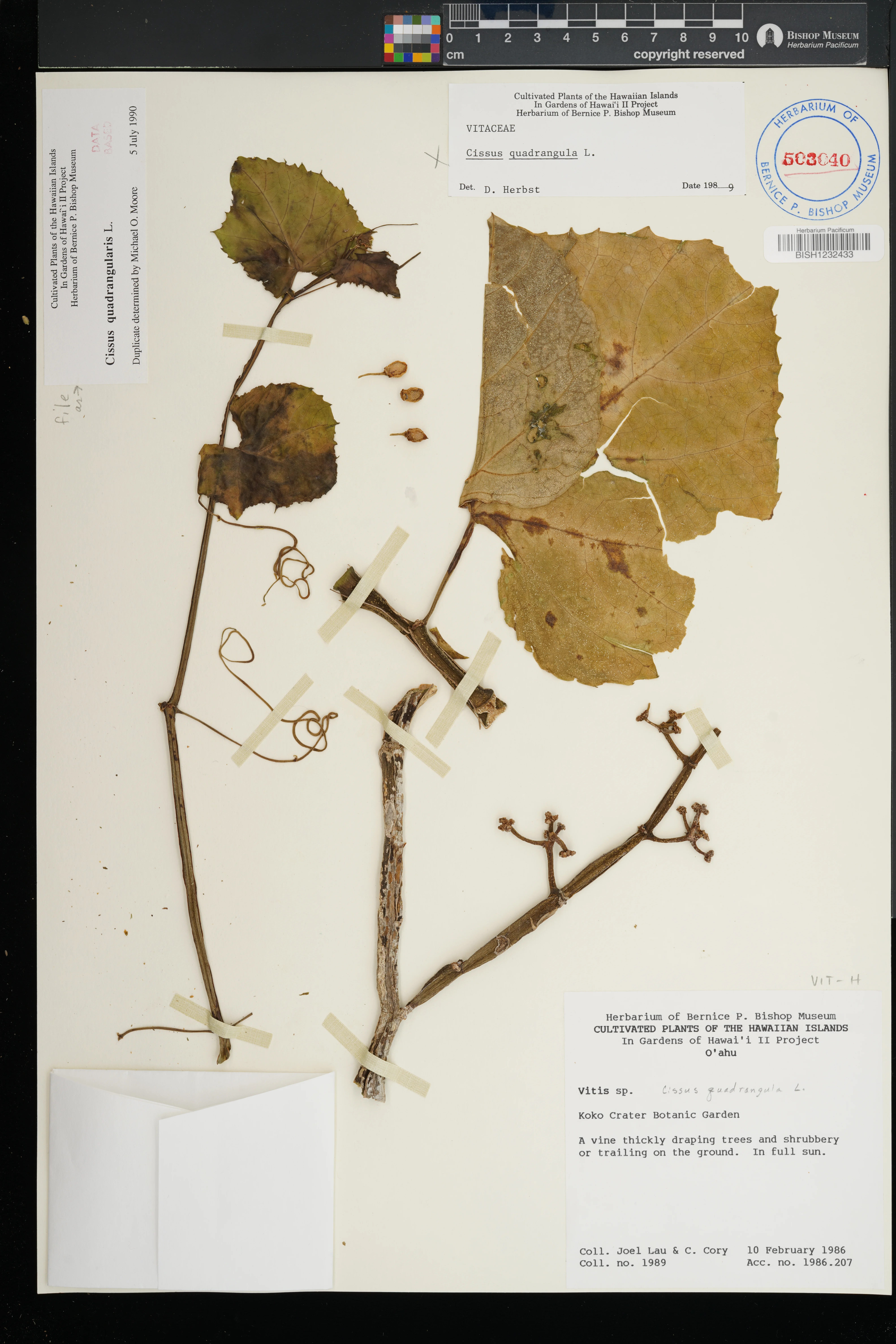 | 4 | Cissus quadrangularis | L. | koko crater botanic garden | A vine thickly draping trees and shrubbery or trailing on the ground. In full sun. | PRESERVED_SPECIMEN | lau, j. cory, c. | collector number: 1989 | Oahu | BISH | 2/10/1986 |
