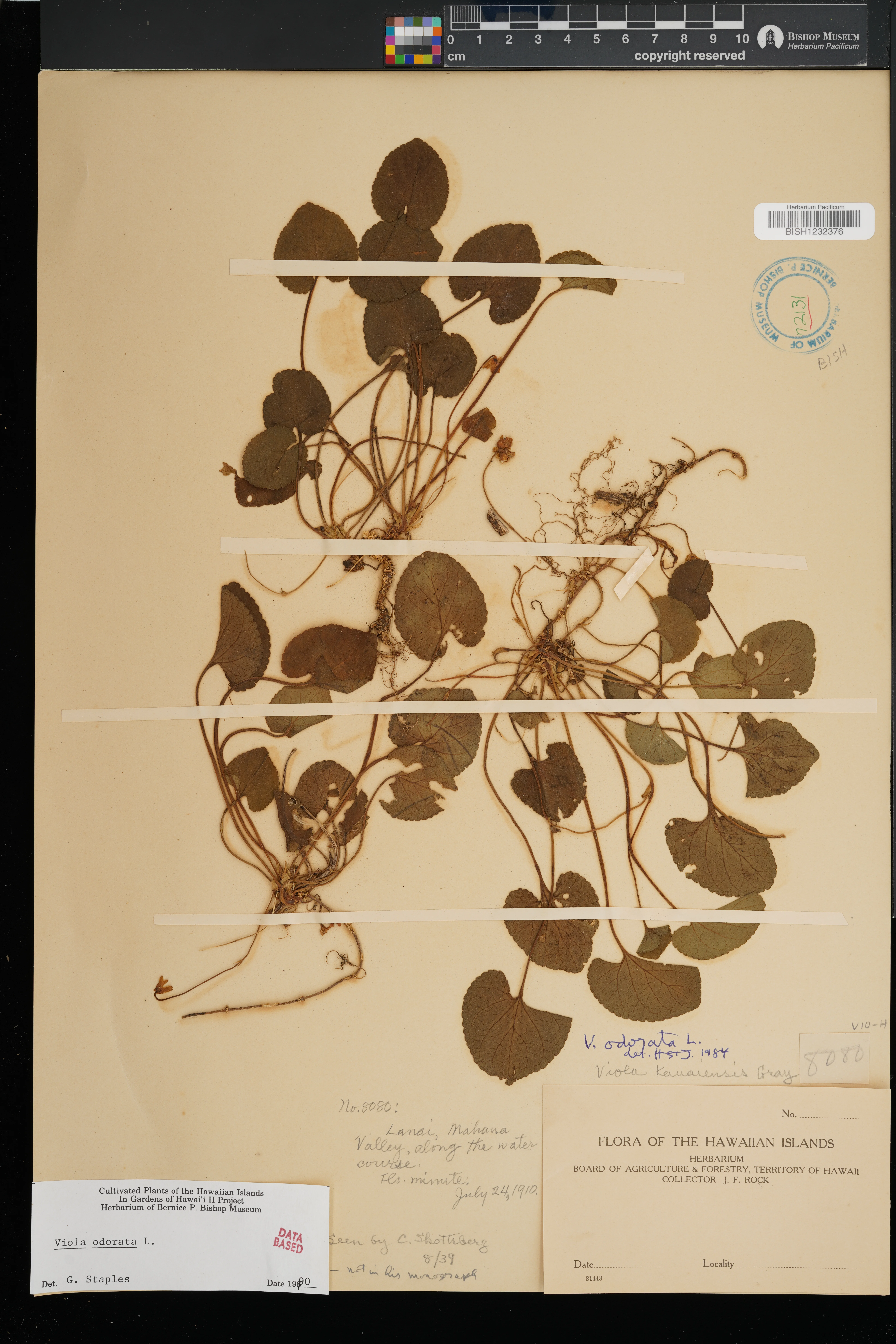 | 7 | Viola odorata | L. | mahana | PRESERVED_SPECIMEN | rock, j.f.c. | collector number: 8080 | Lanai | BISH | 7/24/1910 | |