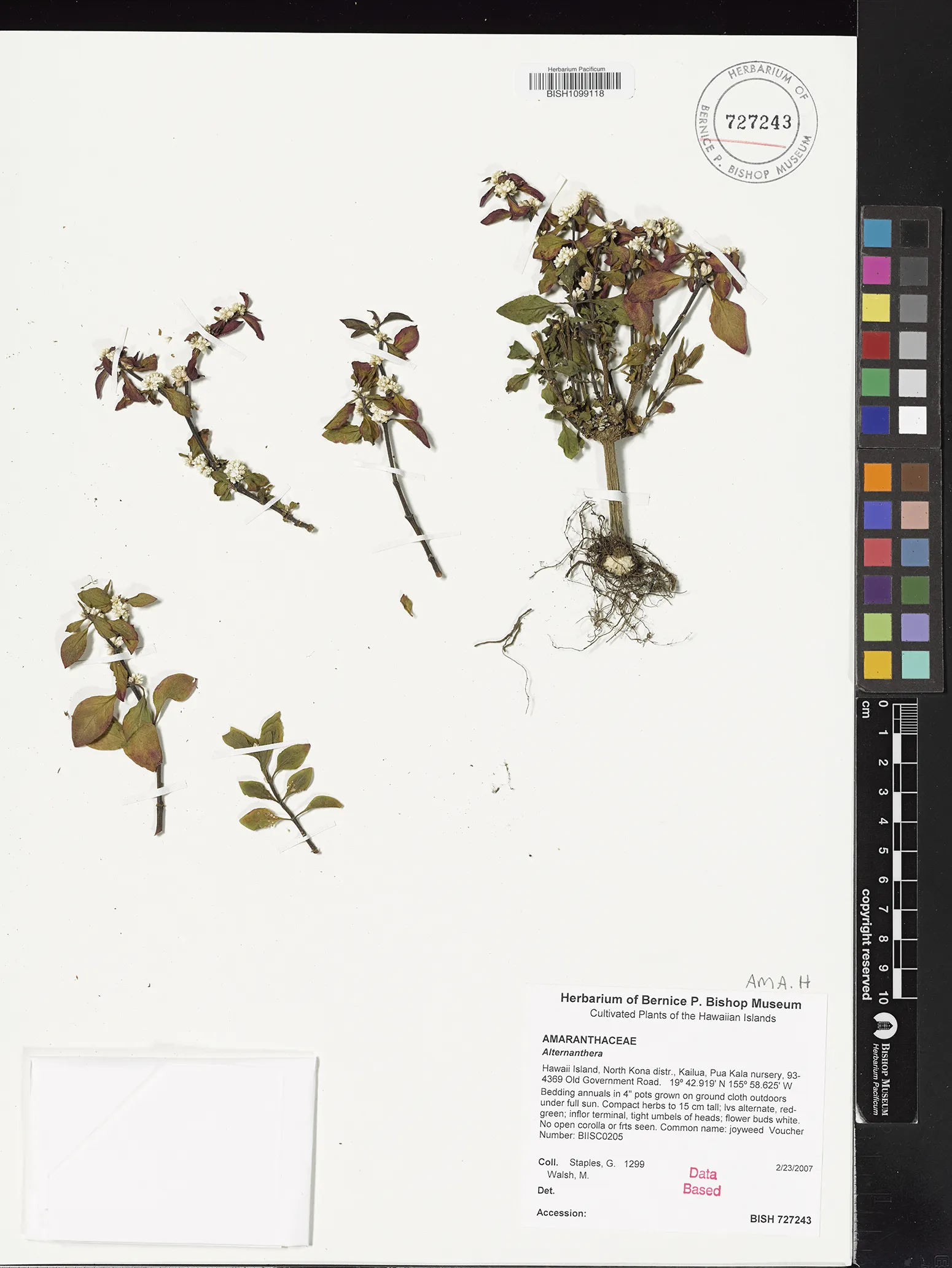 Kingdom: Viridiplantae Phylum: Magnoliophyta Class/Clade: Eudicot-CoreEudicot Order: Caryophyllales Family: Amaranthaceae Genus: Alternanthera