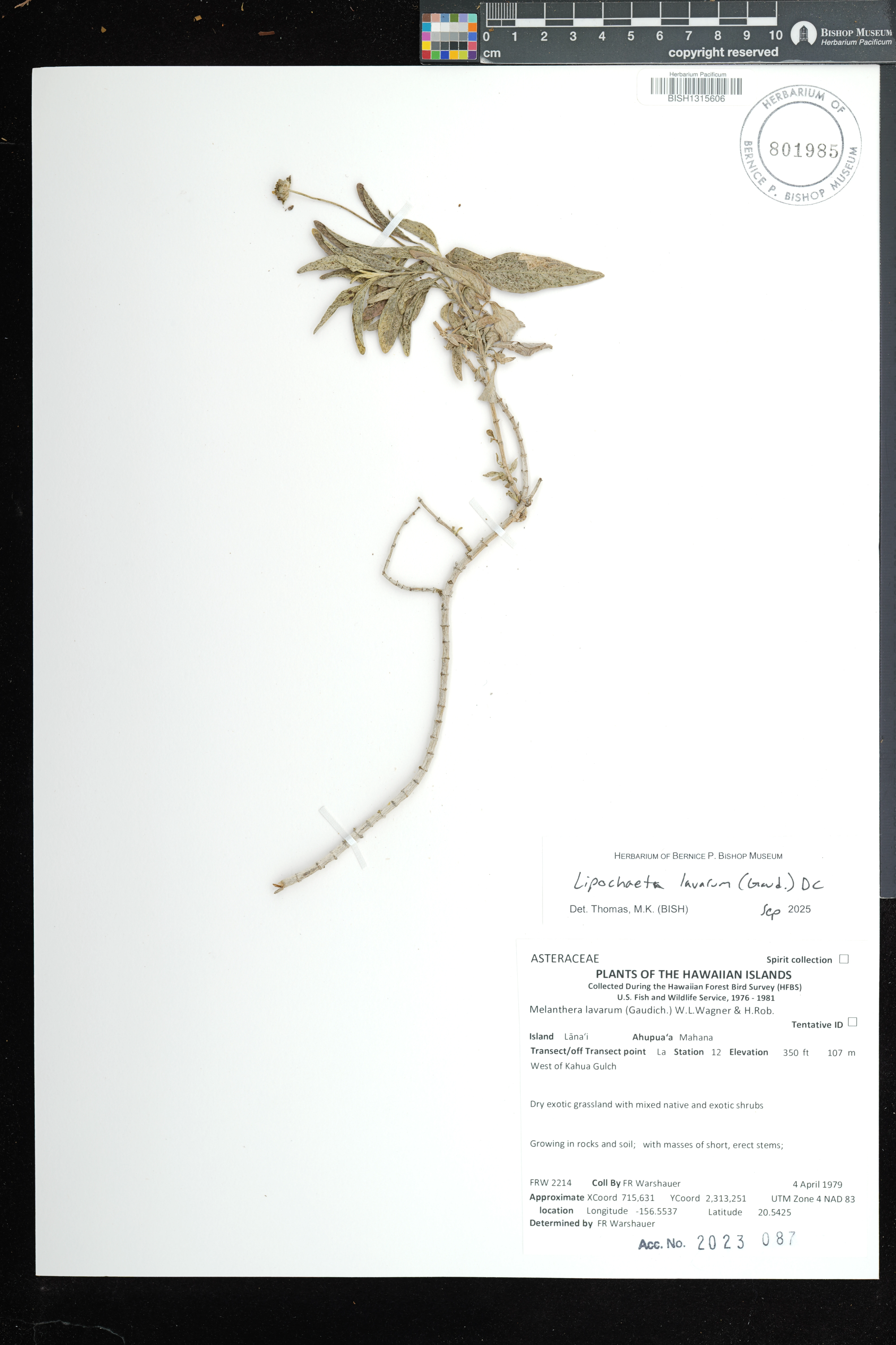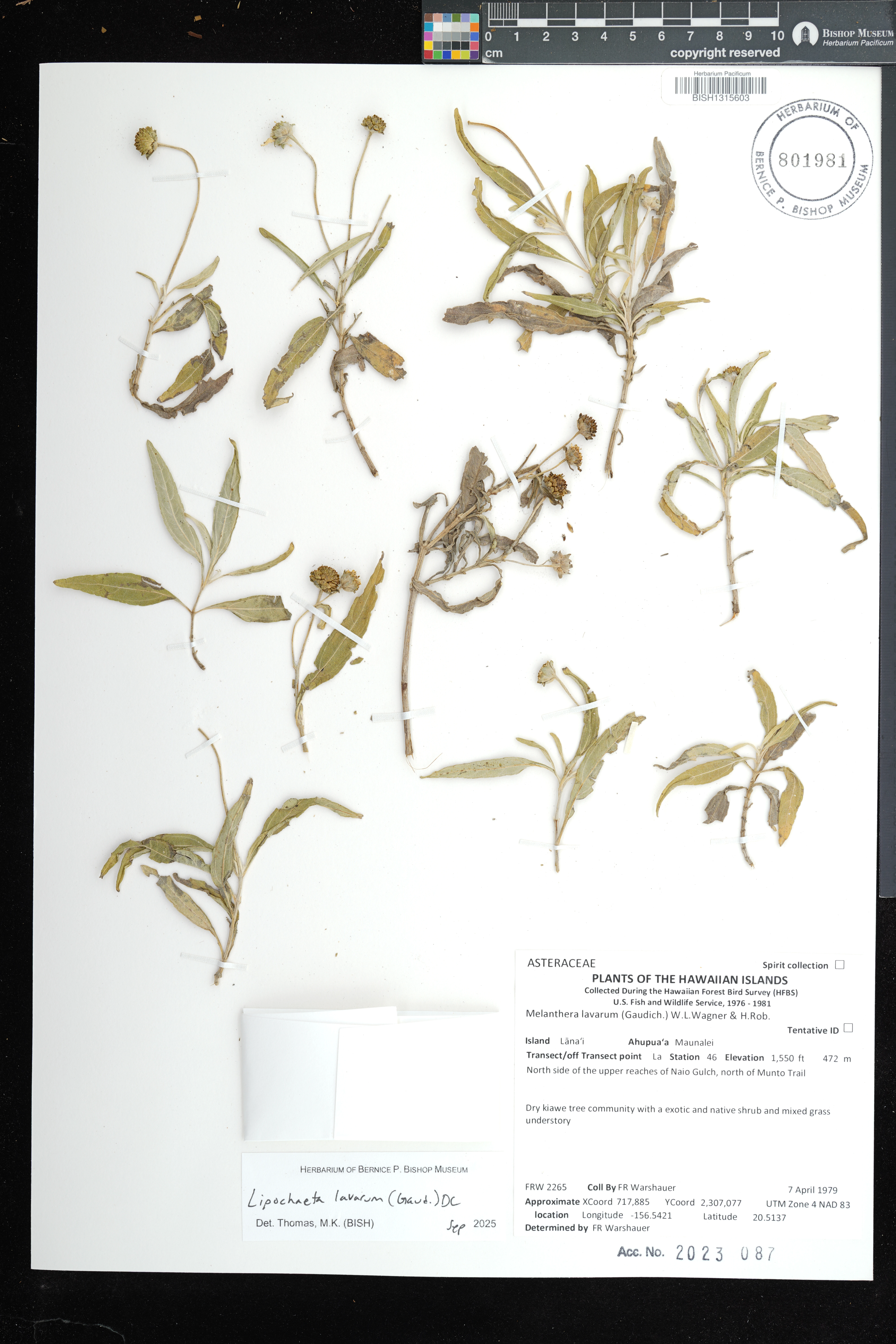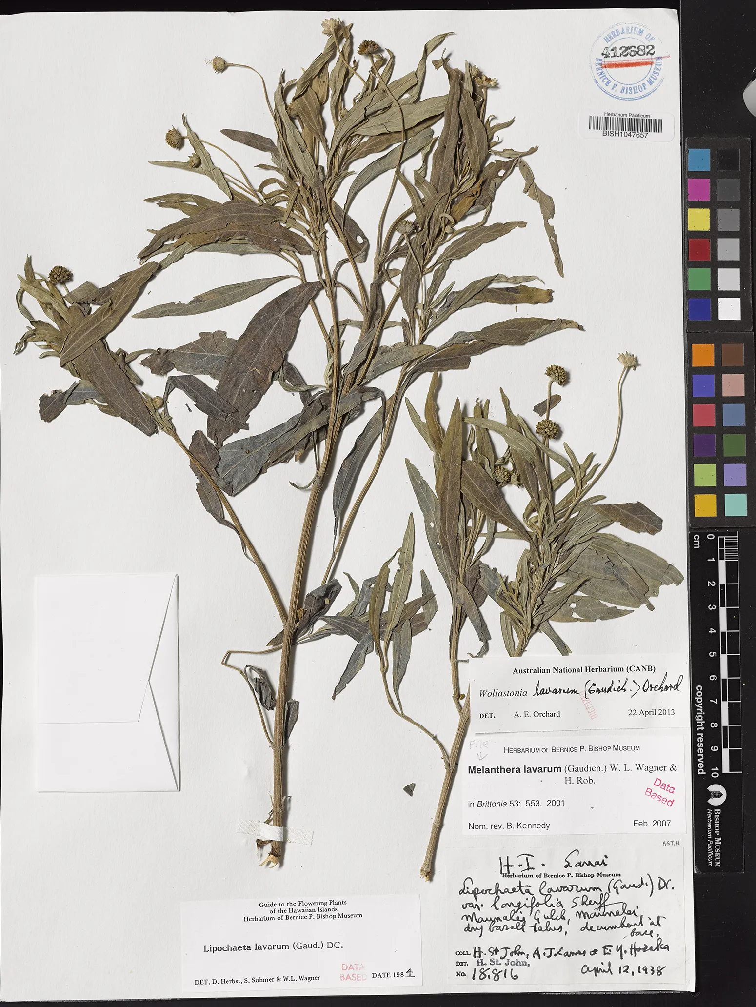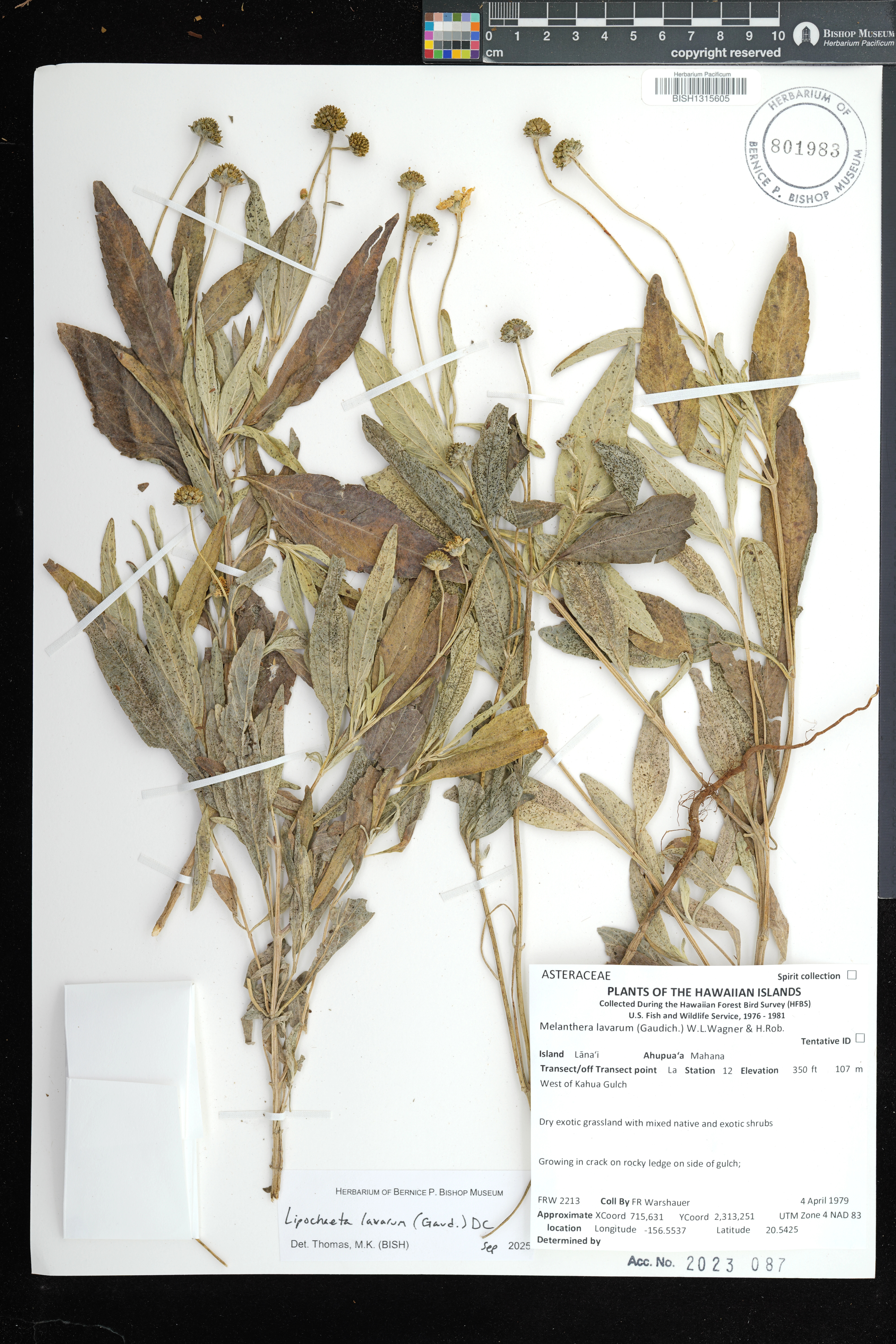 Wagner et al. 1990:337 (Mo, L, M, Ka, H [as L. lavarum]); Wagner & Robinson 2001:553 (COMBNOV, Syn. L. lavarum = Melanthera lavarum); Orchard 2013:400 (COMBNOV, Syn. M. lavarum = Wollastonia lavarum, not followed, KEY); Edwards et al. 2018 (Syn. M. lavarum = L. lavarum)
