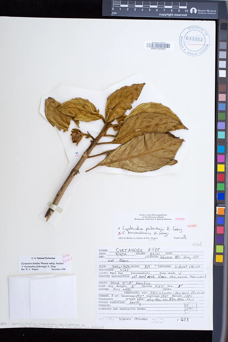 | 2 | Cyrtandra kealiae × Cyrtandra pickeringii | 1st N fork of Wahiawa Stream, NW of Bog | wet; Psidium, Metrosideros, Psychotria, Hedyotis terminalis, Cyanea, Dicranopteris, Labordia hirtella | Preserved_Specimen | Wagner, W.L. | 6058 | Kauai | BISH | 1988-04-10 |