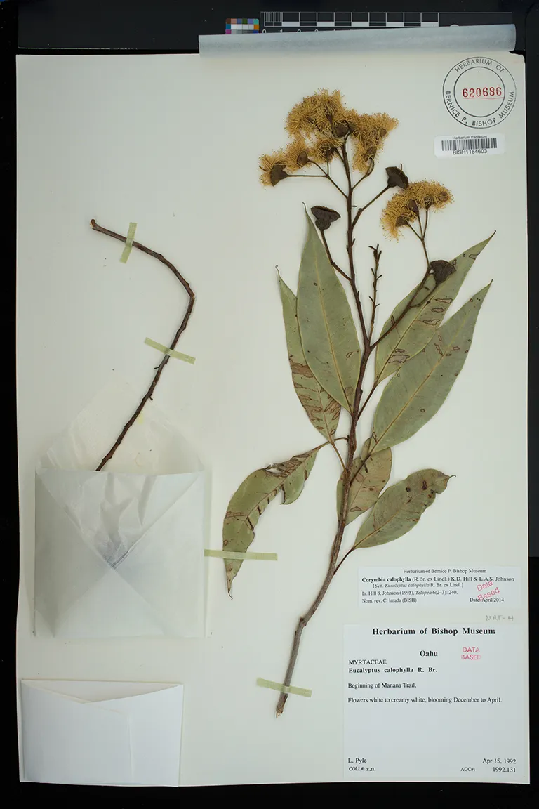 | 5 | Corymbia calophylla | (Lindl.) K.D.Hill & L.A.S.Johnson | Beginning of Manana trail | PRESERVED_SPECIMEN | Pyle, L. | s.n. | Oahu | BISH | 4/15/1992 | |