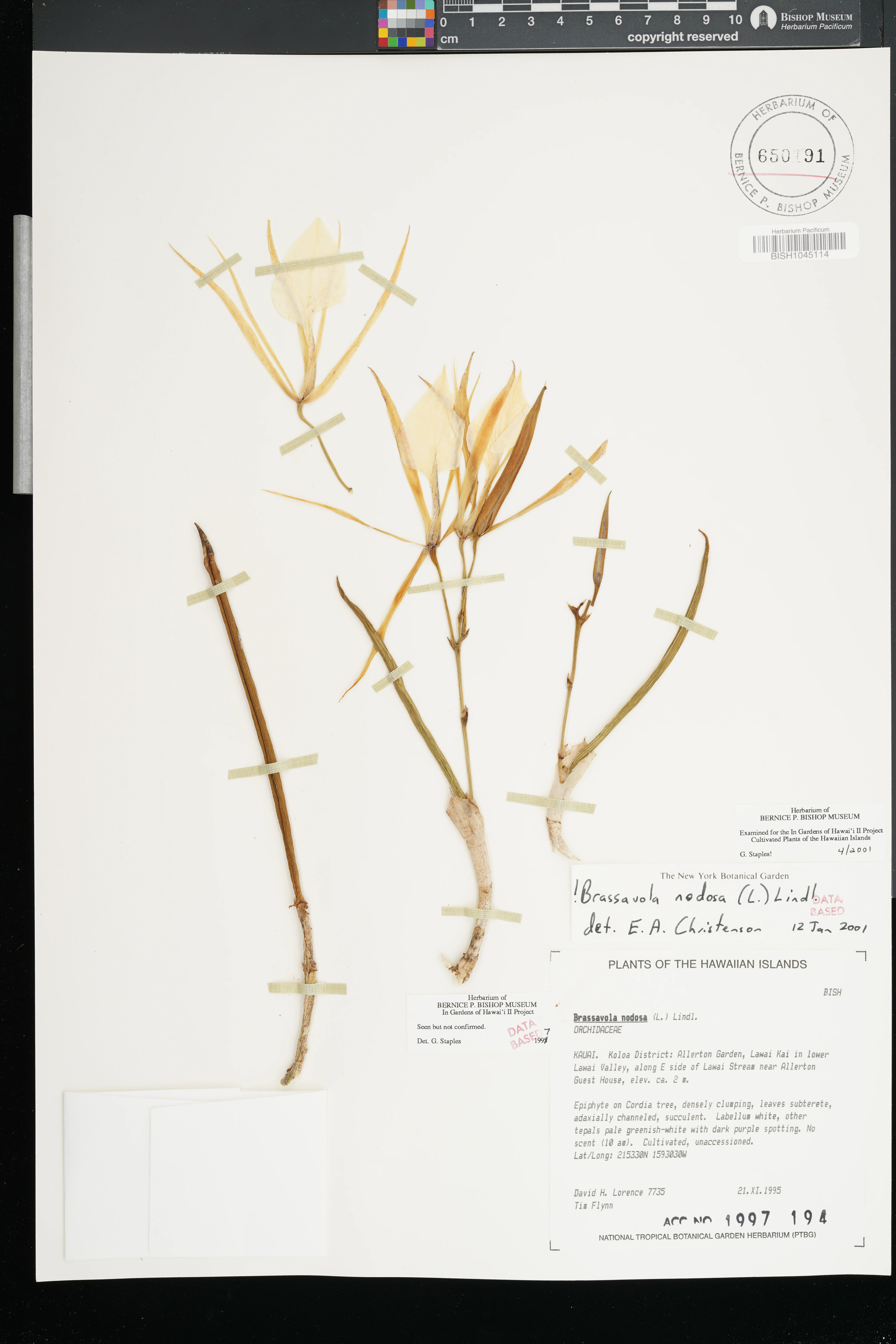 | 3 | Brassavola nodosa | (L.) Lindl. | cultivated at lyon arboretum, manoa, in orchid species garden, on post 5' tall outside lyon library building | PRESERVED_SPECIMEN | staples, g.w. | collector number: 1034 | Maui | BISH | 12/27/1995 | |