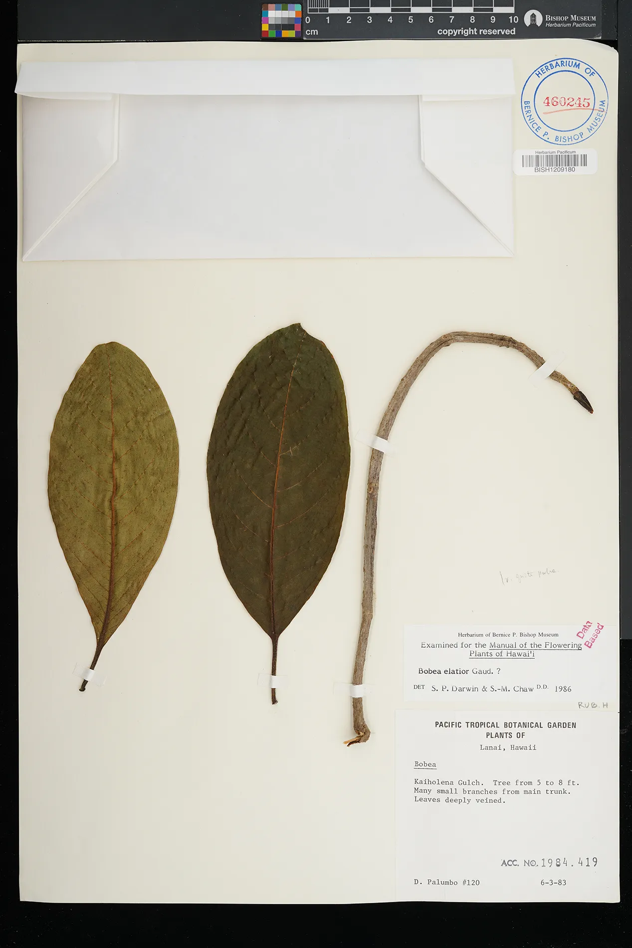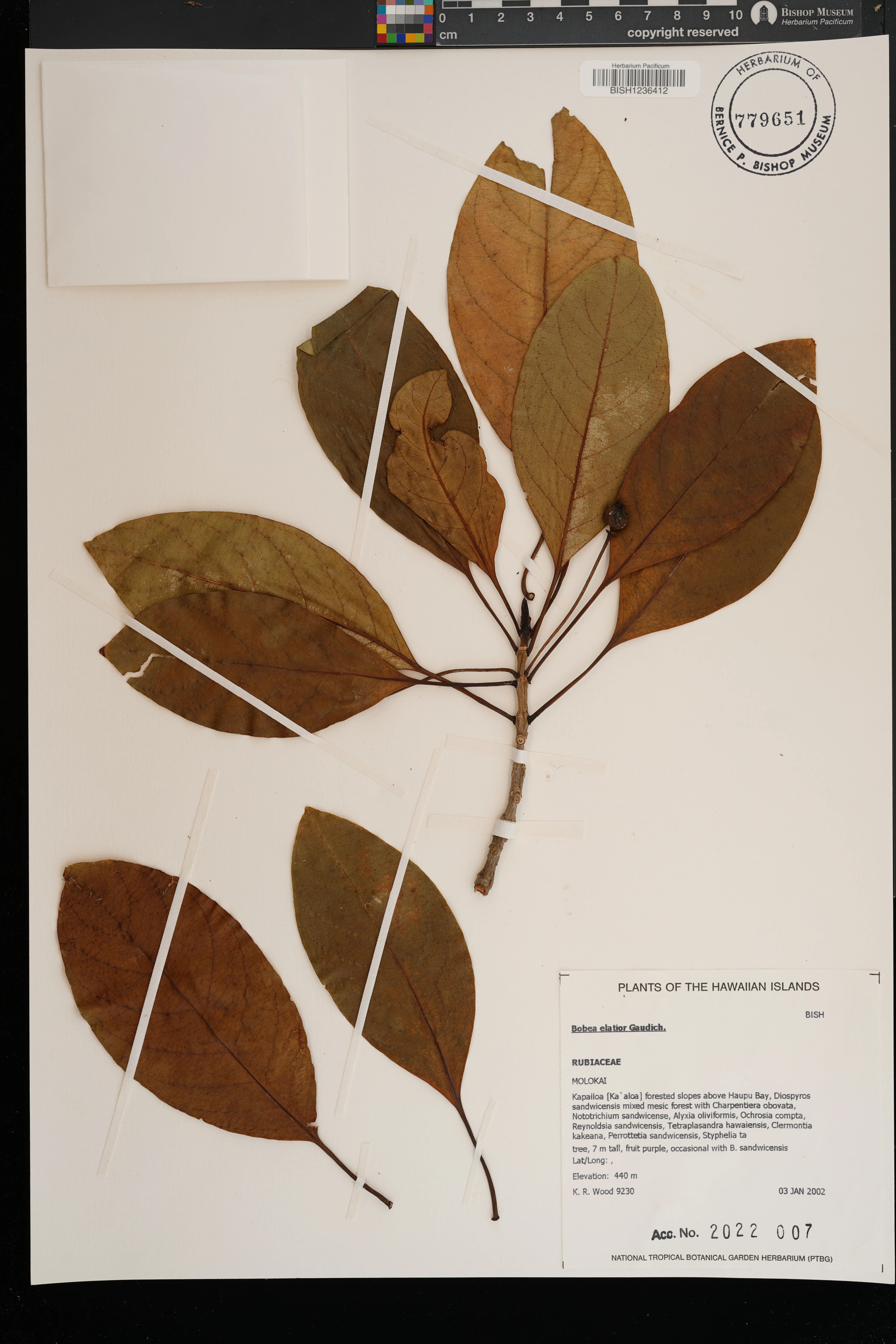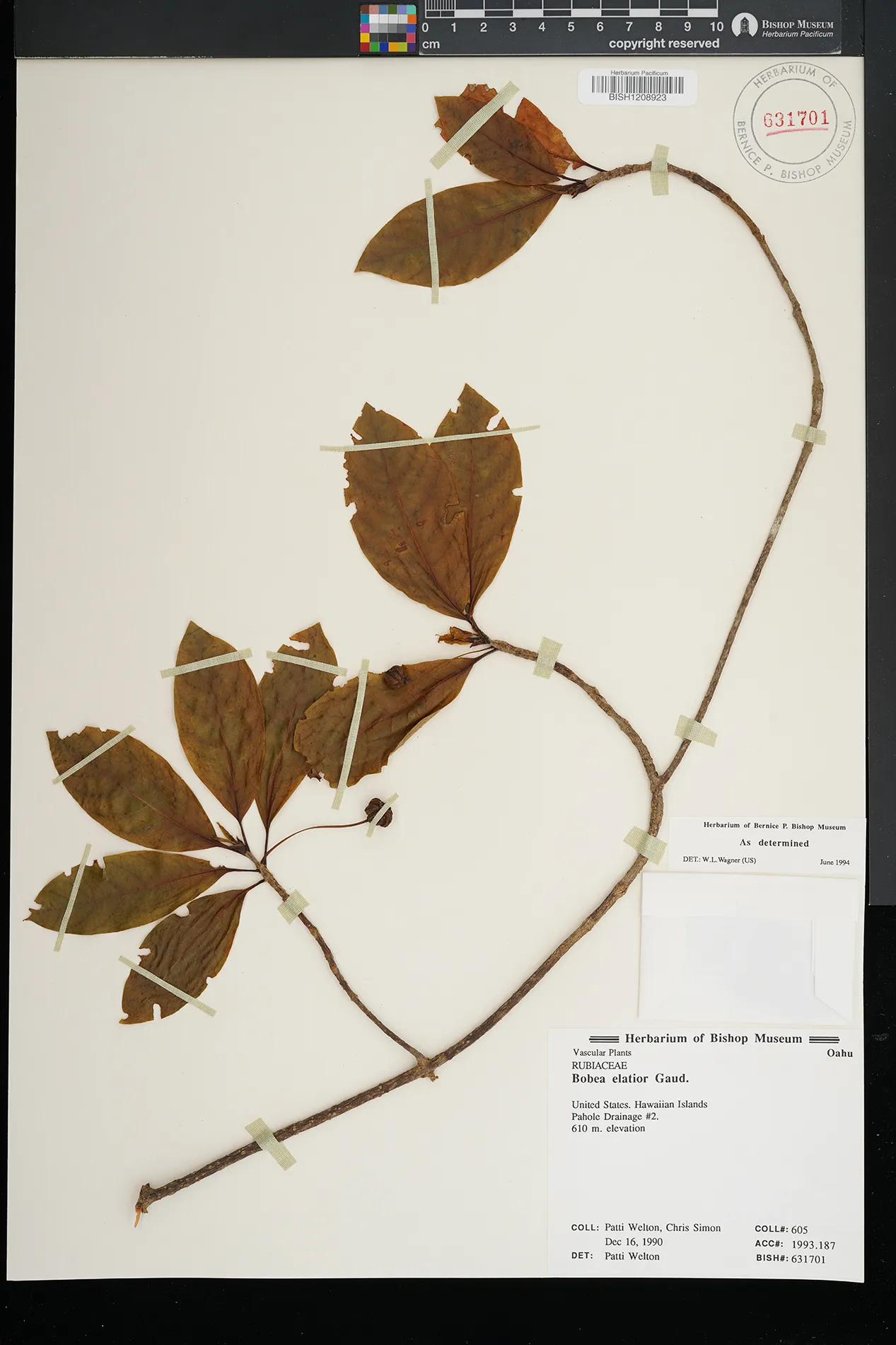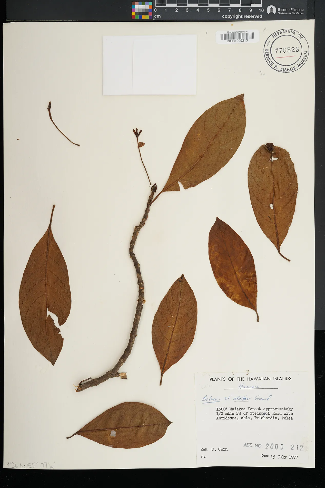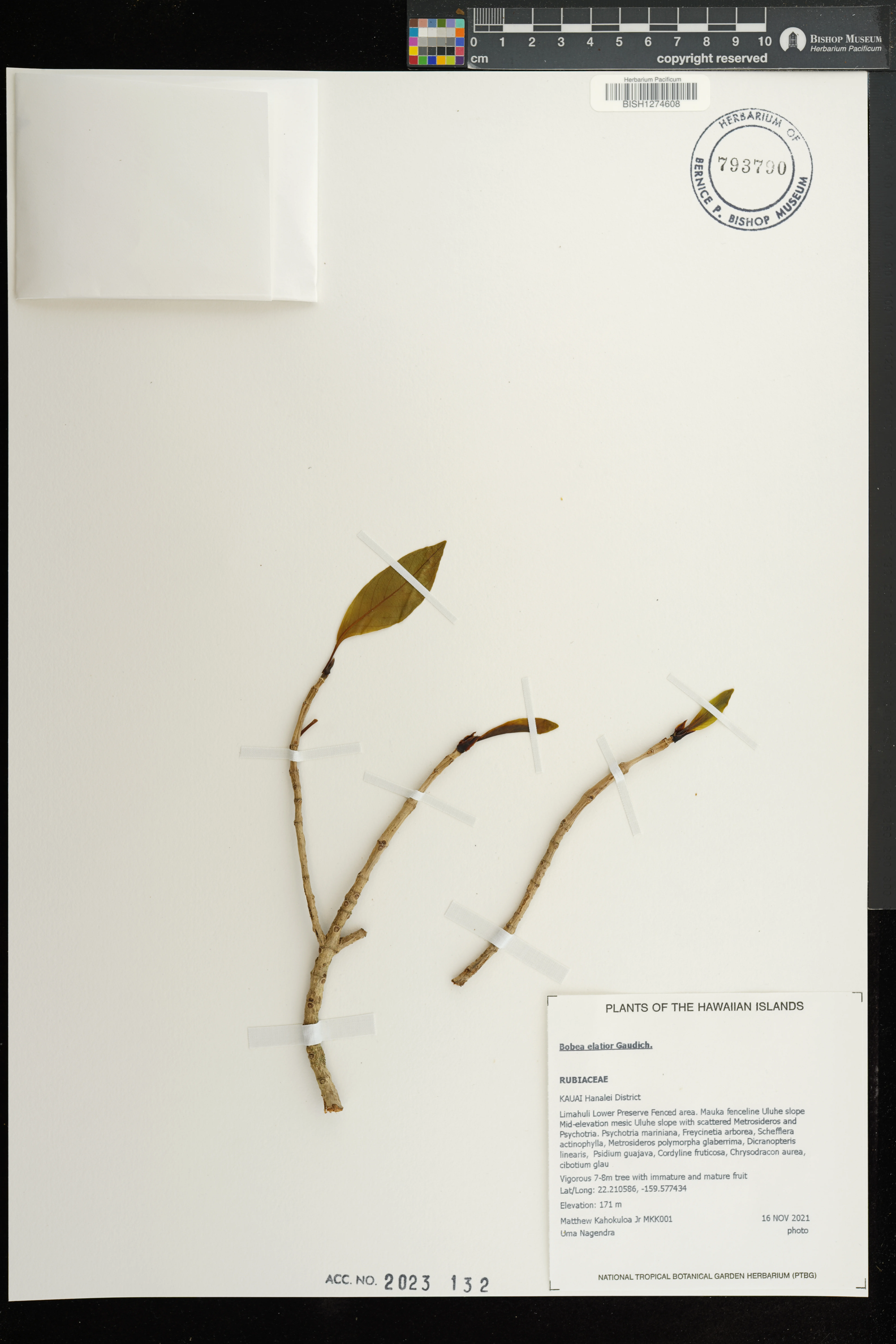 Leaves: Leaves simple. Opposite. Blades elliptic to obovate, (1.5–)3–15 cm long, (1–)4–5.5(–8) cm wide. Apex acute to obtuse. Base acute to long–attenuate. Surfaces usually glabrous, domatia somewhat elevated, porate, subglabrous, often scattered over blade, or sometimes absent chartaceous to subcoriaceous. Margins entire. Secondary veins 7–10 on each side of midrib, often reddish pellucid. Petioles (5–)10–25(–50) mm long, sometimes winged distally, glabrous. Stipules ovate to lanceolate, strongly imbricate in bud, 7–22 mm long, 4–9 mm wide, acute to acuminate, upper surface villous toward base, lower surface glabrous or slightly pubescent toward apex.