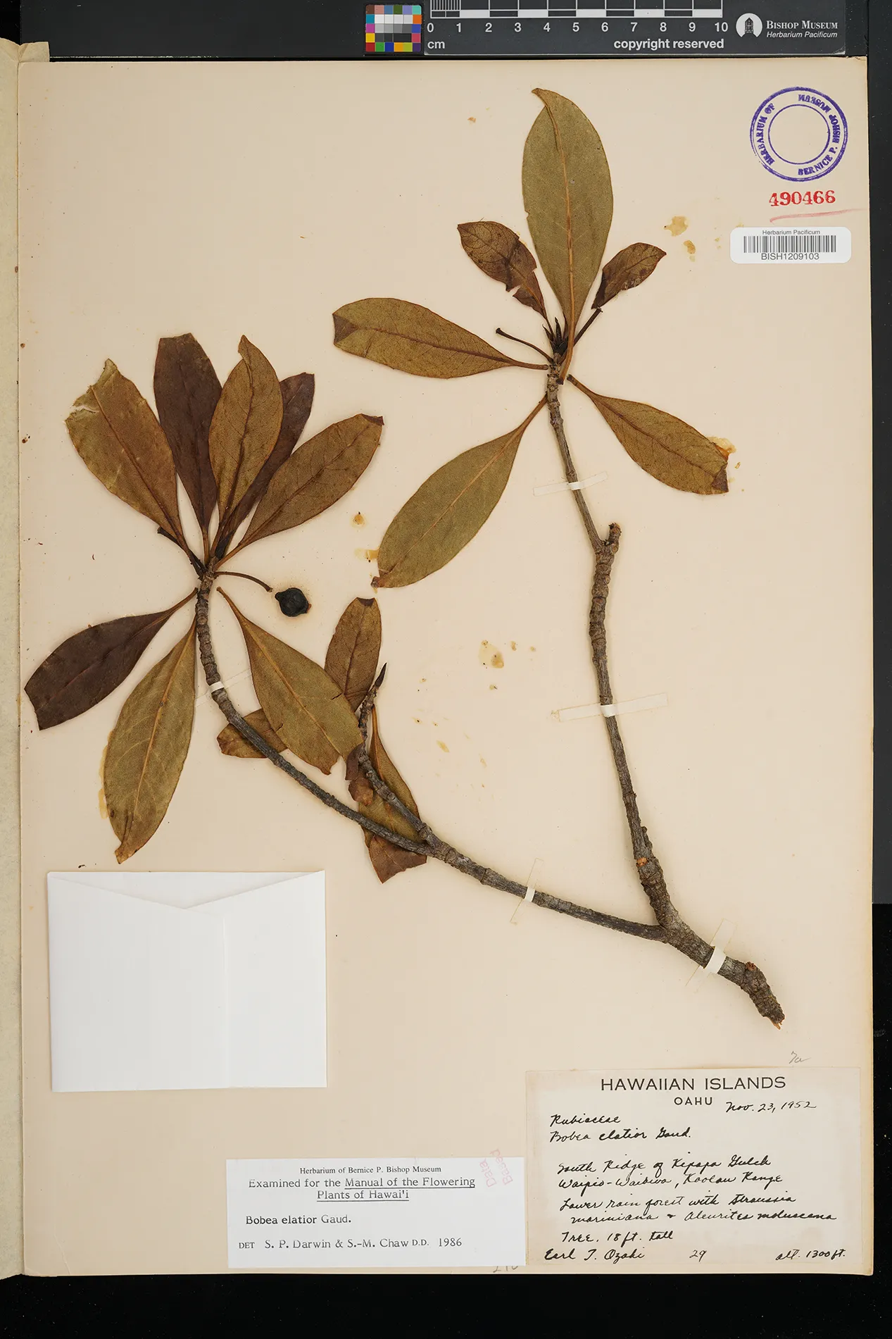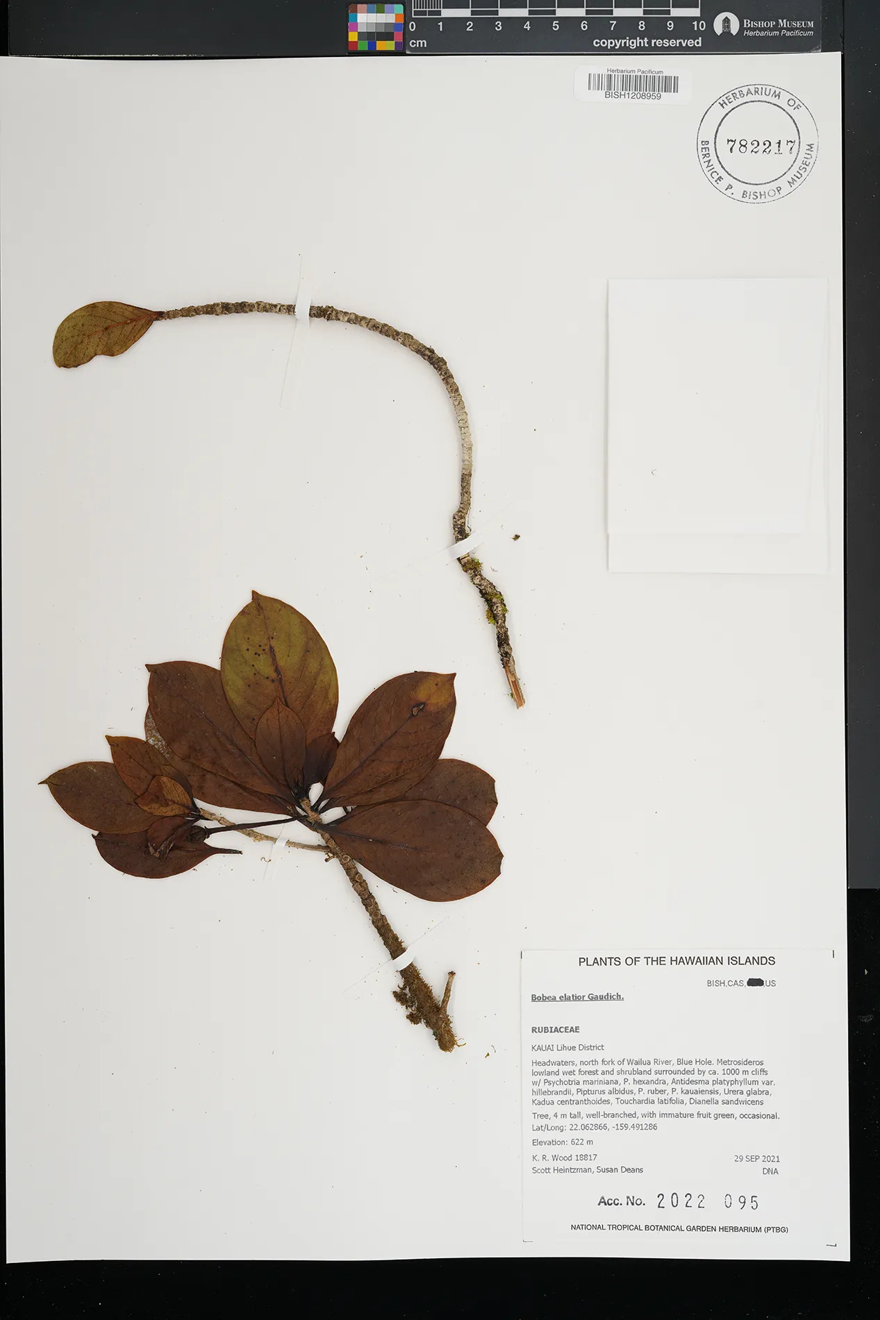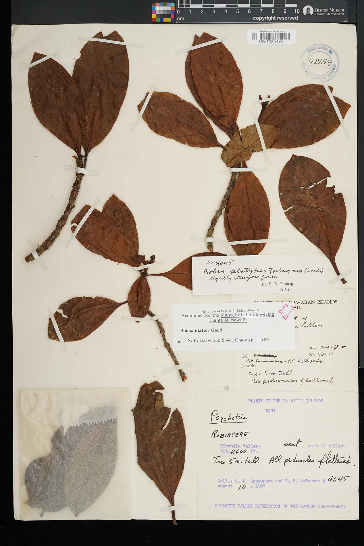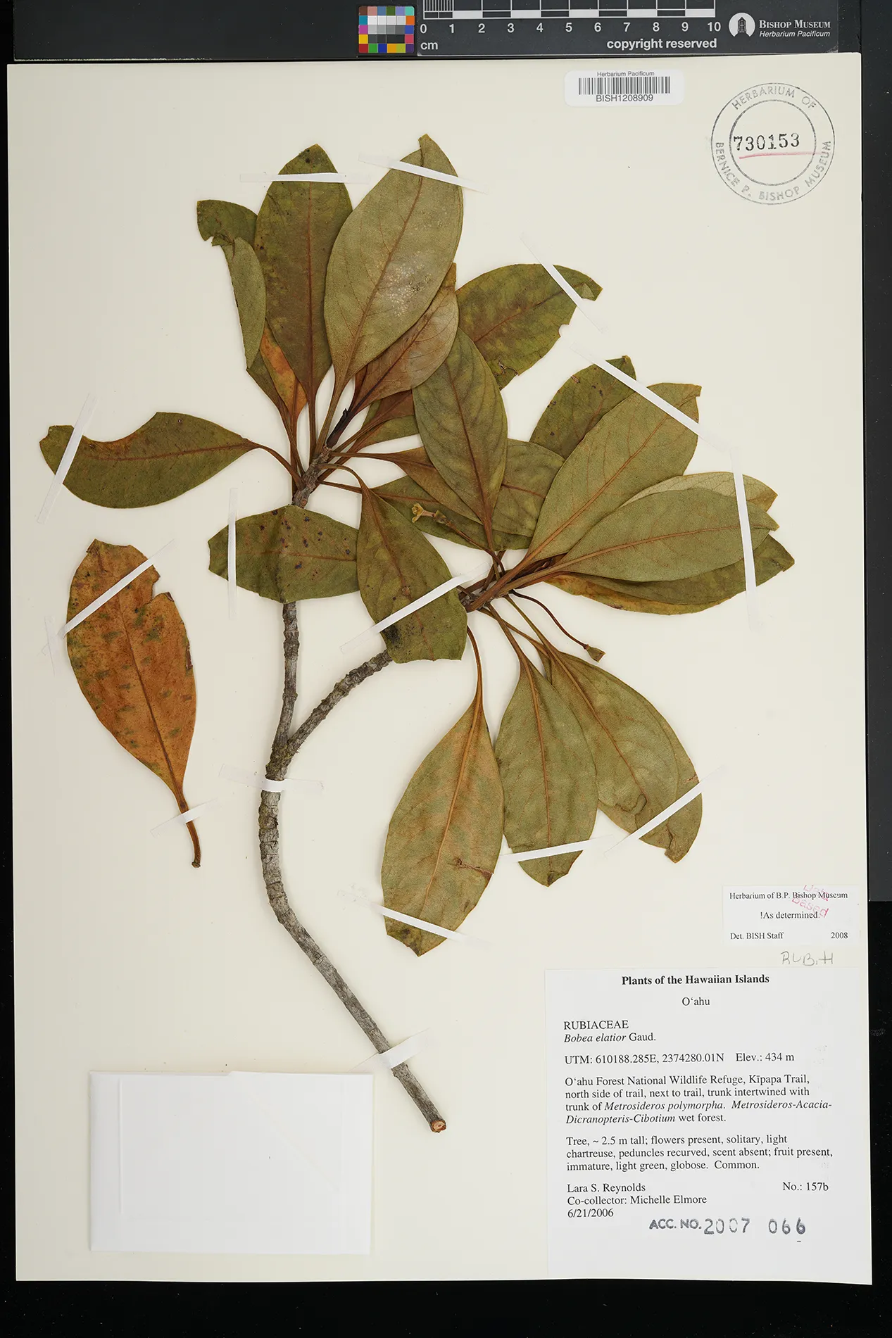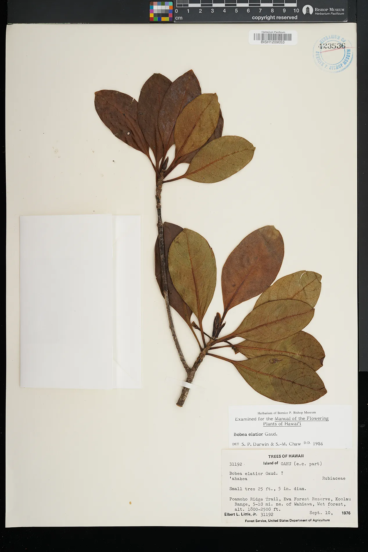 Leaves: Leaves simple. Opposite. Blades elliptic to obovate, (1.5–)3–15 cm long, (1–)4–5.5(–8) cm wide. Apex acute to obtuse. Base acute to long–attenuate. Surfaces usually glabrous, domatia somewhat elevated, porate, subglabrous, often scattered over blade, or sometimes absent chartaceous to subcoriaceous. Margins entire. Secondary veins 7–10 on each side of midrib, often reddish pellucid. Petioles (5–)10–25(–50) mm long, sometimes winged distally, glabrous. Stipules ovate to lanceolate, strongly imbricate in bud, 7–22 mm long, 4–9 mm wide, acute to acuminate, upper surface villous toward base, lower surface glabrous or slightly pubescent toward apex.