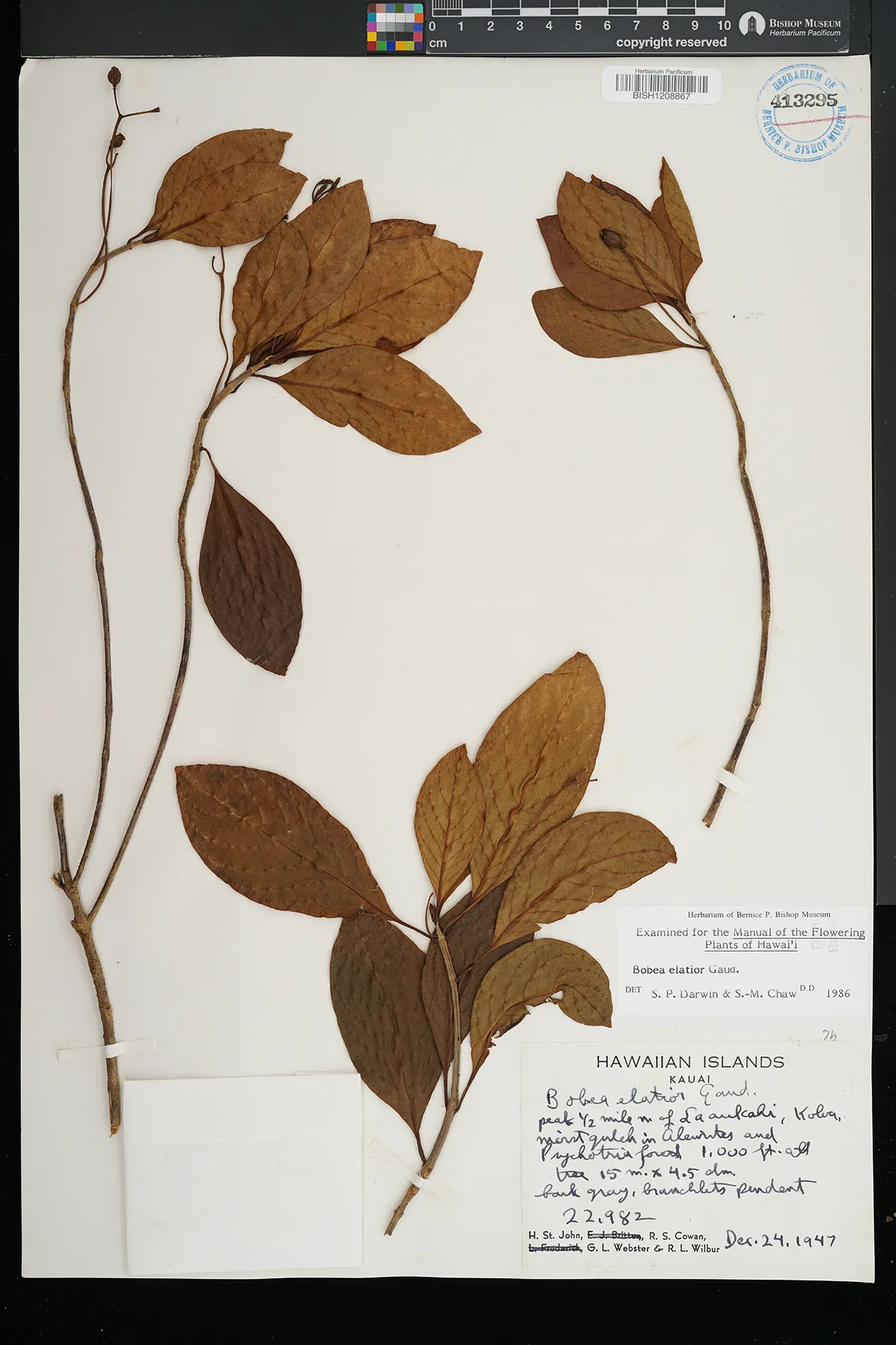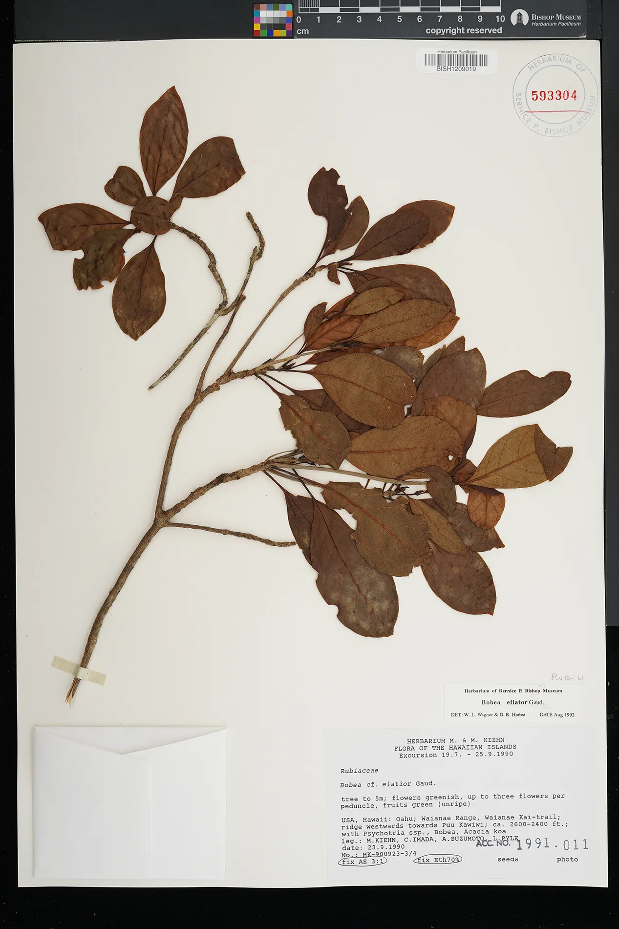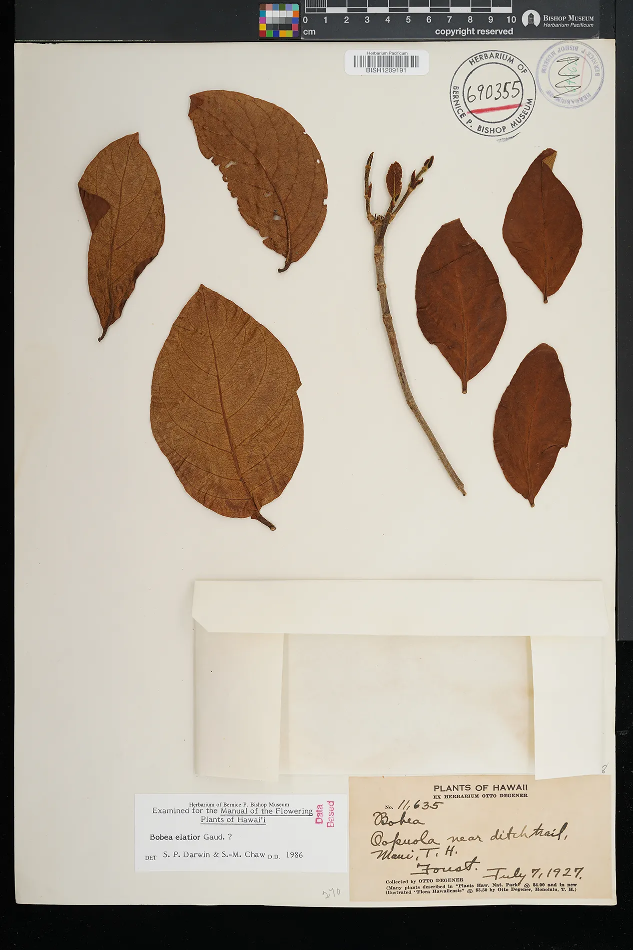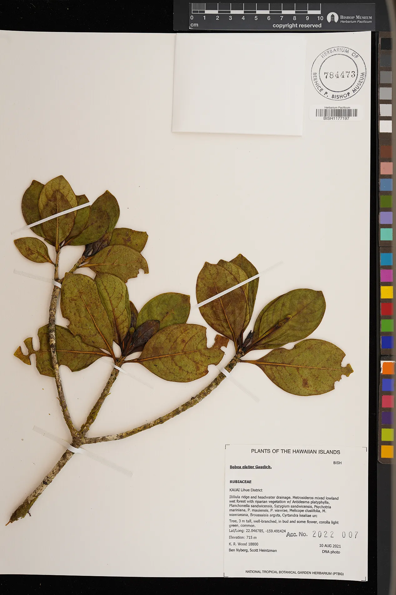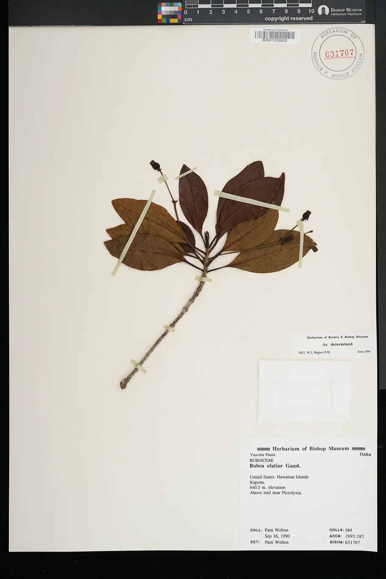 Leaves: Leaves simple. Opposite. Blades elliptic to obovate, (1.5–)3–15 cm long, (1–)4–5.5(–8) cm wide. Apex acute to obtuse. Base acute to long–attenuate. Surfaces usually glabrous, domatia somewhat elevated, porate, subglabrous, often scattered over blade, or sometimes absent chartaceous to subcoriaceous. Margins entire. Secondary veins 7–10 on each side of midrib, often reddish pellucid. Petioles (5–)10–25(–50) mm long, sometimes winged distally, glabrous. Stipules ovate to lanceolate, strongly imbricate in bud, 7–22 mm long, 4–9 mm wide, acute to acuminate, upper surface villous toward base, lower surface glabrous or slightly pubescent toward apex.