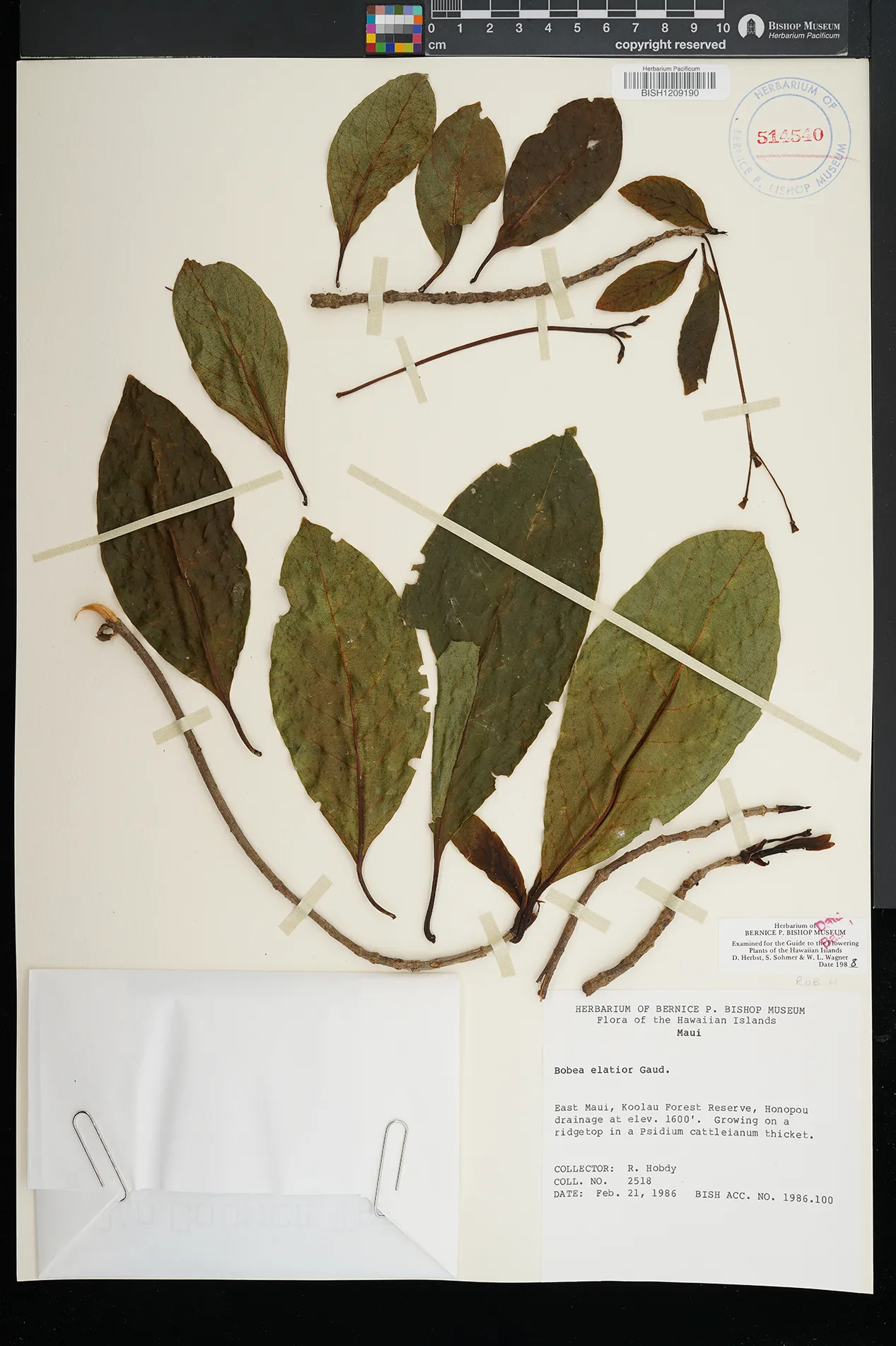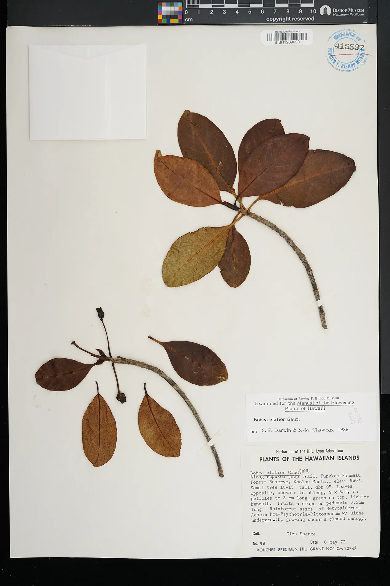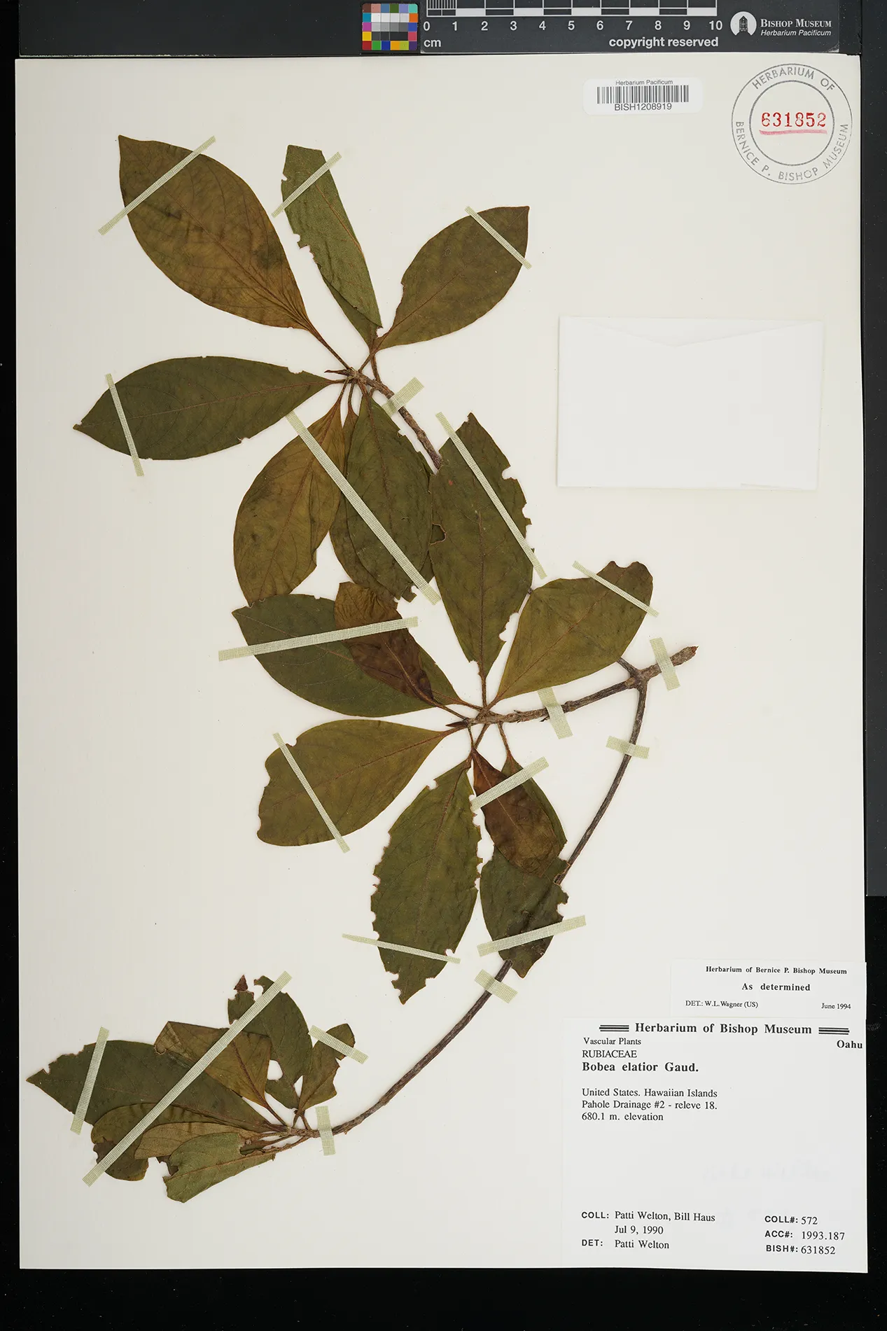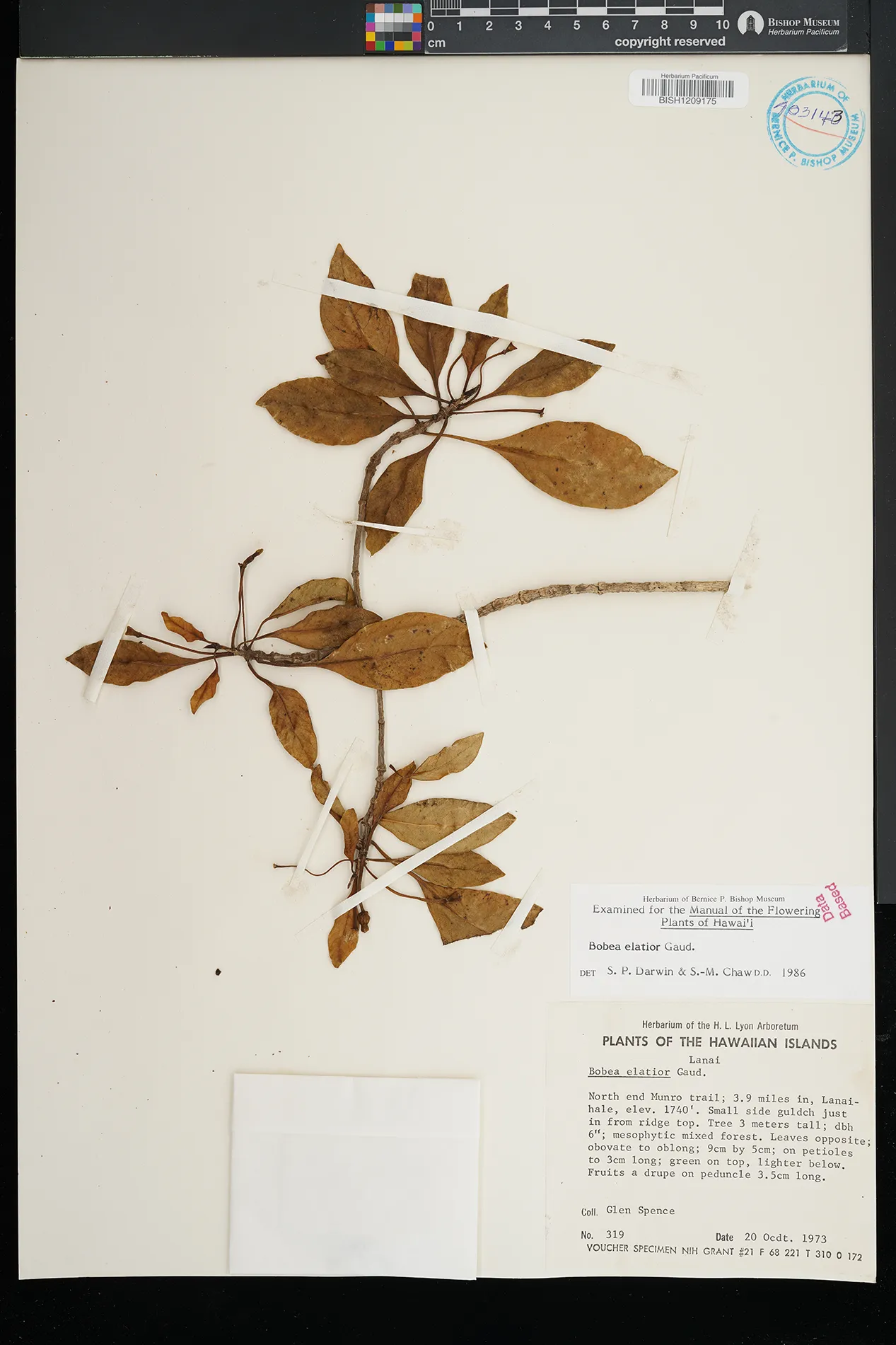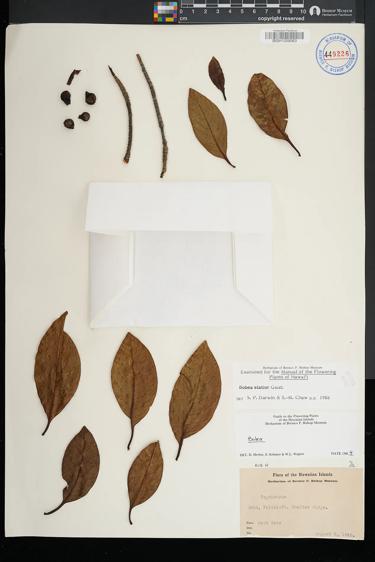 Leaves: Leaves simple. Opposite. Blades elliptic to obovate, (1.5–)3–15 cm long, (1–)4–5.5(–8) cm wide. Apex acute to obtuse. Base acute to long–attenuate. Surfaces usually glabrous, domatia somewhat elevated, porate, subglabrous, often scattered over blade, or sometimes absent chartaceous to subcoriaceous. Margins entire. Secondary veins 7–10 on each side of midrib, often reddish pellucid. Petioles (5–)10–25(–50) mm long, sometimes winged distally, glabrous. Stipules ovate to lanceolate, strongly imbricate in bud, 7–22 mm long, 4–9 mm wide, acute to acuminate, upper surface villous toward base, lower surface glabrous or slightly pubescent toward apex.