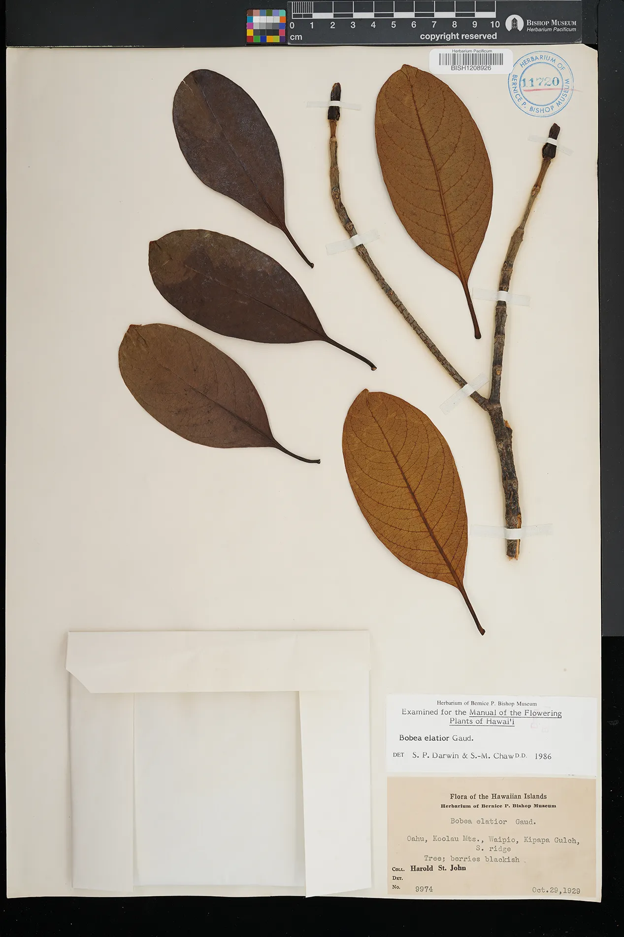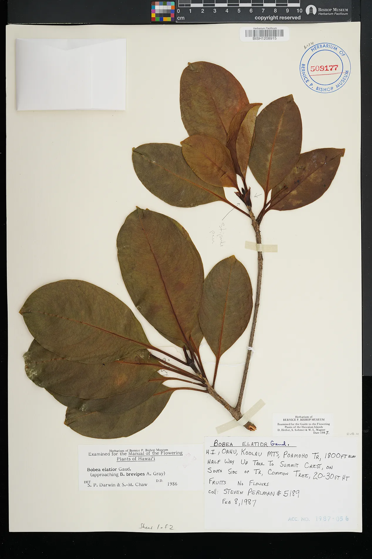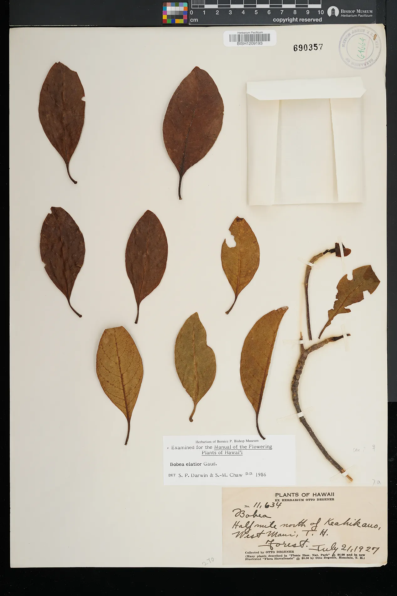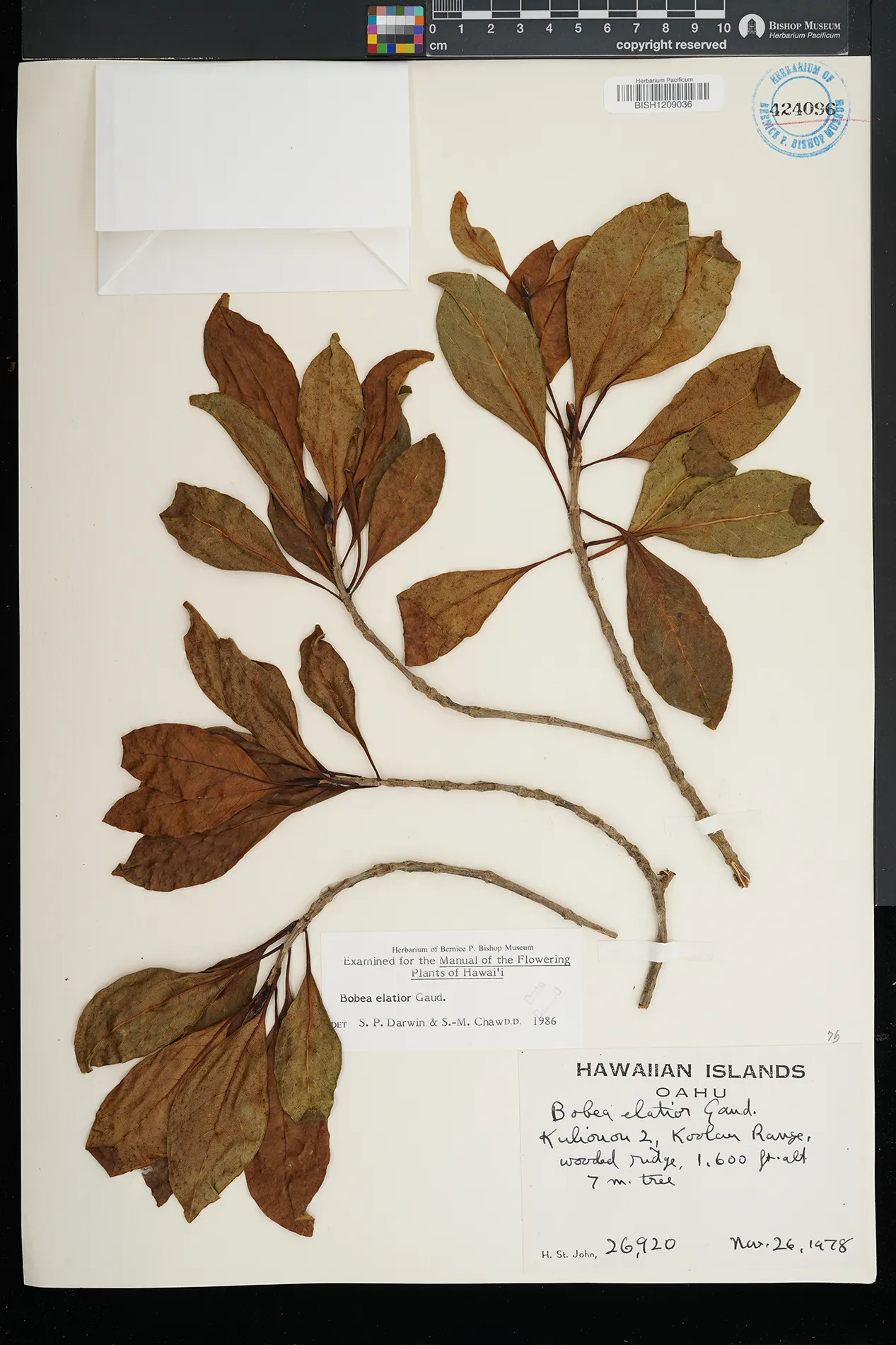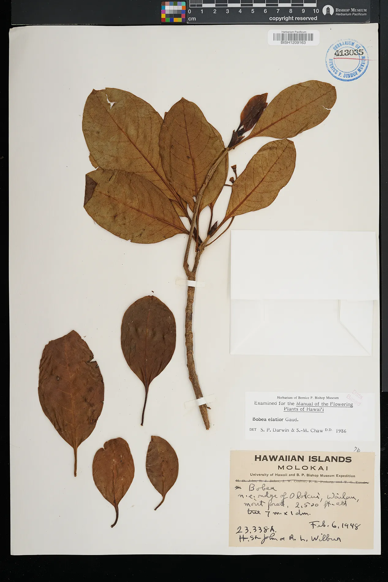 Leaves: Leaves simple. Opposite. Blades elliptic to obovate, (1.5–)3–15 cm long, (1–)4–5.5(–8) cm wide. Apex acute to obtuse. Base acute to long–attenuate. Surfaces usually glabrous, domatia somewhat elevated, porate, subglabrous, often scattered over blade, or sometimes absent chartaceous to subcoriaceous. Margins entire. Secondary veins 7–10 on each side of midrib, often reddish pellucid. Petioles (5–)10–25(–50) mm long, sometimes winged distally, glabrous. Stipules ovate to lanceolate, strongly imbricate in bud, 7–22 mm long, 4–9 mm wide, acute to acuminate, upper surface villous toward base, lower surface glabrous or slightly pubescent toward apex.