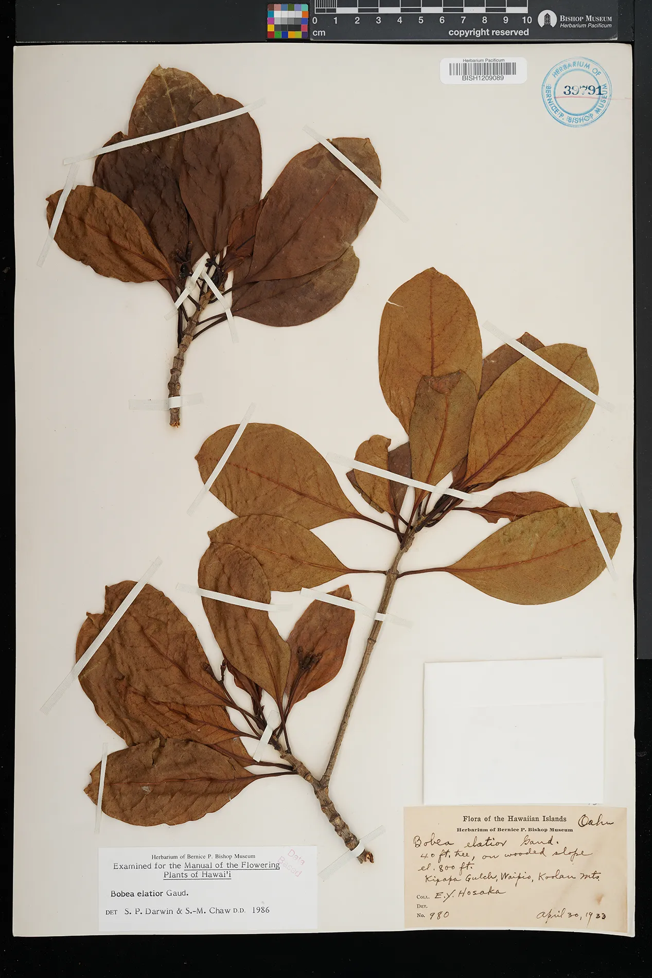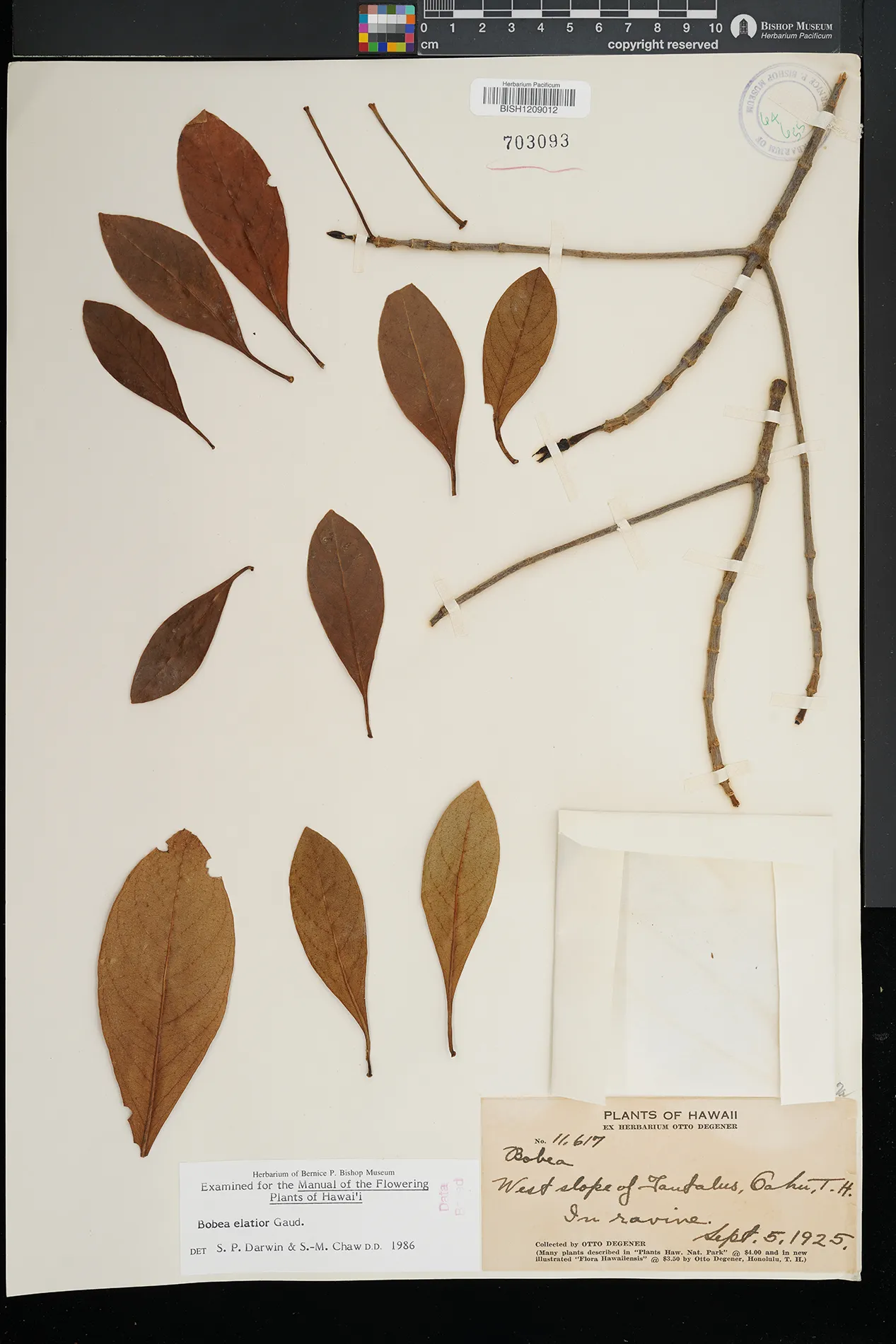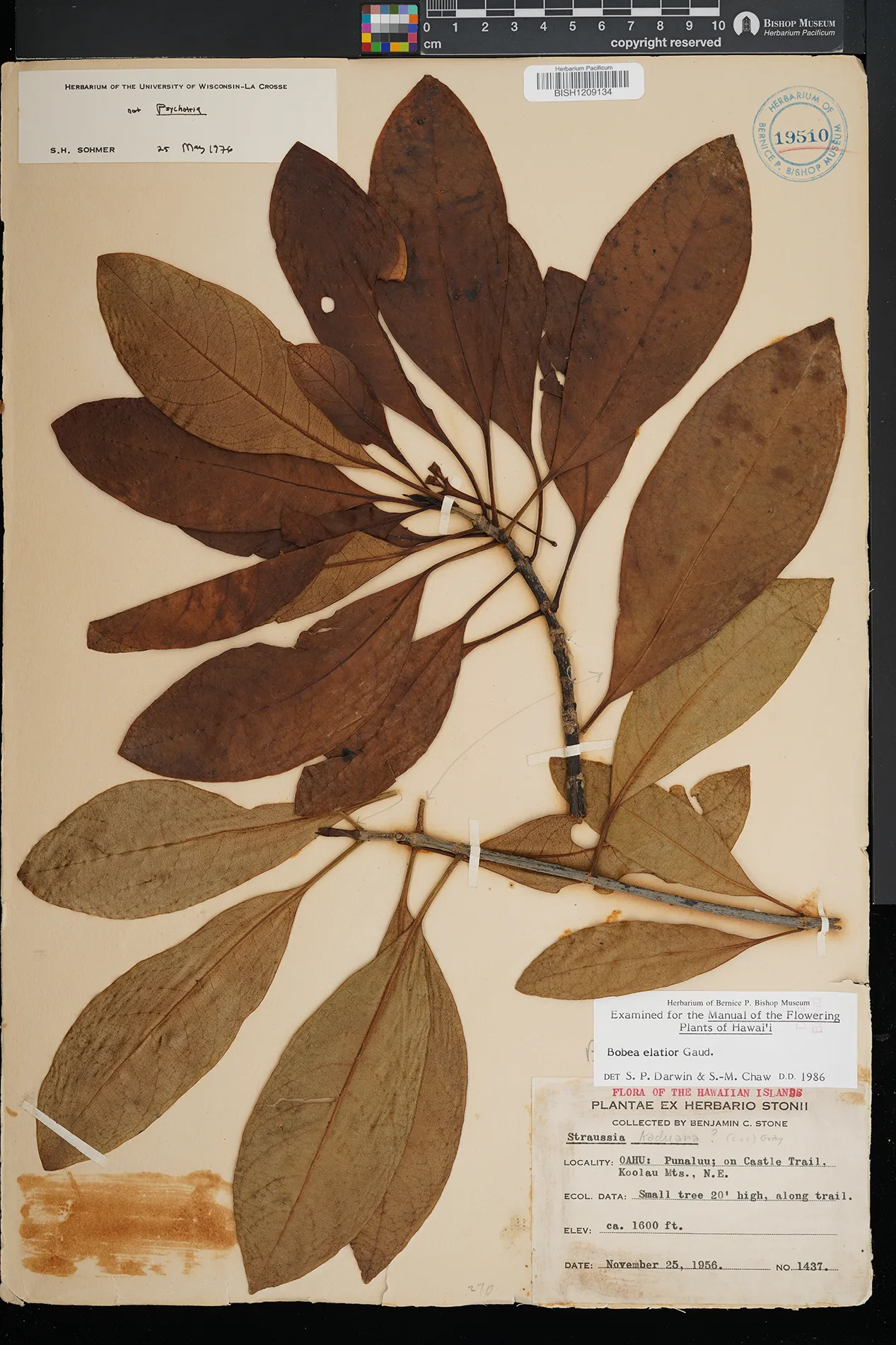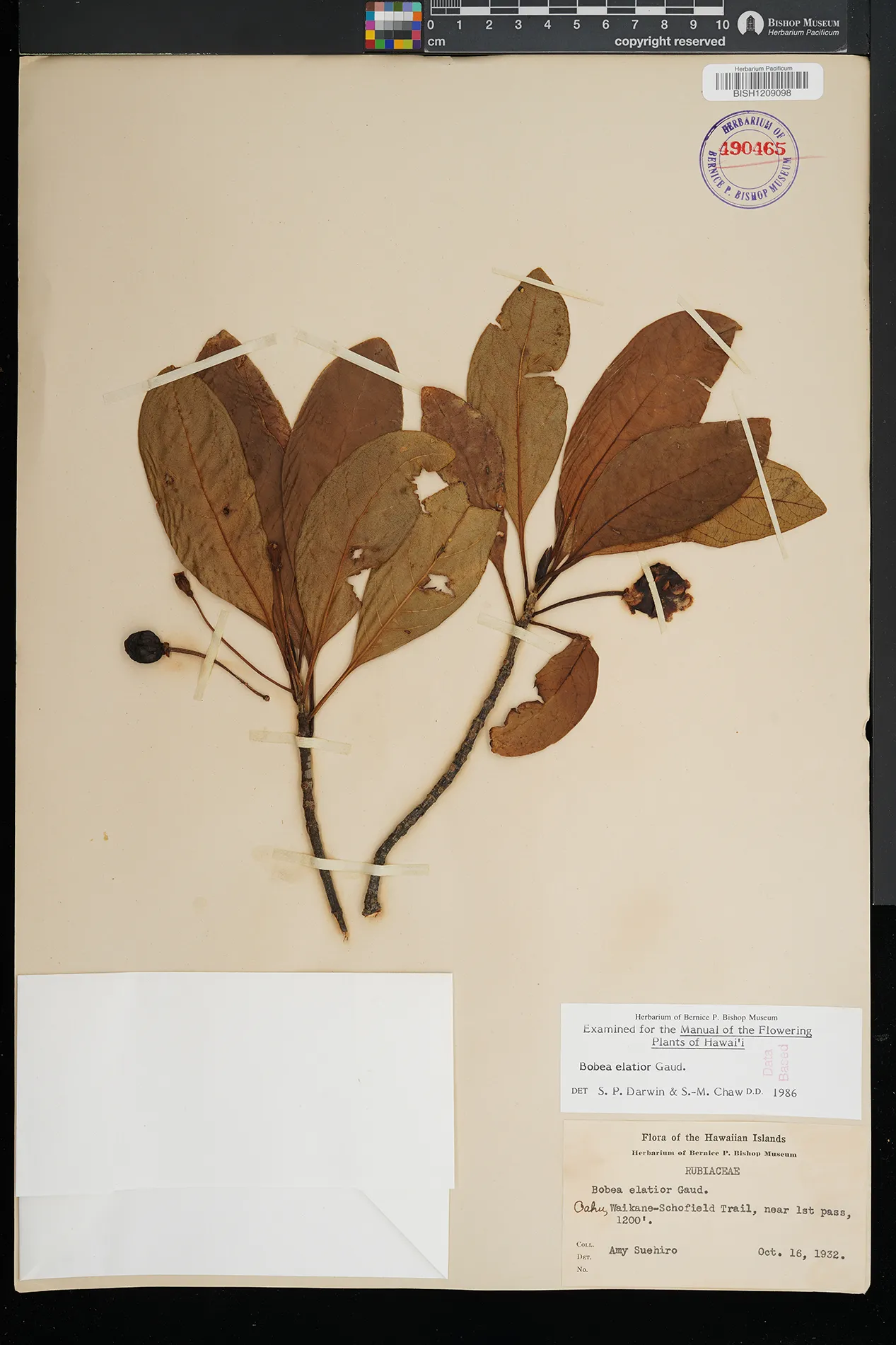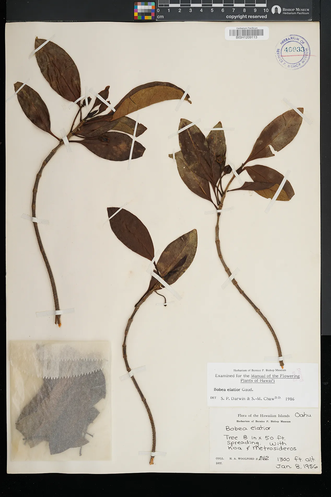 Leaves: Leaves simple. Opposite. Blades elliptic to obovate, (1.5–)3–15 cm long, (1–)4–5.5(–8) cm wide. Apex acute to obtuse. Base acute to long–attenuate. Surfaces usually glabrous, domatia somewhat elevated, porate, subglabrous, often scattered over blade, or sometimes absent chartaceous to subcoriaceous. Margins entire. Secondary veins 7–10 on each side of midrib, often reddish pellucid. Petioles (5–)10–25(–50) mm long, sometimes winged distally, glabrous. Stipules ovate to lanceolate, strongly imbricate in bud, 7–22 mm long, 4–9 mm wide, acute to acuminate, upper surface villous toward base, lower surface glabrous or slightly pubescent toward apex.