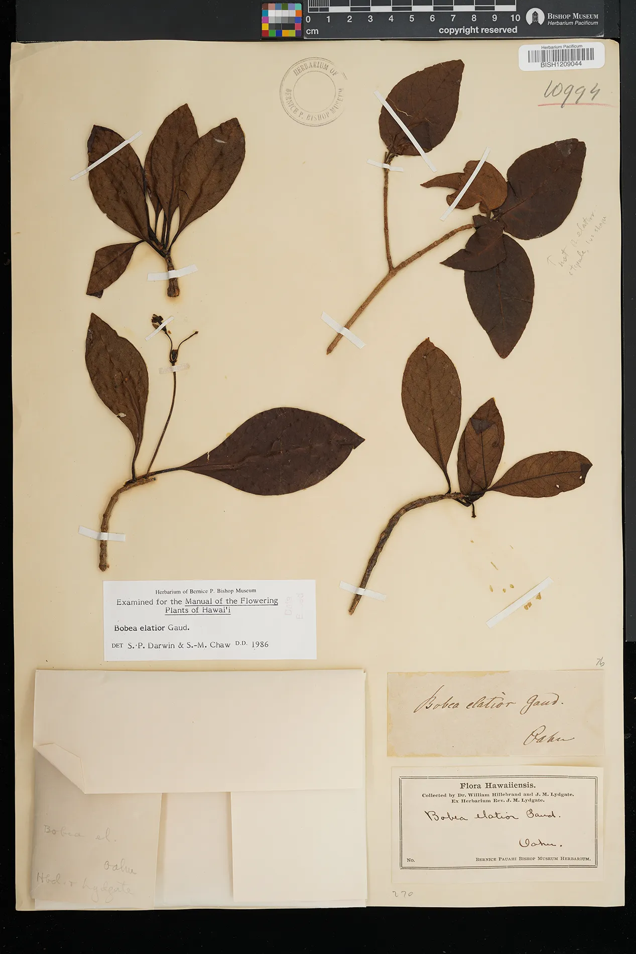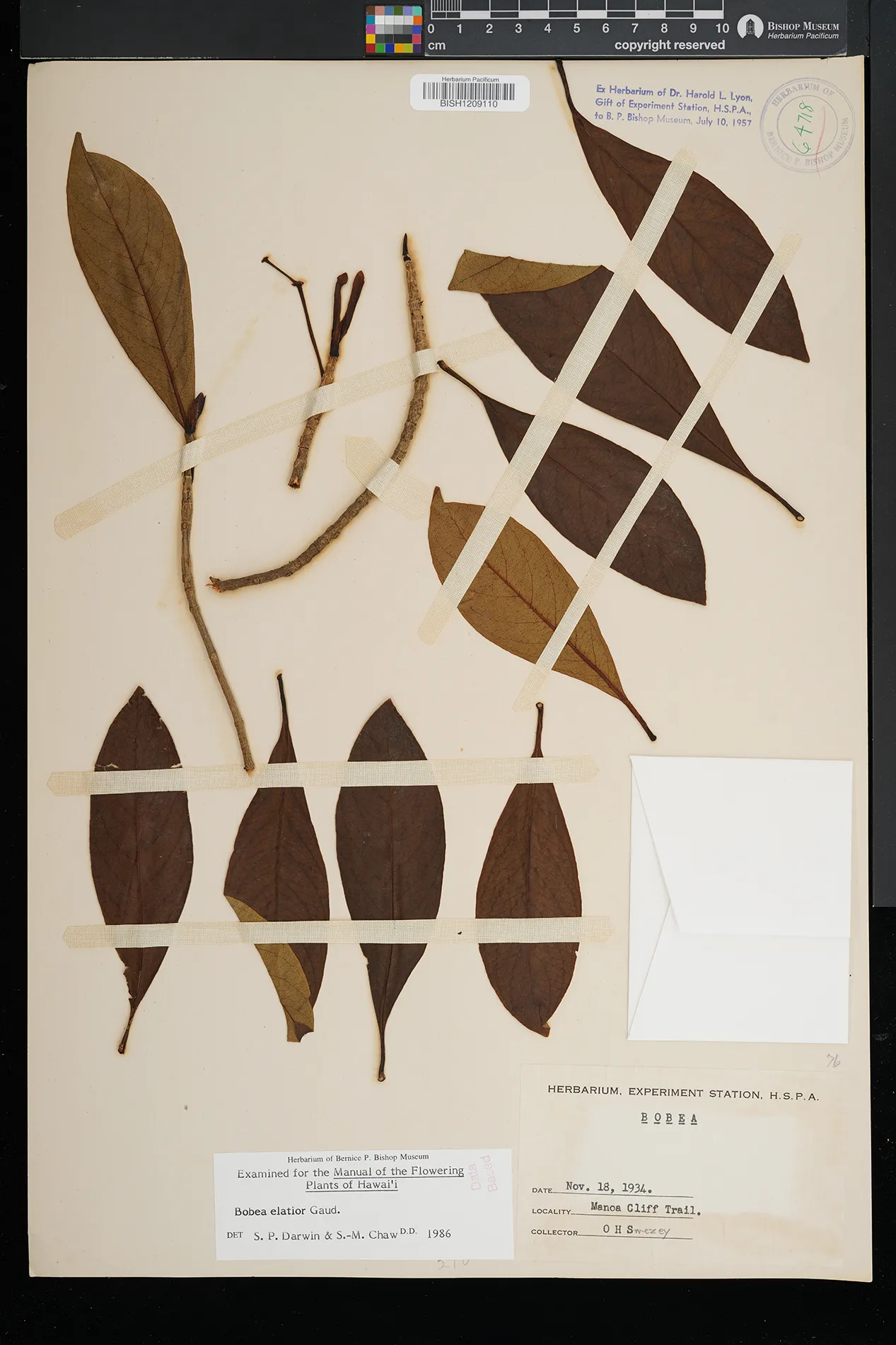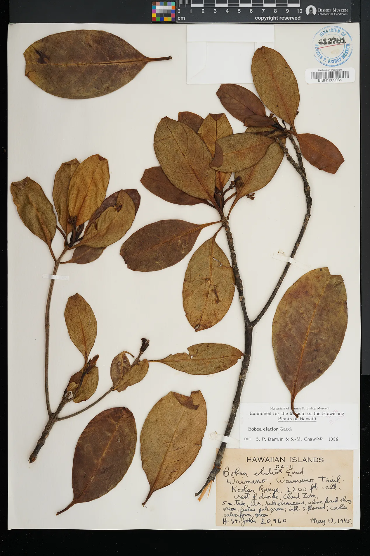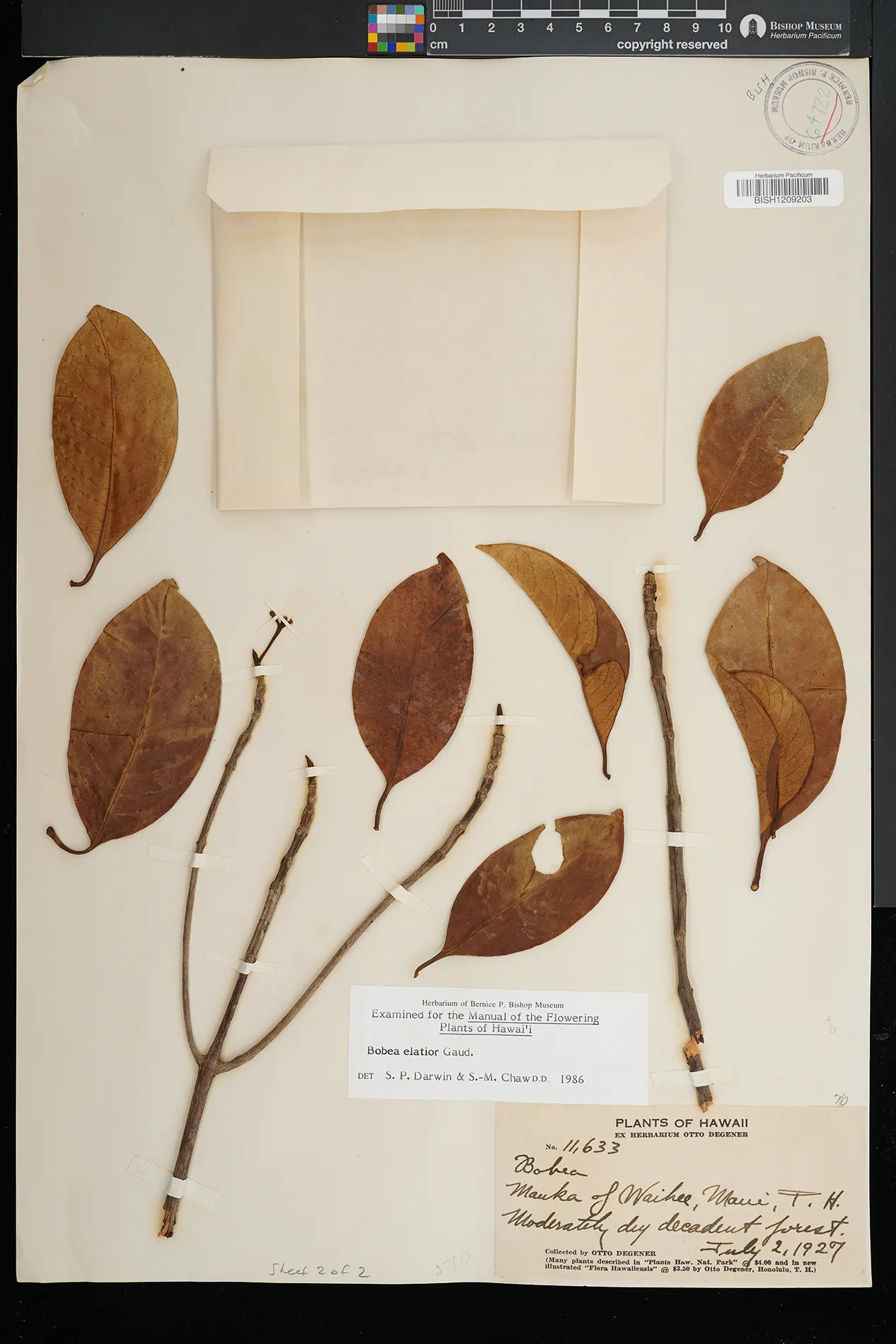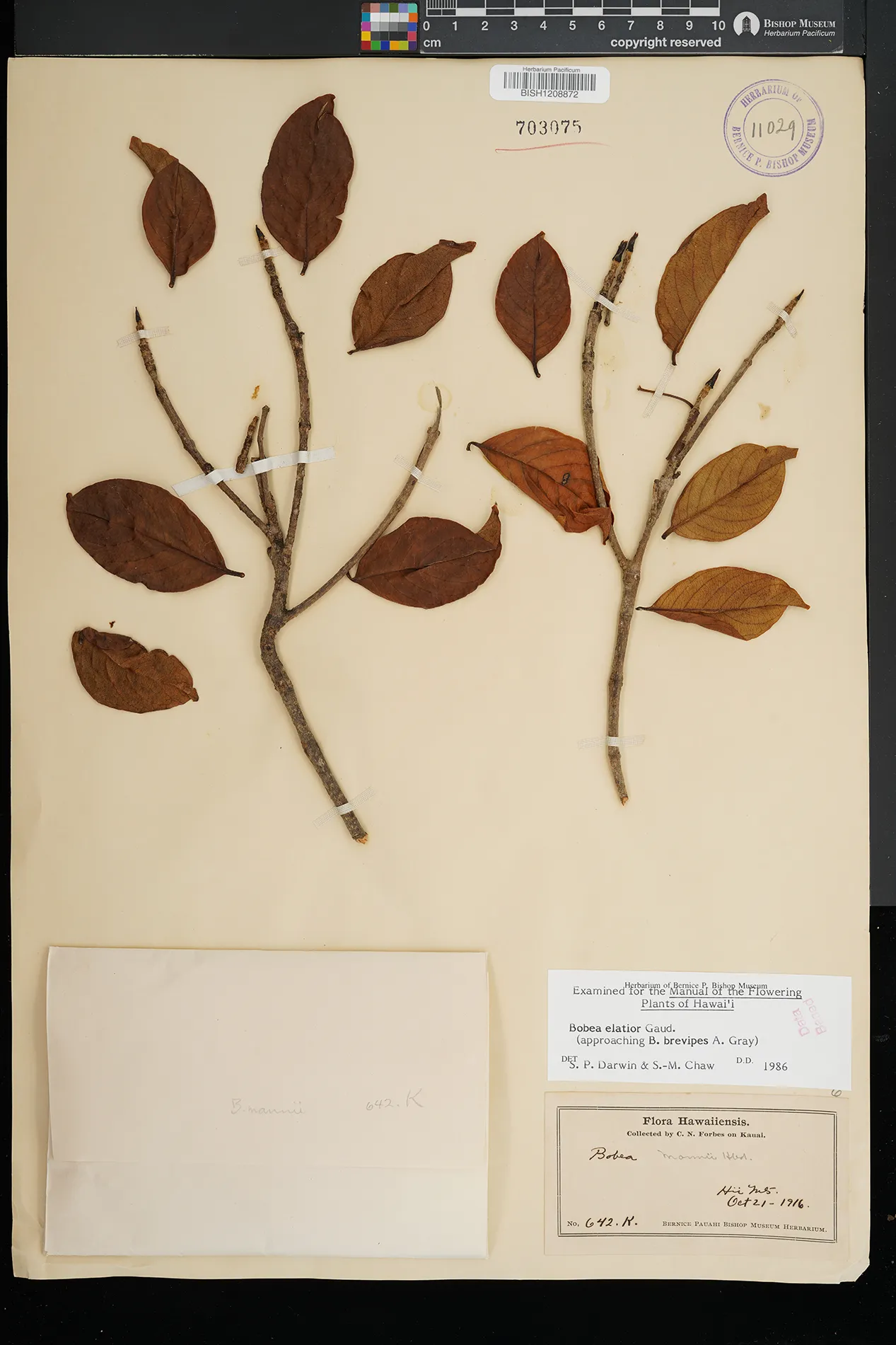 Leaves: Leaves simple. Opposite. Blades elliptic to obovate, (1.5–)3–15 cm long, (1–)4–5.5(–8) cm wide. Apex acute to obtuse. Base acute to long–attenuate. Surfaces usually glabrous, domatia somewhat elevated, porate, subglabrous, often scattered over blade, or sometimes absent chartaceous to subcoriaceous. Margins entire. Secondary veins 7–10 on each side of midrib, often reddish pellucid. Petioles (5–)10–25(–50) mm long, sometimes winged distally, glabrous. Stipules ovate to lanceolate, strongly imbricate in bud, 7–22 mm long, 4–9 mm wide, acute to acuminate, upper surface villous toward base, lower surface glabrous or slightly pubescent toward apex.