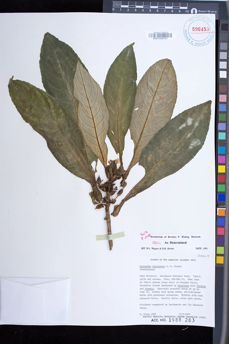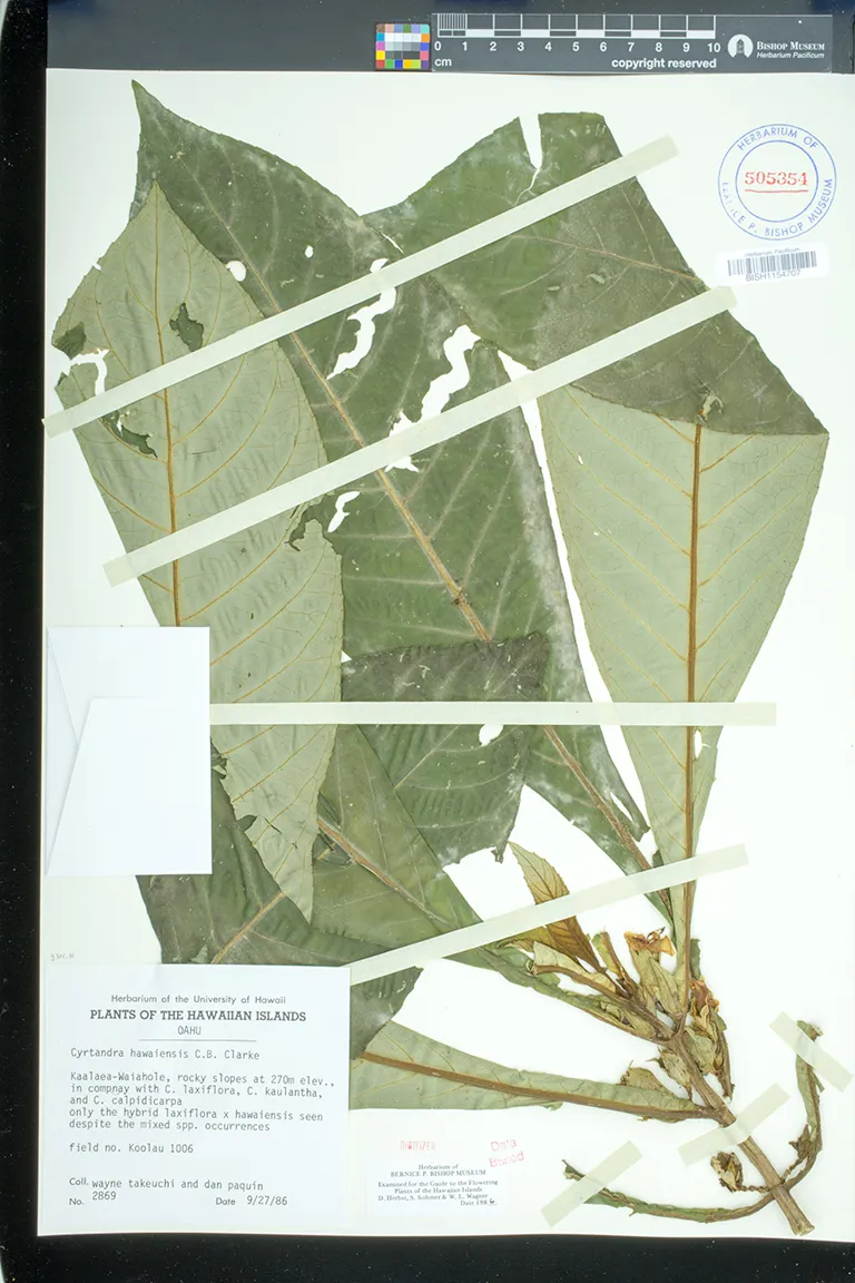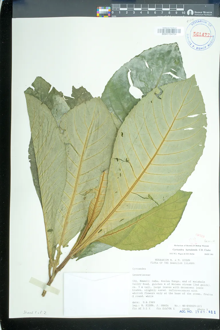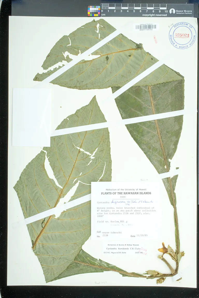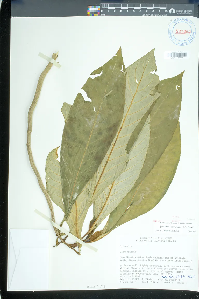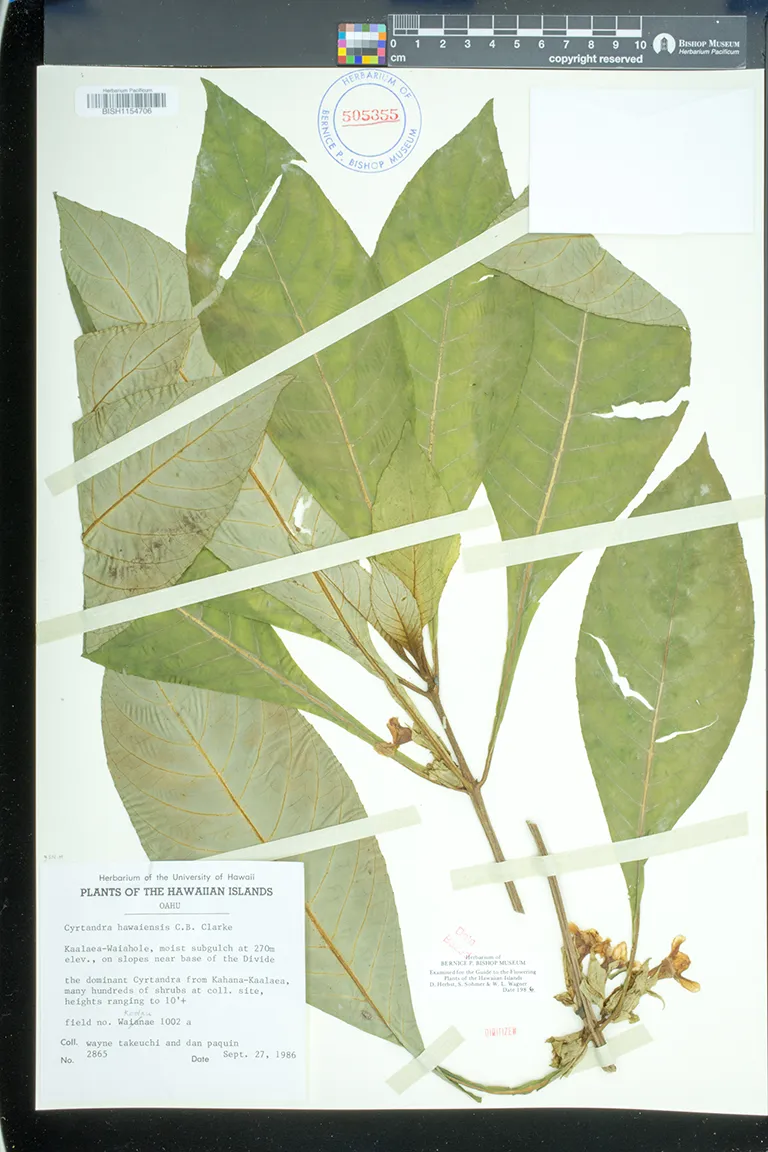 Dense wet forest, protected in sinkhole (large populations of Cyrtandra inside, virtually none outside). Native spp.: Metrosideros polymorpha, Cibotium spp., Psychotria hawaiiensis, Antidesma platyphyllum (Also Cyanea platyphylla population nearby outside of sinkhole). Naturalized spp.: Psidium cattleianum, Melastoma sanguinea. |