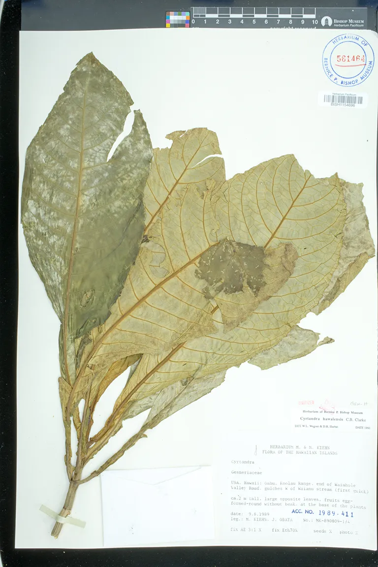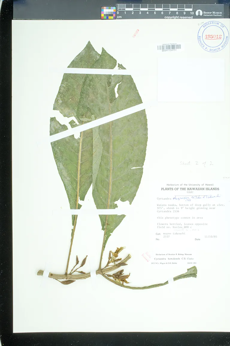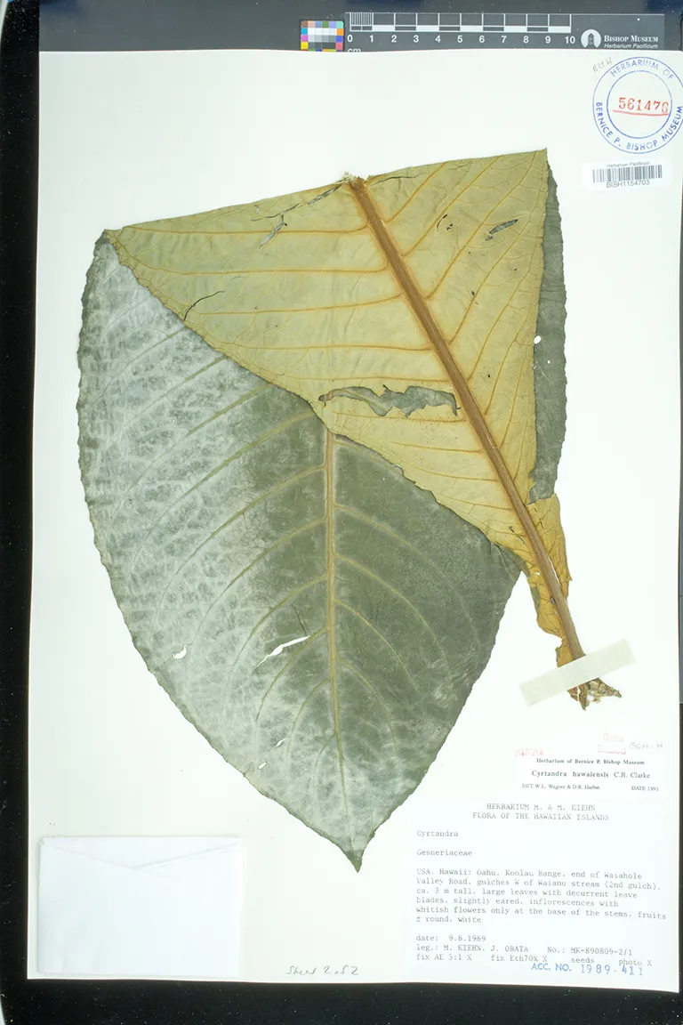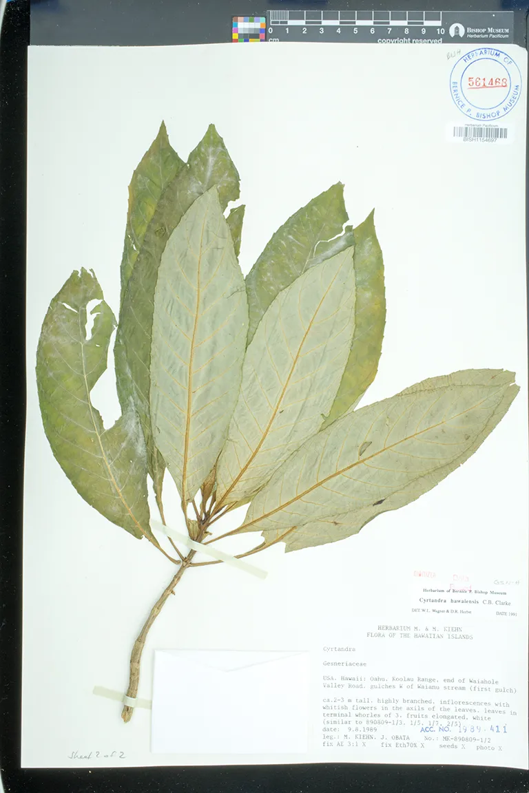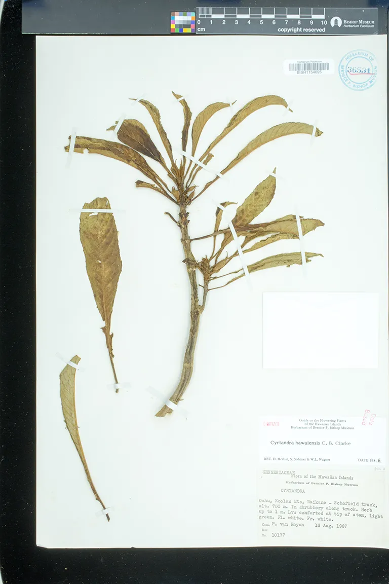 Dense wet forest, protected in sinkhole (large populations of Cyrtandra inside, virtually none outside). Native spp.: Metrosideros polymorpha, Cibotium spp., Psychotria hawaiiensis, Antidesma platyphyllum (Also Cyanea platyphylla population nearby outside of sinkhole). Naturalized spp.: Psidium cattleianum, Melastoma sanguinea. |
