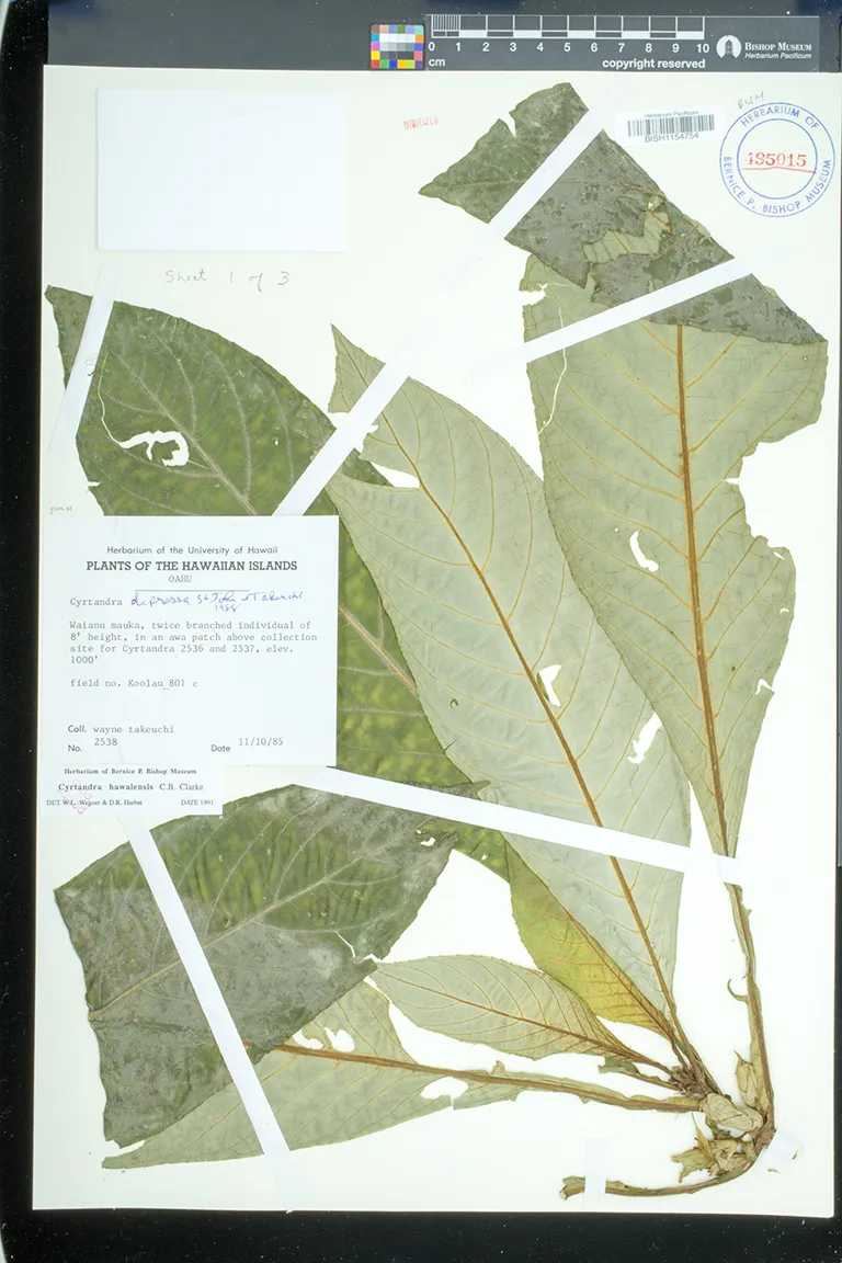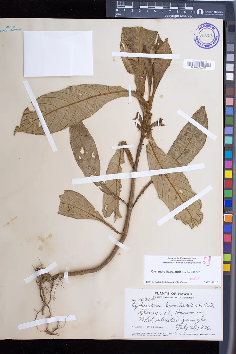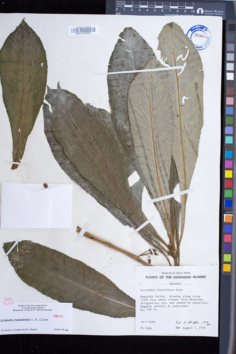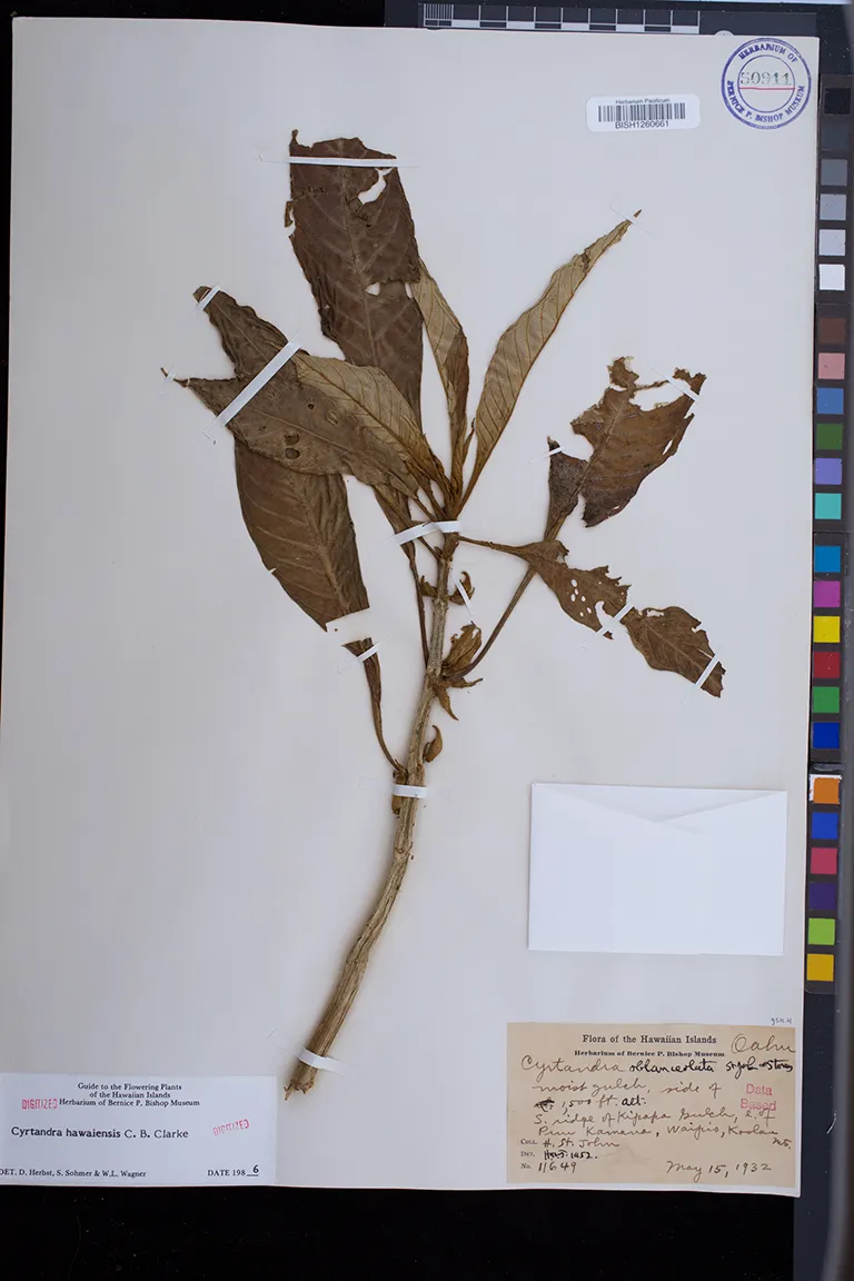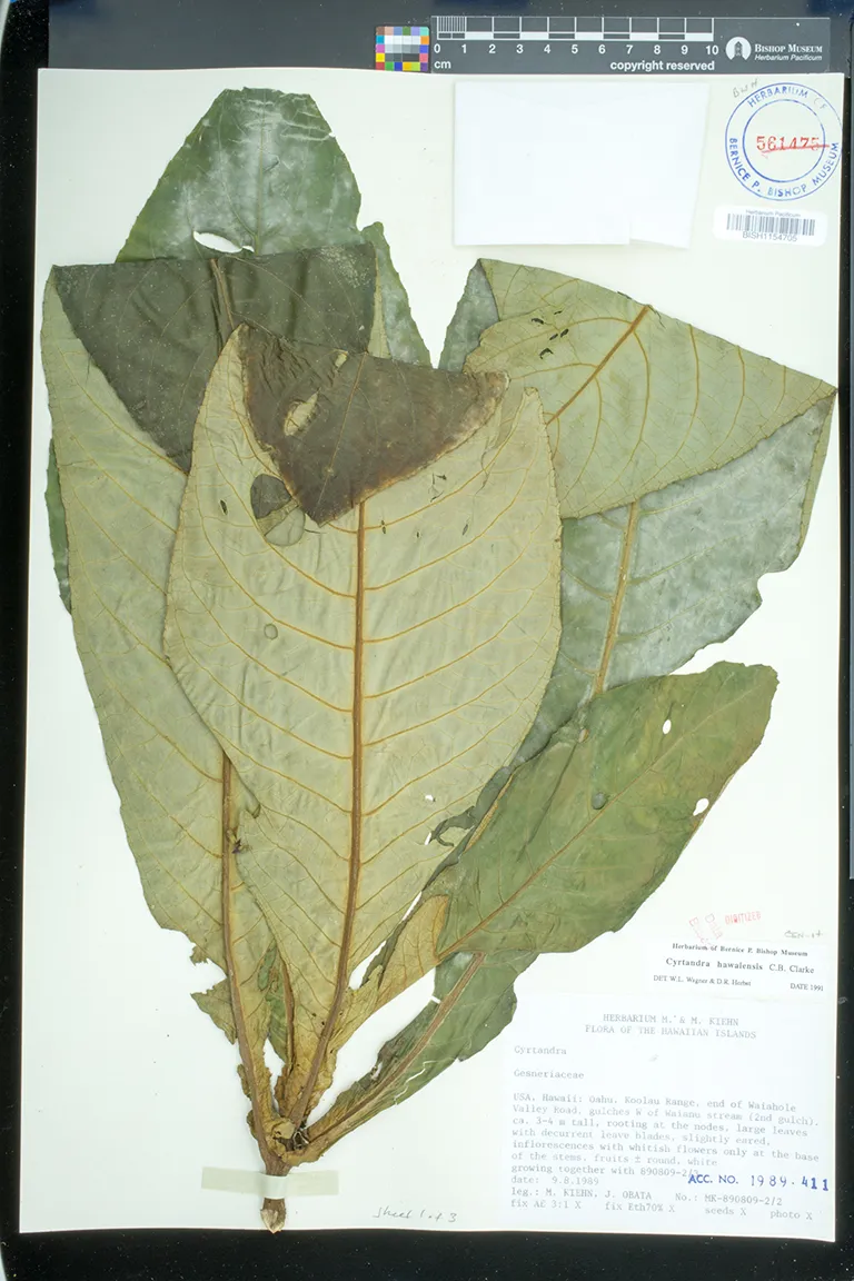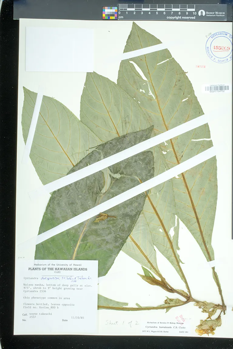 Dense wet forest, protected in sinkhole (large populations of Cyrtandra inside, virtually none outside). Native spp.: Metrosideros polymorpha, Cibotium spp., Psychotria hawaiiensis, Antidesma platyphyllum (Also Cyanea platyphylla population nearby outside of sinkhole). Naturalized spp.: Psidium cattleianum, Melastoma sanguinea. |