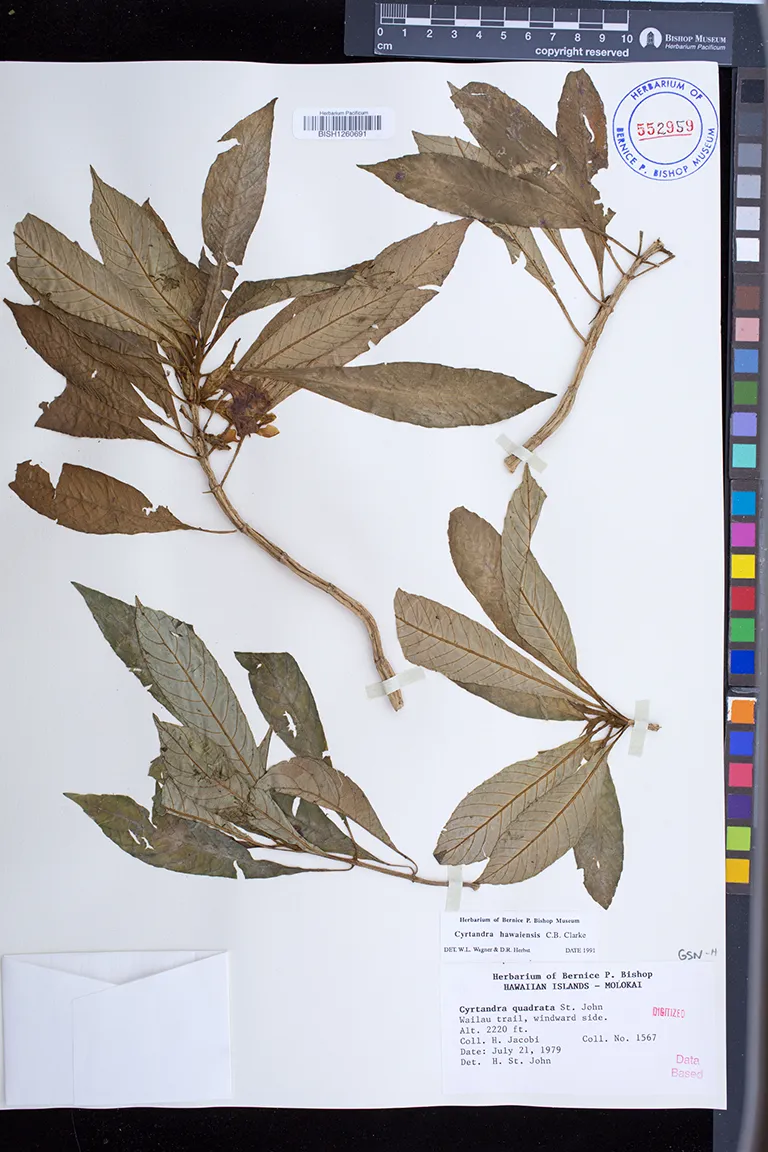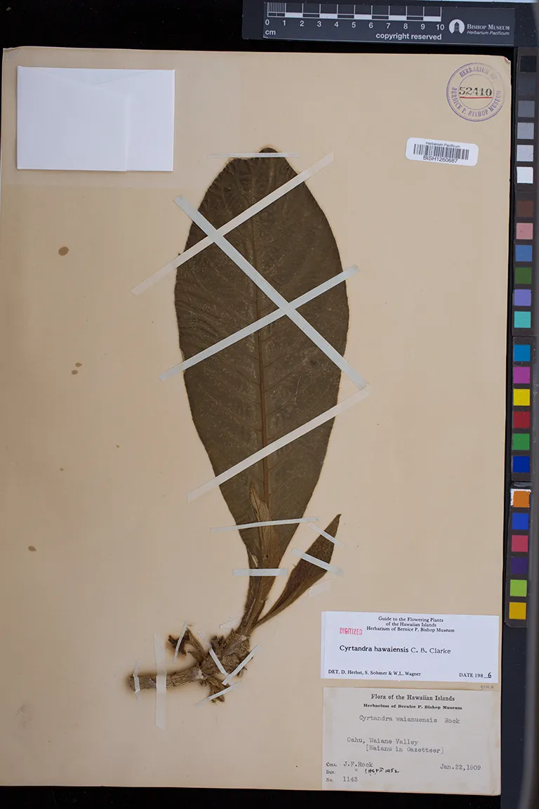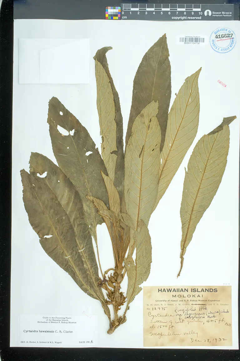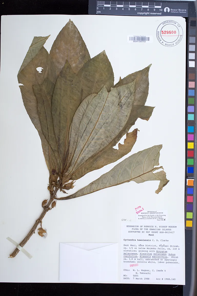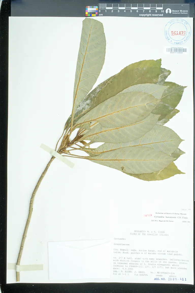 Dense wet forest, protected in sinkhole (large populations of Cyrtandra inside, virtually none outside). Native spp.: Metrosideros polymorpha, Cibotium spp., Psychotria hawaiiensis, Antidesma platyphyllum (Also Cyanea platyphylla population nearby outside of sinkhole). Naturalized spp.: Psidium cattleianum, Melastoma sanguinea. |