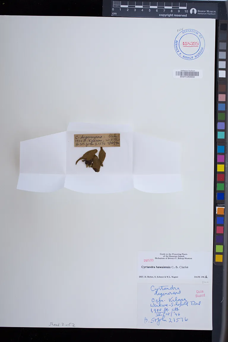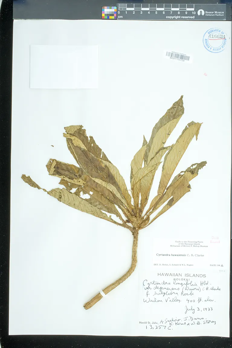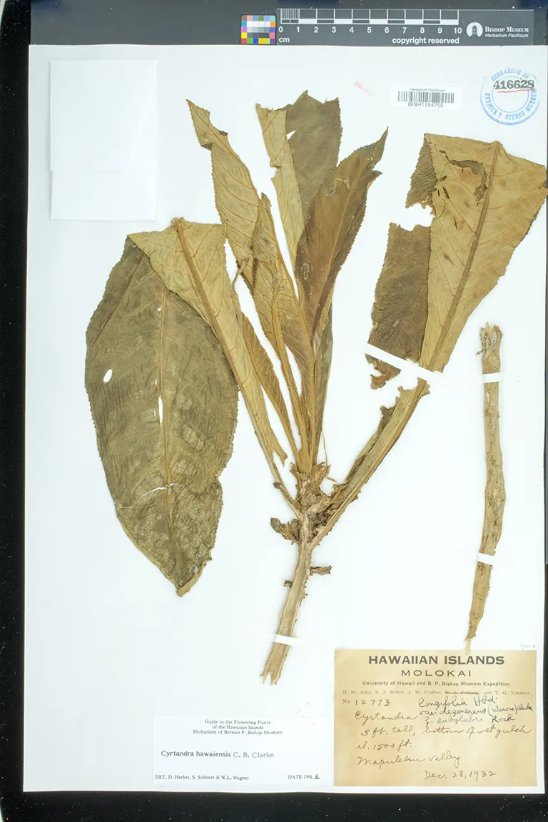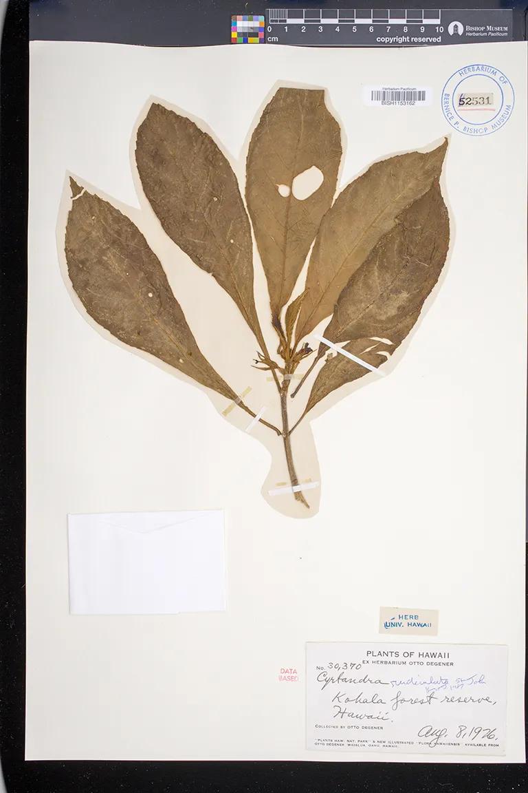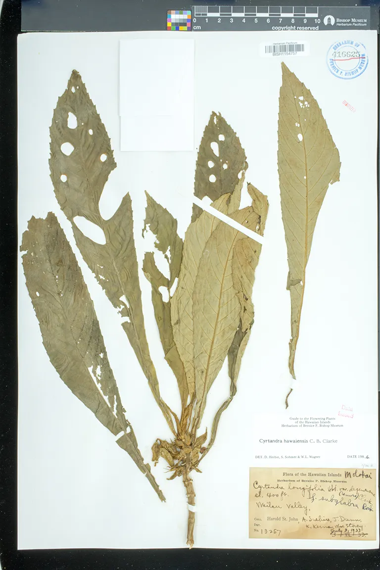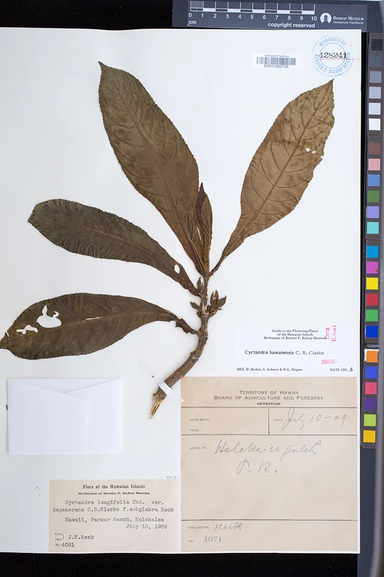Dense wet forest, protected in sinkhole (large populations of Cyrtandra inside, virtually none outside). Native spp.: Metrosideros polymorpha, Cibotium spp., Psychotria hawaiiensis, Antidesma platyphyllum (Also Cyanea platyphylla population nearby outside of sinkhole). Naturalized spp.: Psidium cattleianum, Melastoma sanguinea. |