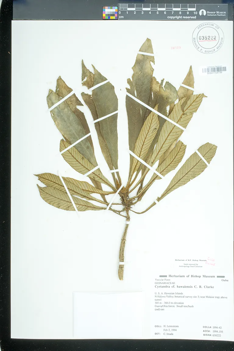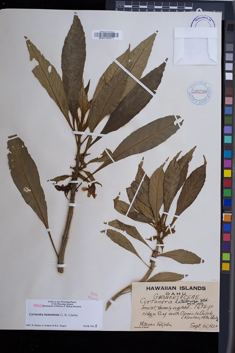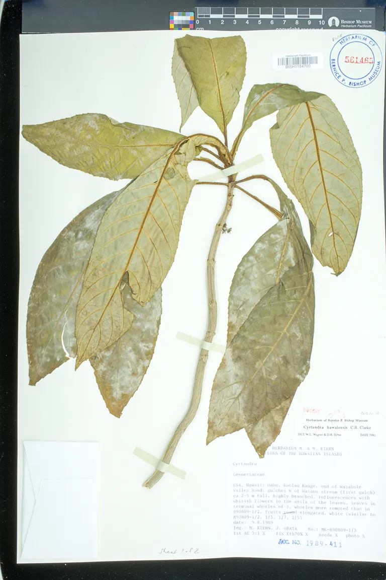 Vegetation: Metrosideros, Cheirodendron, Dicranopteris, Diplopterygium, Clidemia, Cyrtandra, Broussaisia, Cibotium, Vandenboschia, Asplenium, Dryopteris, Clermontia, Carex, Athyrium, Kadua, Psidium, Youngia, Ageratum, Ageratina, Diplazium, Peperomia. |
