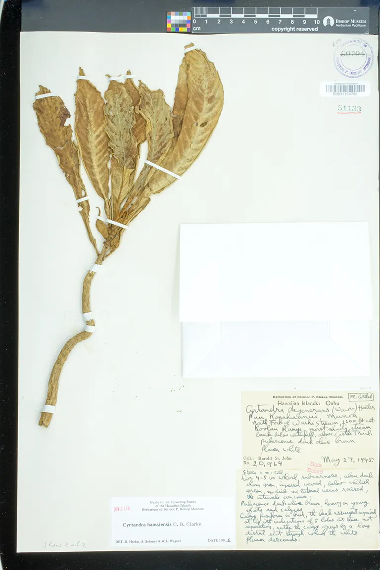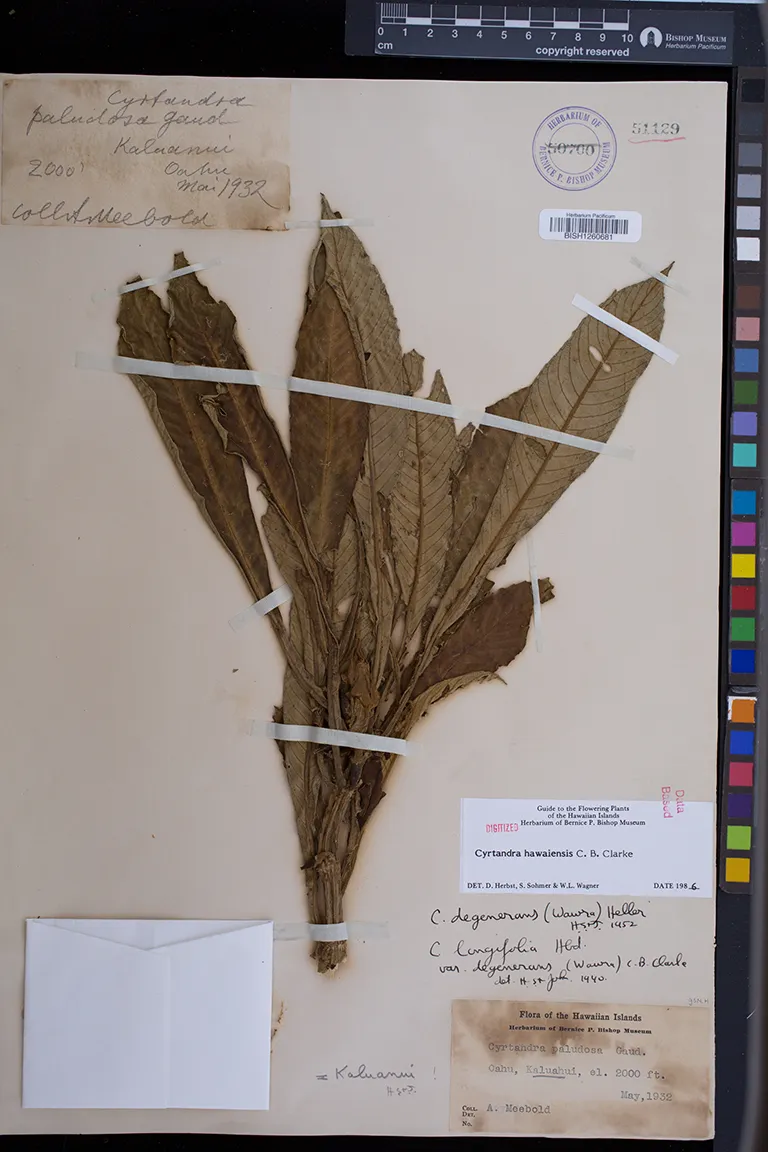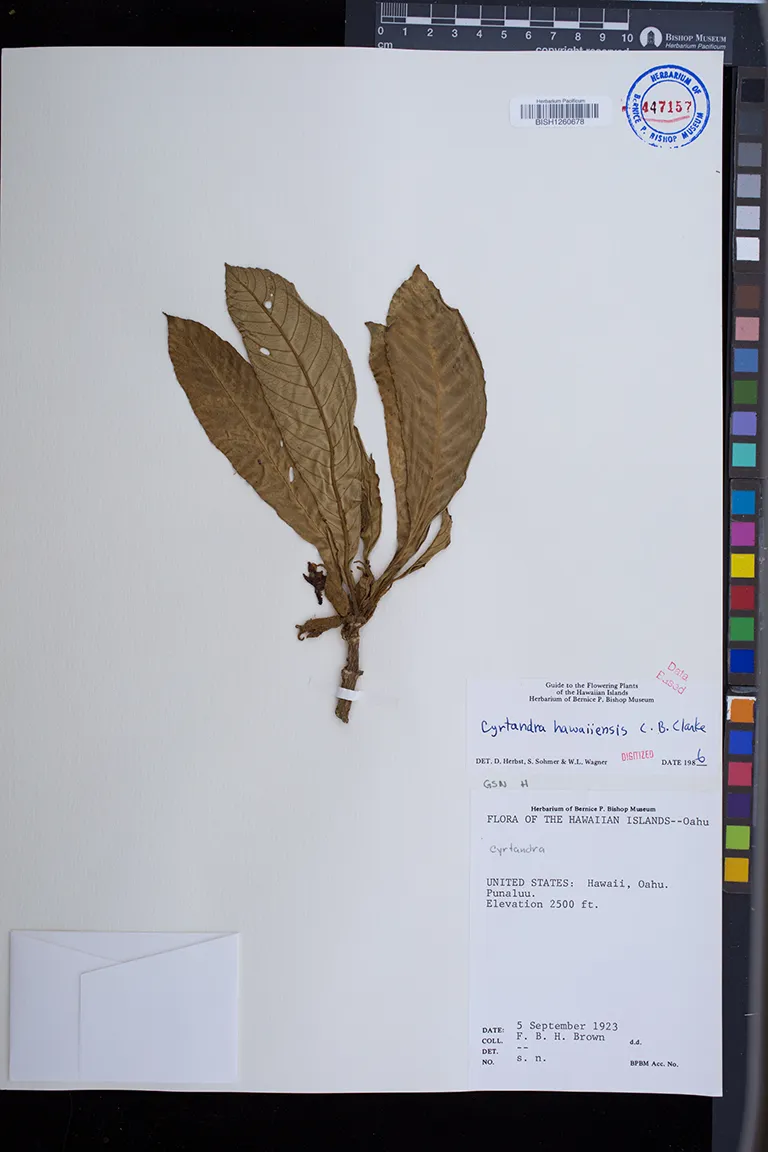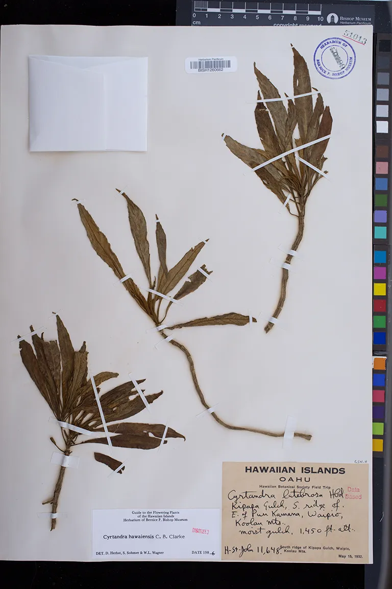 Vegetation: Metrosideros, Cheirodendron, Dicranopteris, Diplopterygium, Clidemia, Cyrtandra, Broussaisia, Cibotium, Vandenboschia, Asplenium, Dryopteris, Clermontia, Carex, Athyrium, Kadua, Psidium, Youngia, Ageratum, Ageratina, Diplazium, Peperomia. |
