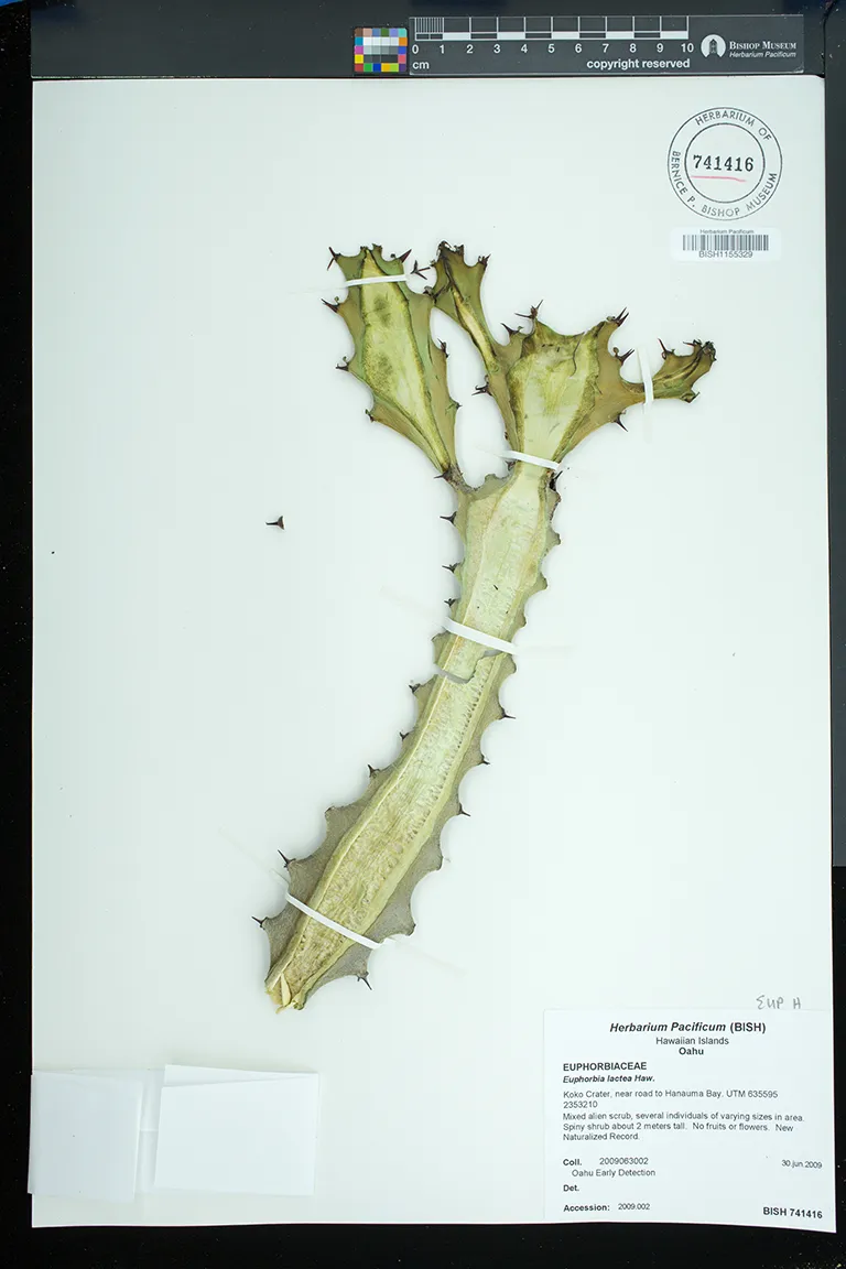 | 4 | Euphorbia lactea | Haw. | Koko Crater, near road to Hanauma Bay. UTM 635595 2353210 | Mixed alien scrub, several individuals of varying sizes in area. | PRESERVED_SPECIMEN | OED | 2009063002 | Oahu | BISH | 6/30/2009 |