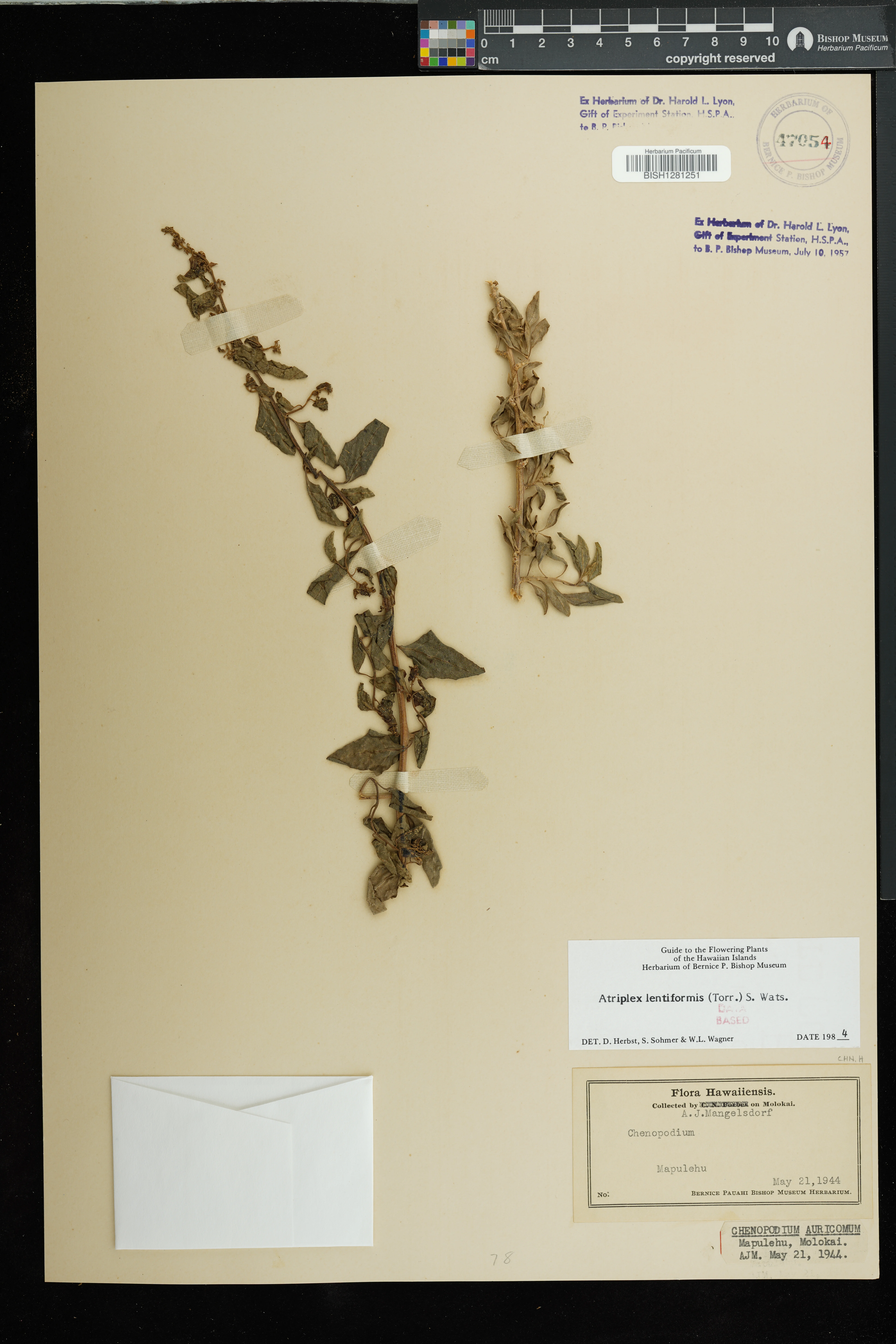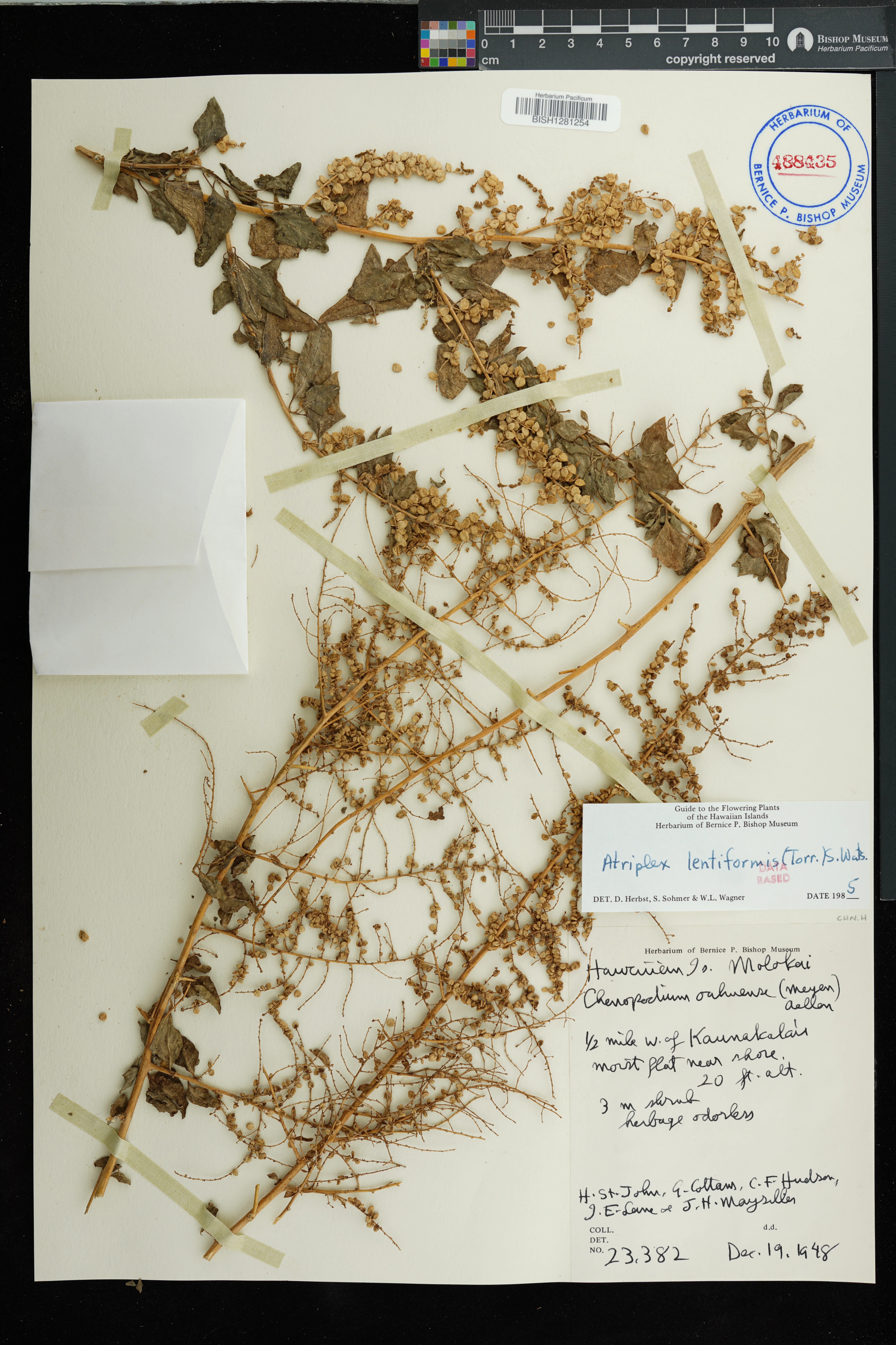 | 2 | Atriplex lentiformis | (Torr.) S.Watson | along highway, near airport | arid Prosopis area | PRESERVED_SPECIMEN | Herbst, D.R. | 1895 | Molokai | BISH | 8/7/1970 |