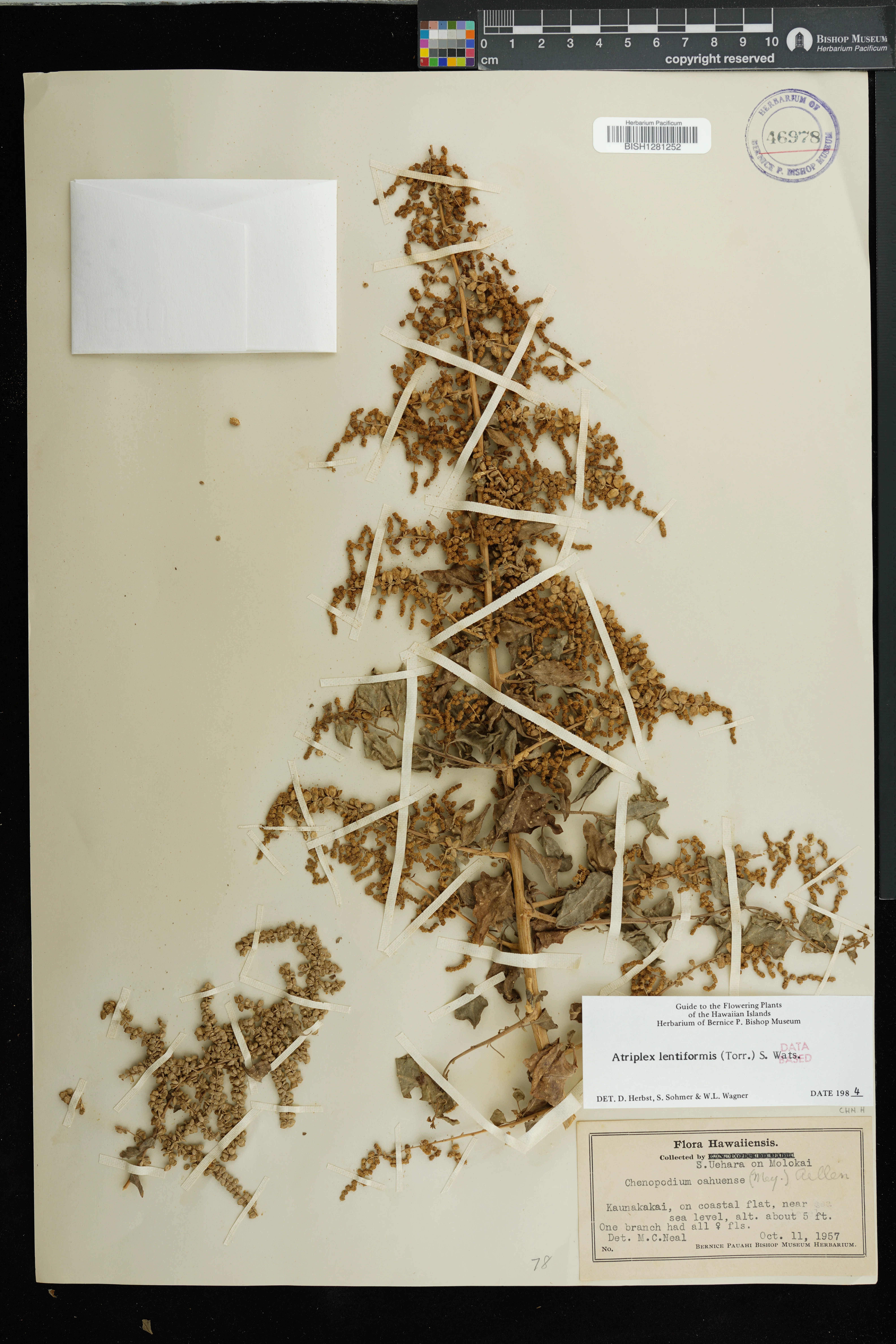 | 6 | Atriplex lentiformis | (Torr.) S.Watson | kaunakakai | edge of Prosopis thicket | PRESERVED_SPECIMEN | herbst, d.r. spence, g. | collector number: 5098 | Molokai | BISH | 11/12/1974 |