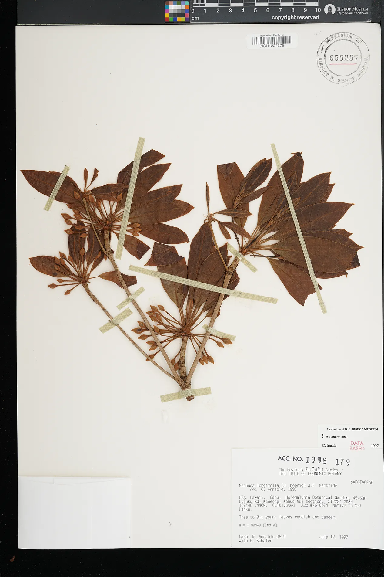 | 5 | Madhuca longifolia | (J.Koenig ex L.) J.F.Macbr. | Hoomaluhia Botanical Garden, 45-680 Luluku Rd. Kaneohe, Kahua Nui section | PRESERVED_SPECIMEN | Annable, C.R. | 3619 | Oahu | BISH | 7/12/1997 | |