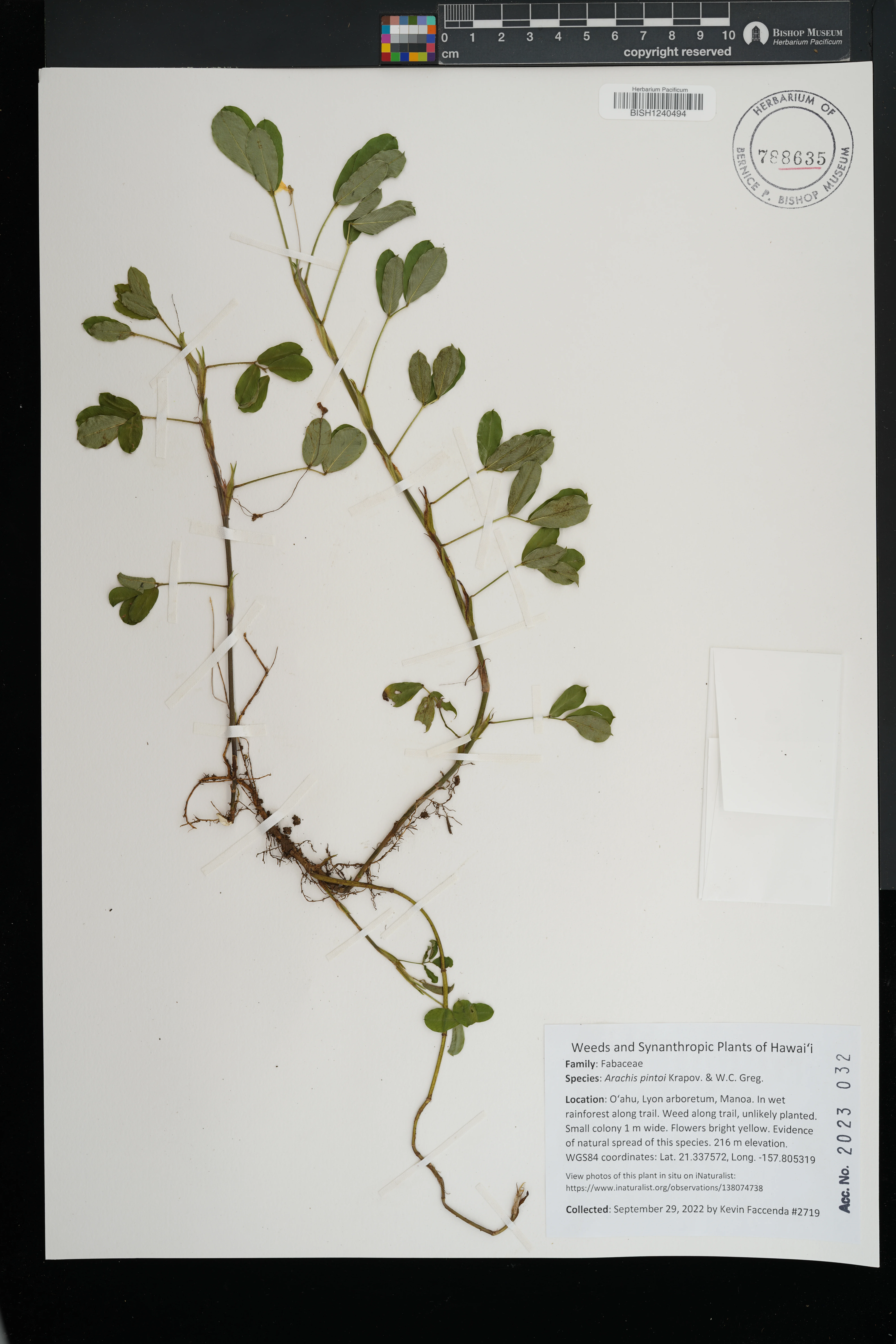 | 10 | Arachis pintoi | Krapov. & W.C.Greg. | Koolaupoko distr., Waimanalo, Kakaina St. | Vacant lot, growing on piles of red clay topsoil among weeds and grasses. | PRESERVED_SPECIMEN | Staples, G. | 1224 | Oahu | BISH | 2/17/2005 |