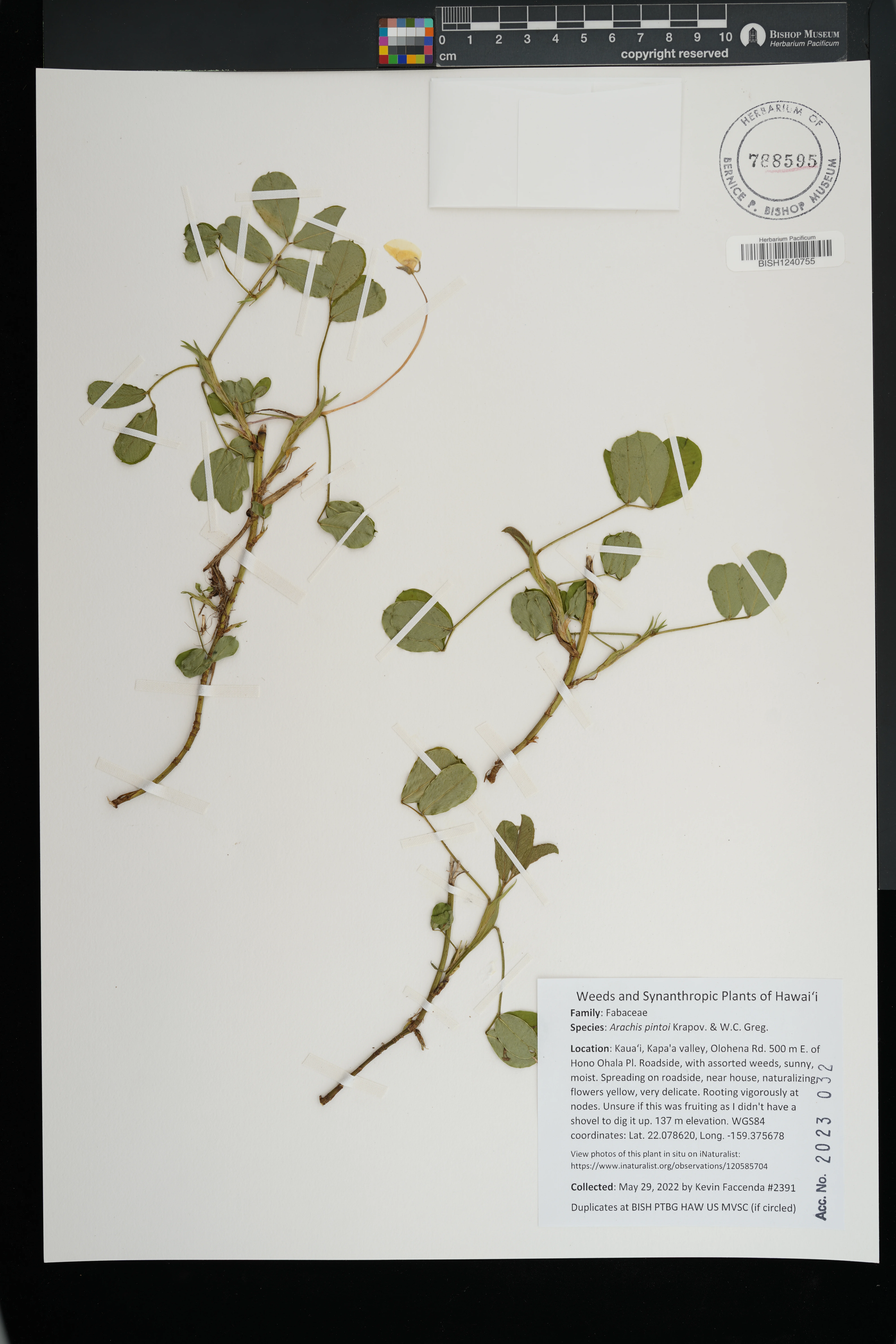 | 5 | Arachis pintoi | Krapov. & W.C.Greg. | koloa, n.t.b.g.'s visitor center | groundcover around parking lot | PRESERVED_SPECIMEN | flynn, t. stone, a. | collector number: 6740 | Kauai | BISH | 9/12/2000 |