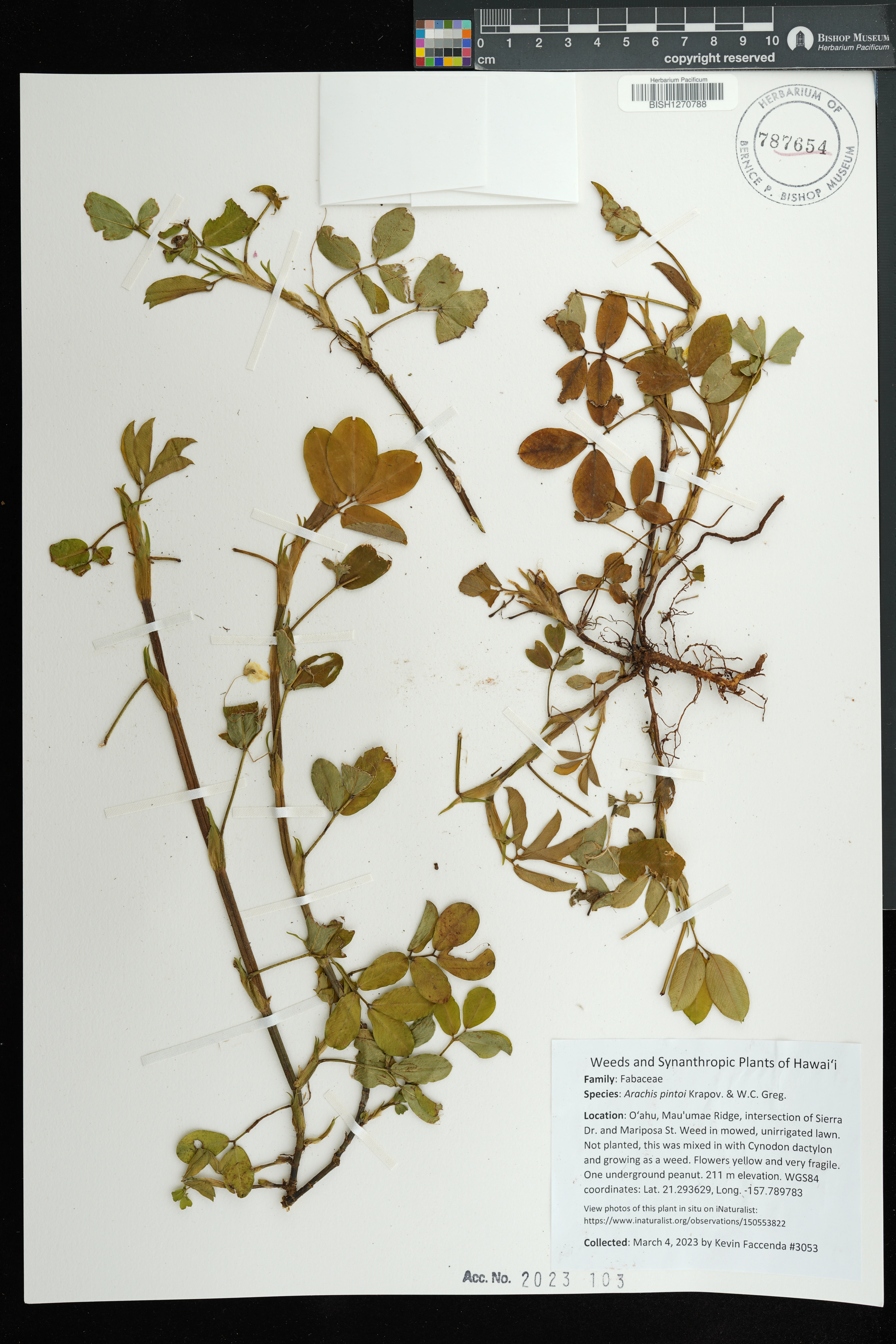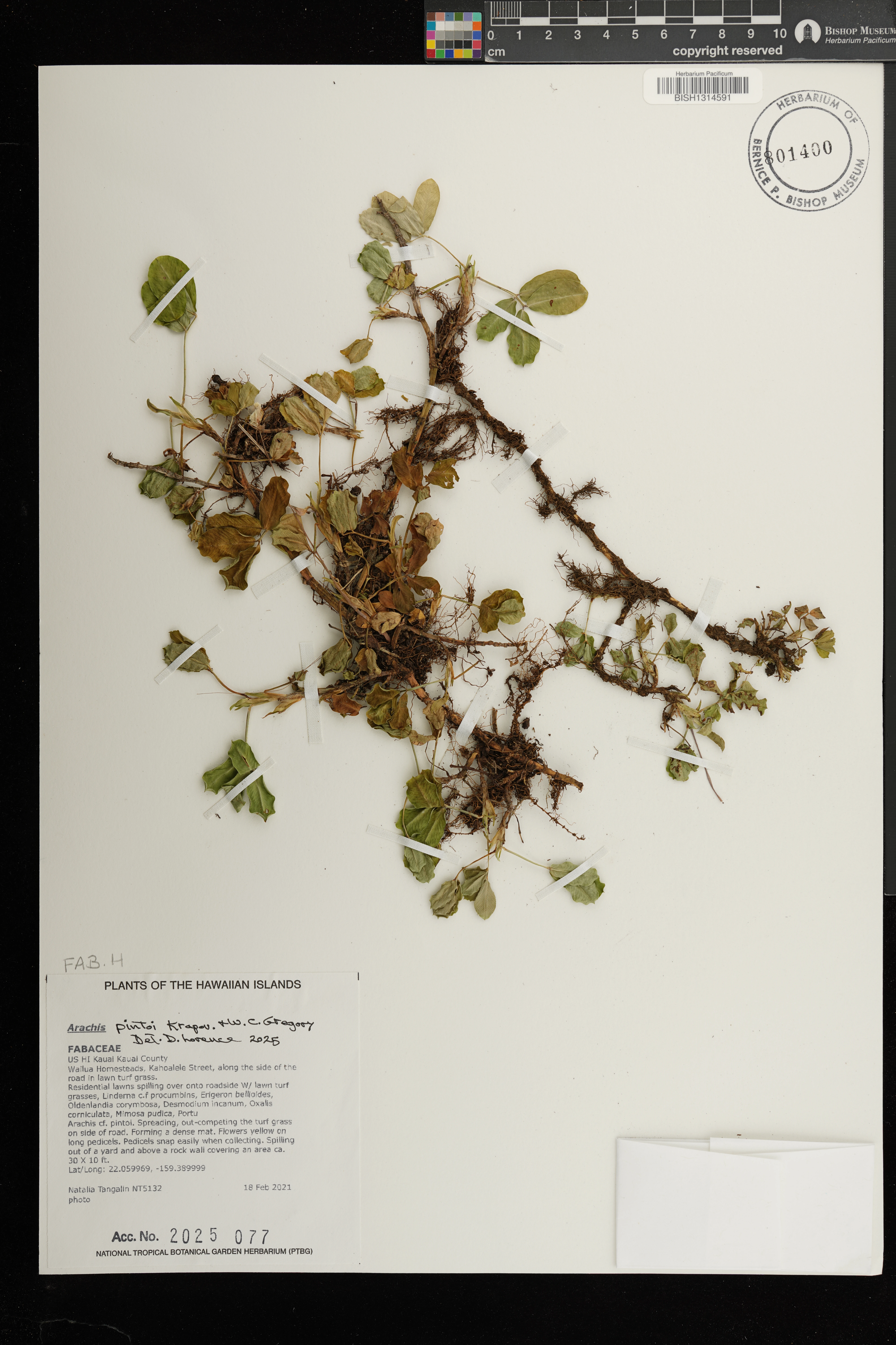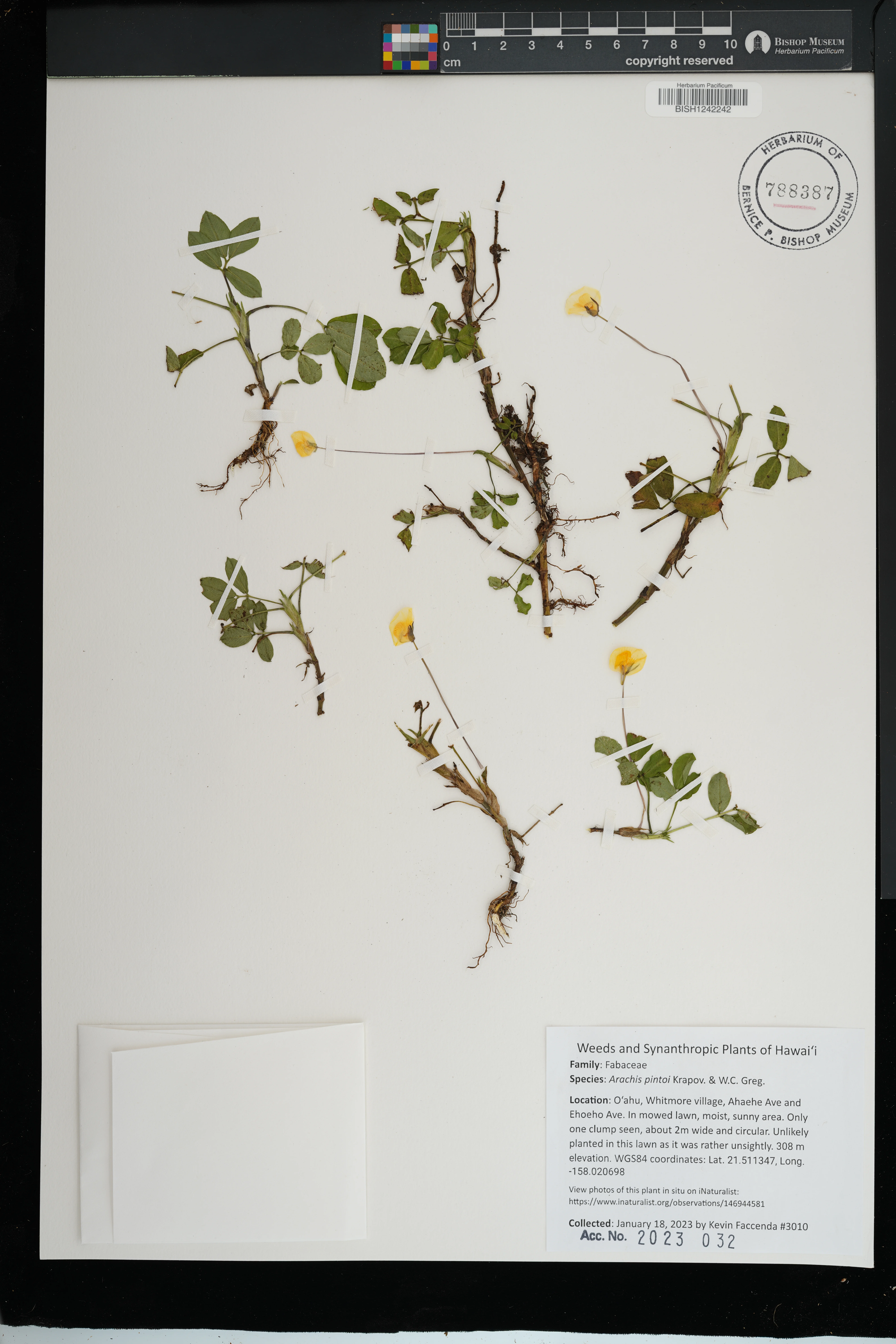 | 6 | Arachis pintoi | Krapov. & W.C.Greg. | koolaupoko distr., waimanalo, kakaina st. | Vacant lot, growing on piles of red clay topsoil among weeds and grasses. | PRESERVED_SPECIMEN | staples, g.w. | collector number: 1224 | Oahu | BISH | 2/17/2005 |