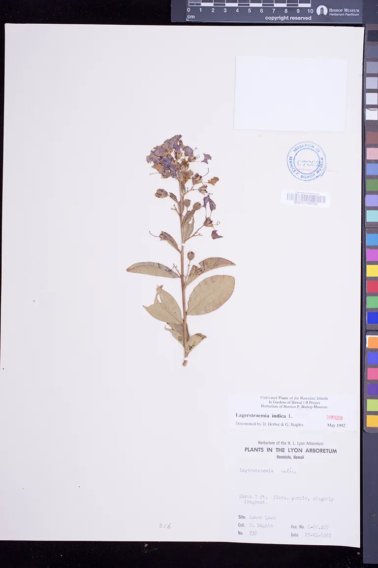 | 9 | Lagerstroemia indica | L. | Lyon Arboretum, Lower Lawn | PRESERVED_SPECIMEN | Nagata, K.M. | 238 | Oahu | BISH | 6/27/1967 | |