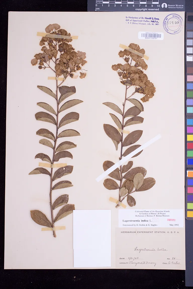 | 14 | Lagerstroemia indica | L. | Vineyard St. Nursery | PRESERVED_SPECIMEN | Forbes, A. | 24 | Oahu | BISH | 7/31/1929 |