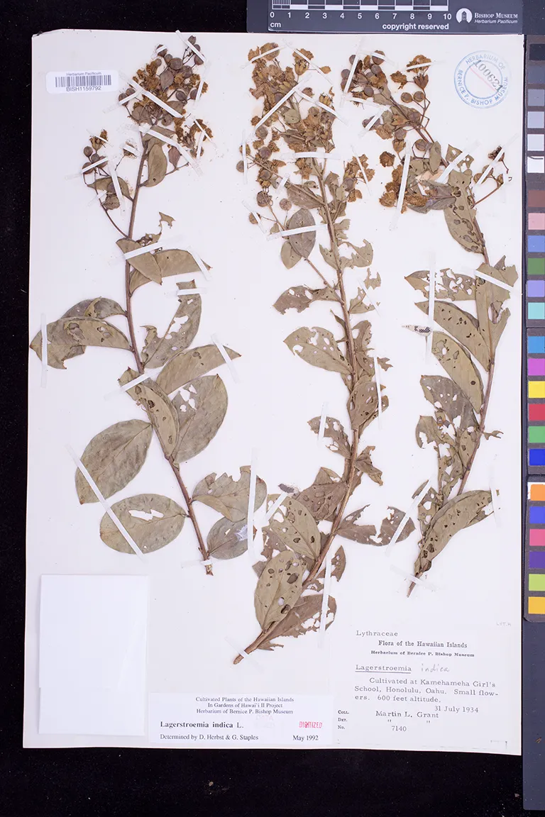 | 5 | Lagerstroemia indica | L. | kamehameha girls' school, honolulu | PRESERVED_SPECIMEN | grant, m.l. | collector number: 7140 | Oahu | BISH | 7/31/1934 | |