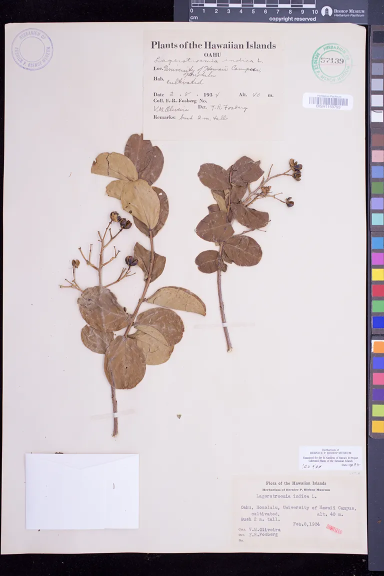 | 12 | Lagerstroemia indica | L. | UH Campus, Honolulu | PRESERVED_SPECIMEN | Oliveira, V.M. | s.n. | Oahu | BISH | 2/8/1934 | |