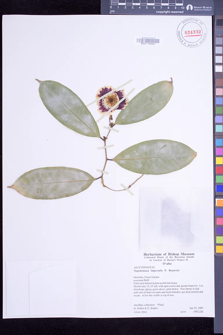 | 10 | Napoleonaea imperialis | P.Beauv. | honolulu; foster garden. cultivated behind hybrid orchid lath house | PRESERVED_SPECIMEN | herbst, d.r. staples, g. | collector number: 9594 | Oahu | BISH | 6/25/1992 | |