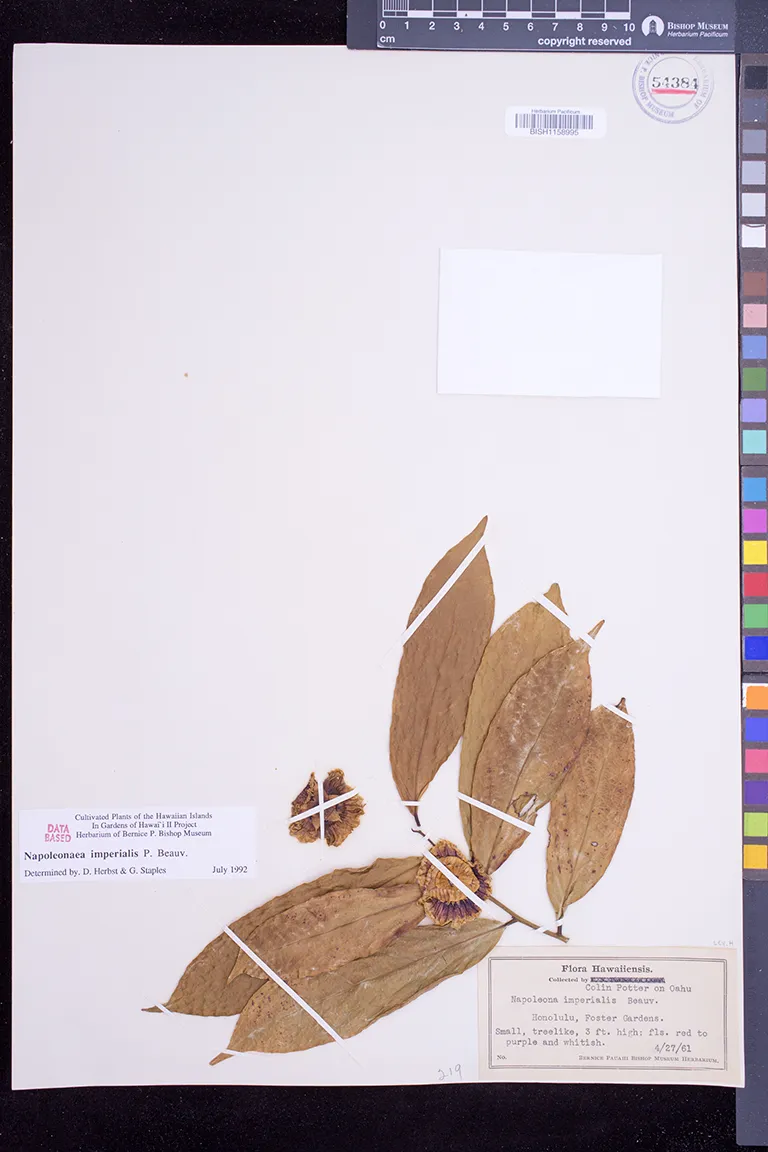 | 1 | Napoleonaea imperialis | P.Beauv. | honolulu; foster botanical garden | PRESERVED_SPECIMEN | miller, j.s. merello, m. | collector number: 7857 | Oahu | BISH | 7/30/1992 | |